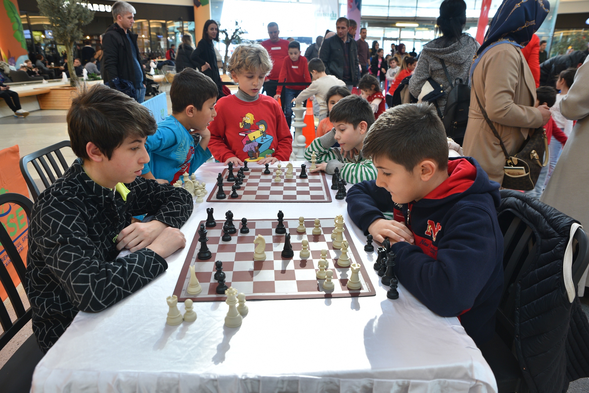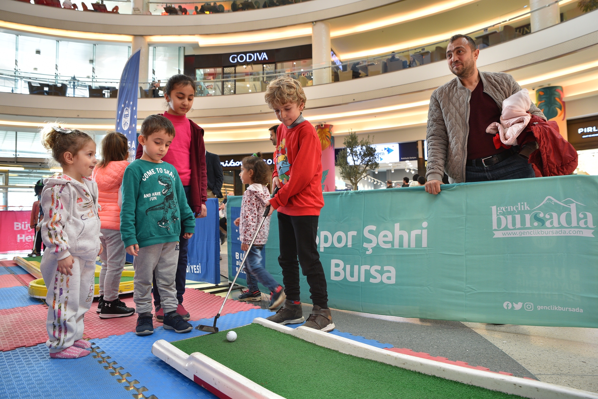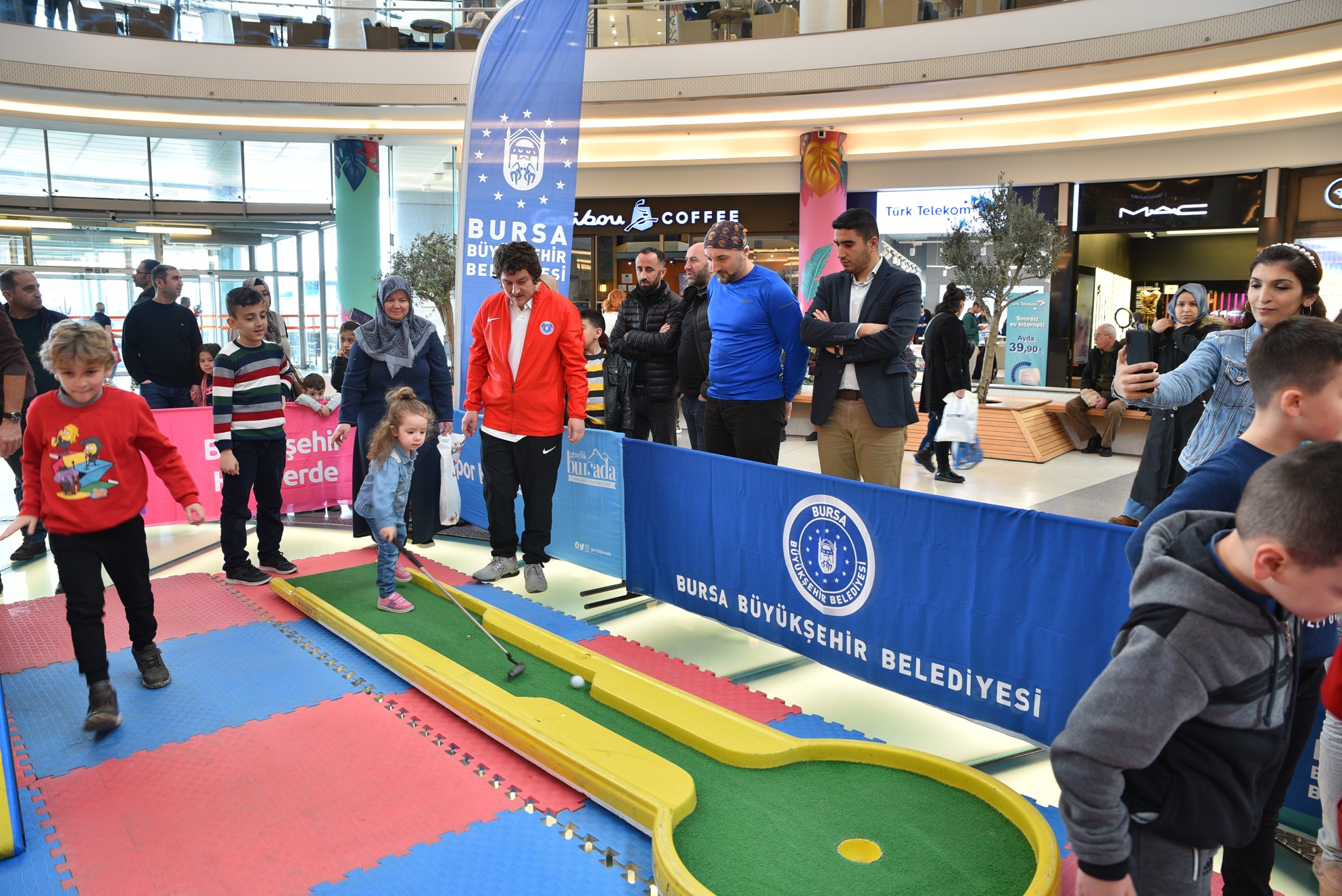 Korupark AVM’nin giriş katı holüne kurulan satranç, jimnastik, mini golf ve oyun parkurları, çocukların büyük ilgisini çekti. Spor hocalarının desteğiyle golf oynamayı öğrenen minikler, topları platformdaki yuvalarına yerleştirmek için büyük çaba sarf etti. Oyun parkurlarındaki engelleri bazen kendi performanslarıyla bazen de annelerinin desteğiyle aşan minikler, keyifli bir hafta sonu geçirdi.