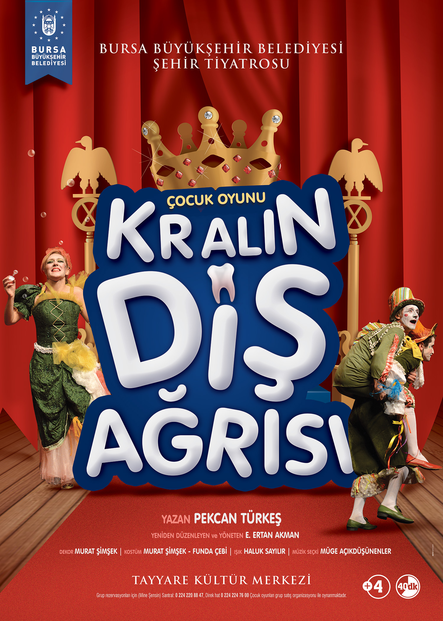 Çocuk ve gençler tarafından olduğu kadar yetişkinler tarafından da beğeniyle izlenen oyun, 23 Nisan Perşembe günü saat 14.00’da Tayyare Kültür Merkezi’nde ücretsiz olarak izlenime sunulacak. Pekcan Türkeş tarafından yazılan, yönetmenliğini E. Ertan Akman’ın üstlendiği oyunda, E. Ertan Akman, Serdar Soyer, Bülent Uçar, İpek Zeylan, Seçil Girgin, Uğur Serener ve M. Eren Topçak rol alıyor. Diş hekimlerinden çok korktuğu için, bütün diş hekimlerini ülkesinden kovan bencil bir kralın dayanılmaz diş ağrılarından kurtulmak için başvurduğu yolları komik bir üslupla anlatan oyunun müzikleri de Müge Açıkdüşünenler tarafından derlendi. Oyunun dekoru Murat Şimşek ve kostümleri ise Funda Çebi ve Murat Şimşek’e ait.