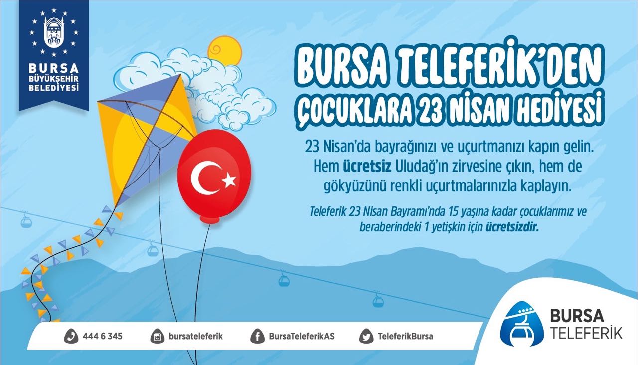 - BURSA BÜYÜKŞEHİR BELEDİYESİ, 23 NİSAN ULUSAL EGEMENLİK BAYRAMI’NDA ÇOCUKLARA ADETA ‘TELEFERİK BAYRAMI’ YAŞATACAK, ELİNDE TÜRK BAYRAĞI VE UÇURTMAYLA GELEN ÇOCUKLAR, TELEFERİKLE ÜCRETSİZ ULUDAĞ’A ÇIKABİLECEK.