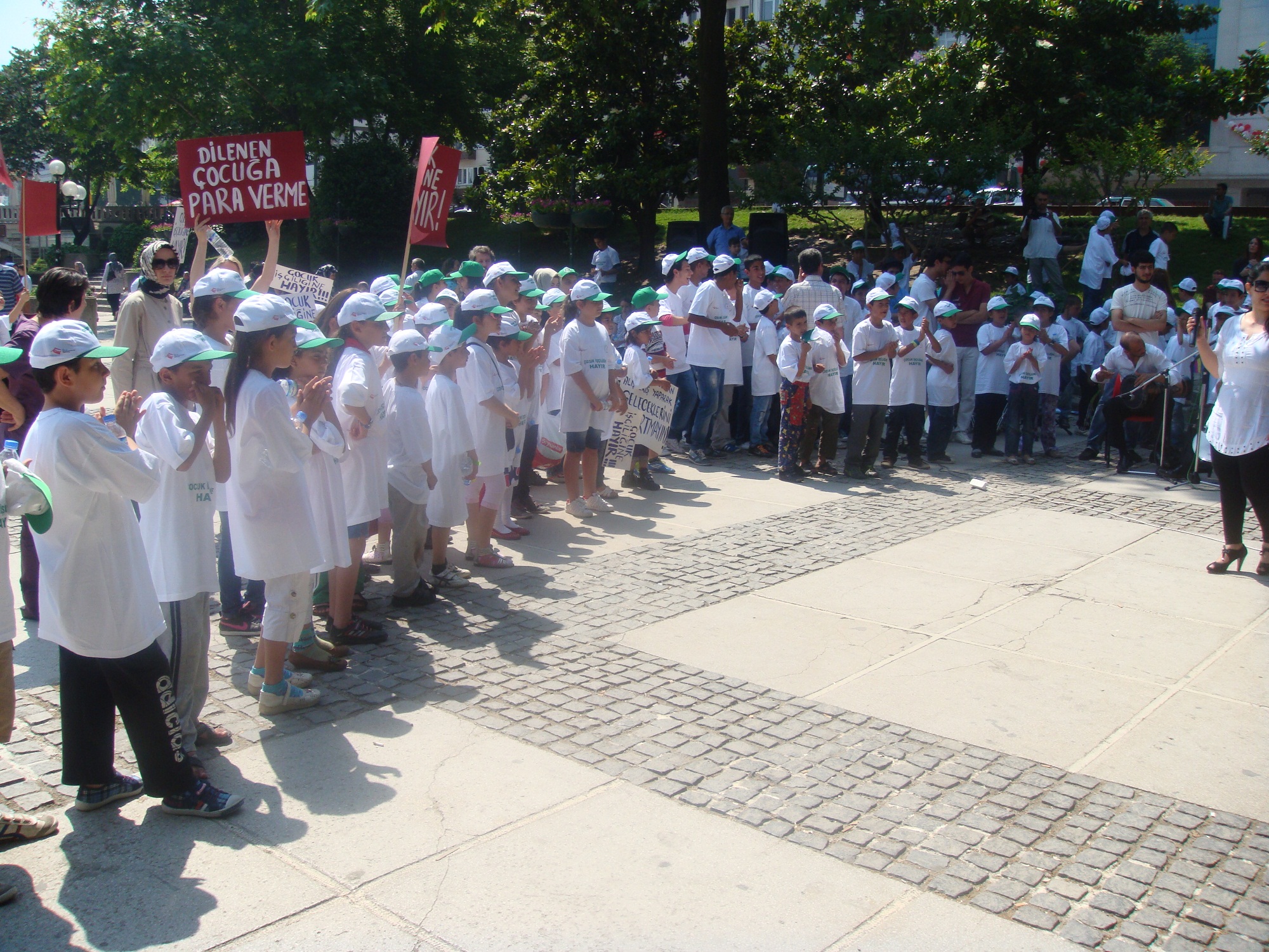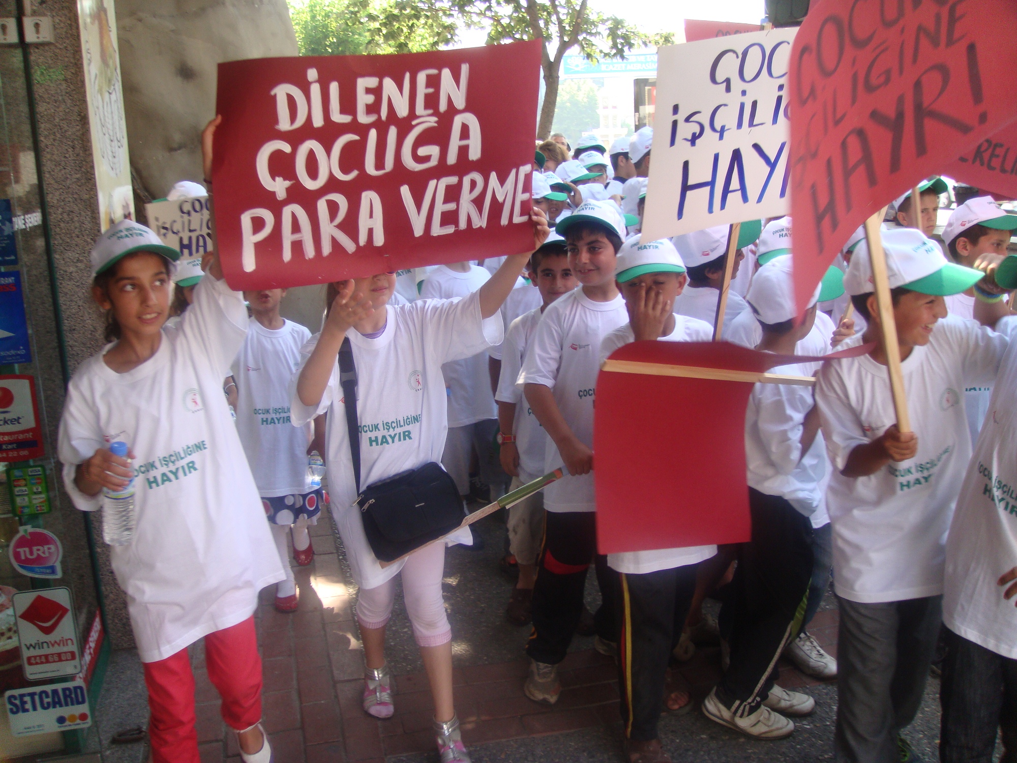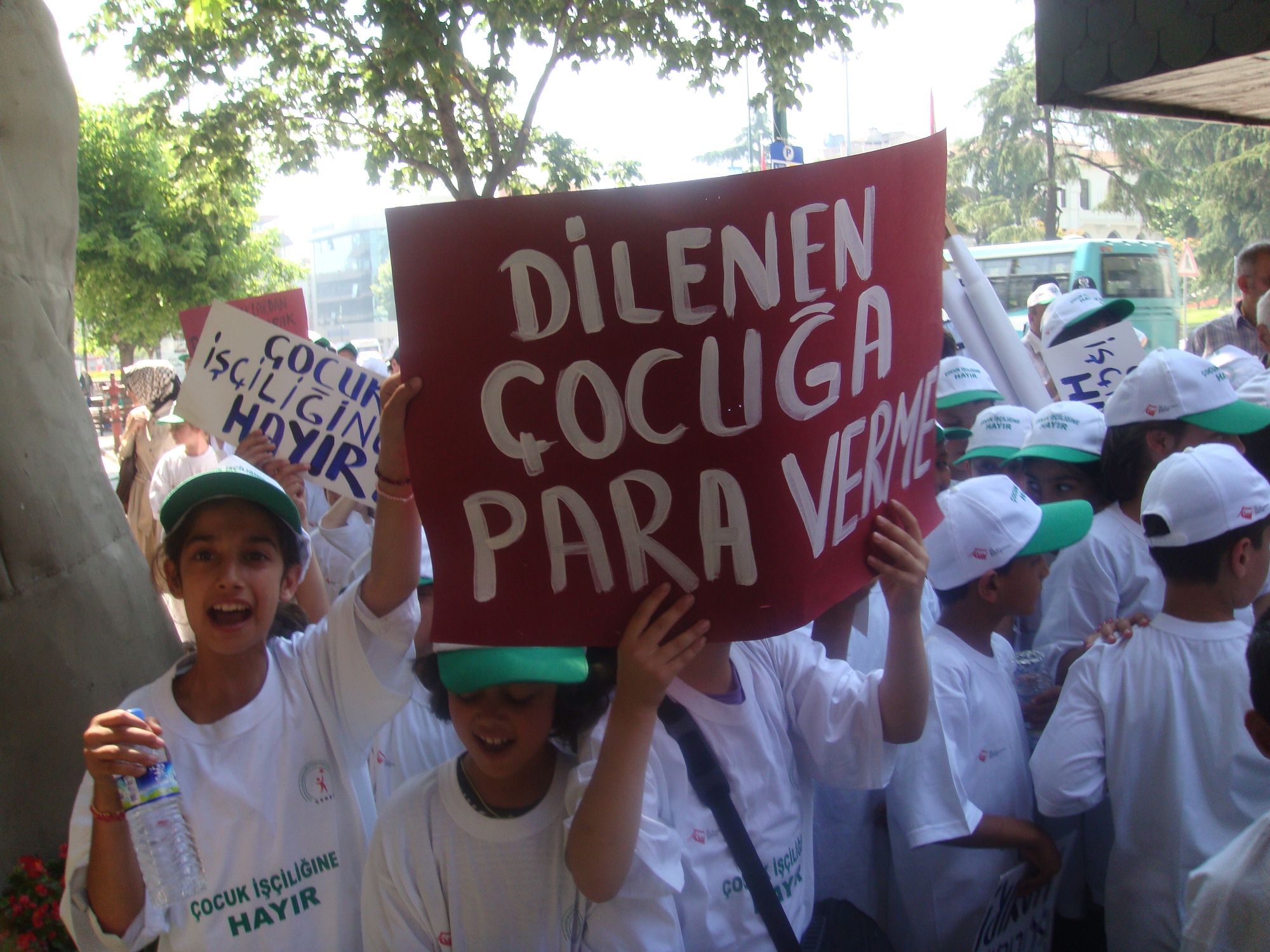 Atatürk Heykeli önünde toplanan Büyükşehir Belediyesi Çocuk Merkezi´ne kayıtlı çocuklar, Bursa Kent Konseyi Çocuk Meclisi üyeleri ve Aile ve Sosyal Politikalar İl Müdürlüğü´nden çocuklar yürüyüş yaptı; ‘Çocuk işçiliğine hayır’, ‘Ayakkabını çocuğa boyatma’, ‘Çocuk işçiliğine son verelim’ yazılı pankartlar açarak çocuk işçiliğini protesto etti. Orhangazi Parkı´na kadar yürüyen gruba, yoldan geçen bazı vatandaşlar da katılarak destek oldu. Çalgıcı Mektebi Roman Orkestrası günün anlamına dikkat çekmek amacıyla Orhangazi Parkı´nda konser verdi. Çocuk Hakları Çocuk Komitesi üyeleri de mini konser verdi, günün anlamıyla ilgili konuşma yaptılar. Öğleden sonra ise Botanik Park´ta Büyükşehir Belediyesi tarafından düzenlenen piknikte de çocuklar, eğlenceli bir gün geçirdi. Çocukların çok ağır işlerde çalıştırıldığını söyleyen Çocuk Meclisi üyeleri, çocukların sokaklarda baskı yoluyla dilencilik yapmak zorunda kaldığını belirtti. Çocukların ağır işlerde ve sokaklarda çalışmasına izin verilmemesini isteyen Çocuk Meclisi üyeleri, onlardan yapılan her alışverişin sokakta daha fazla kalmasına sebep olduğunu ifade etti.