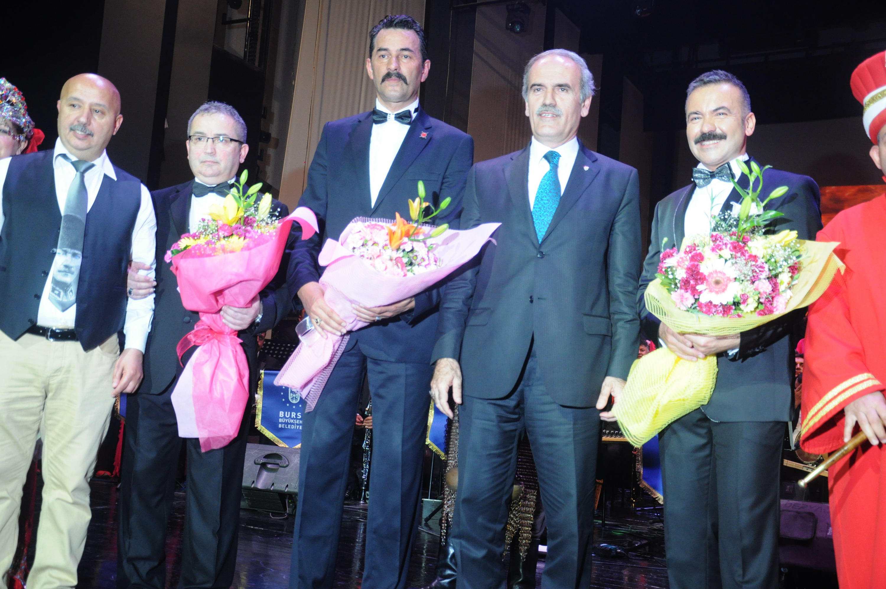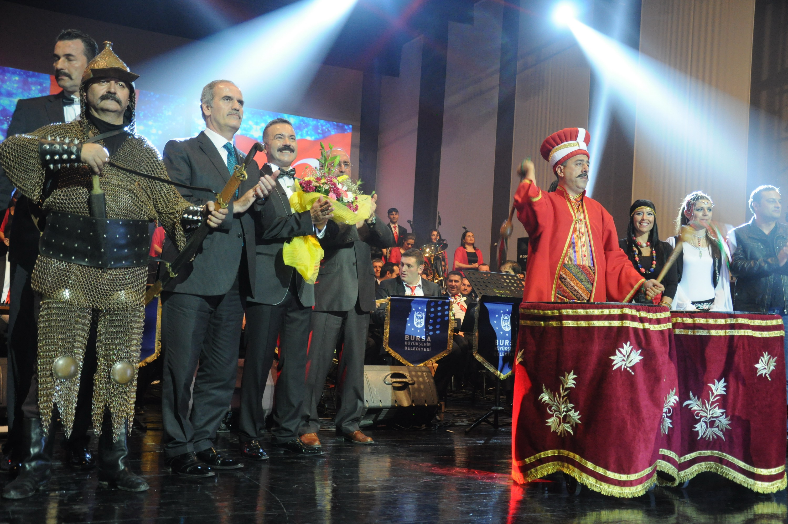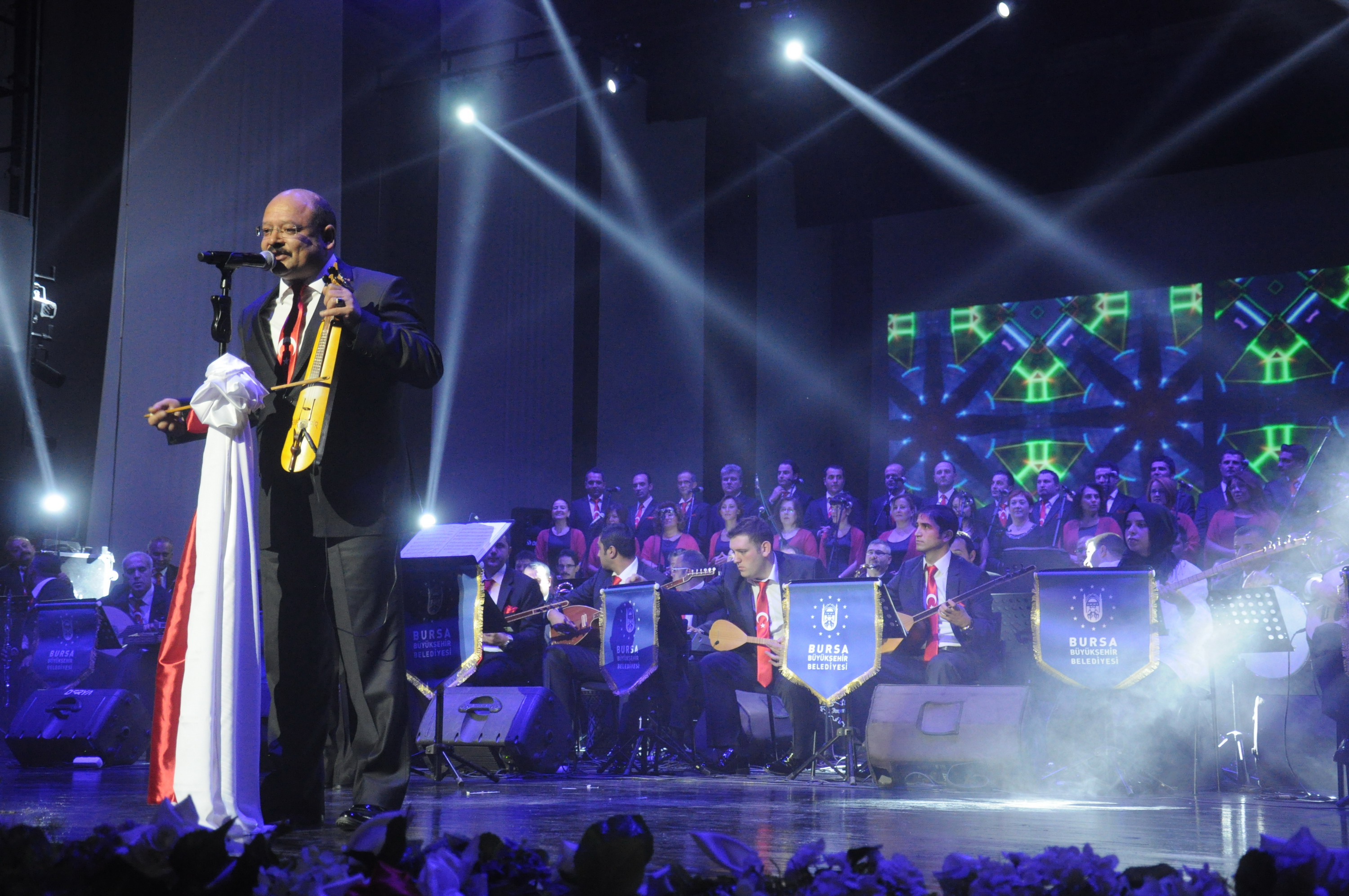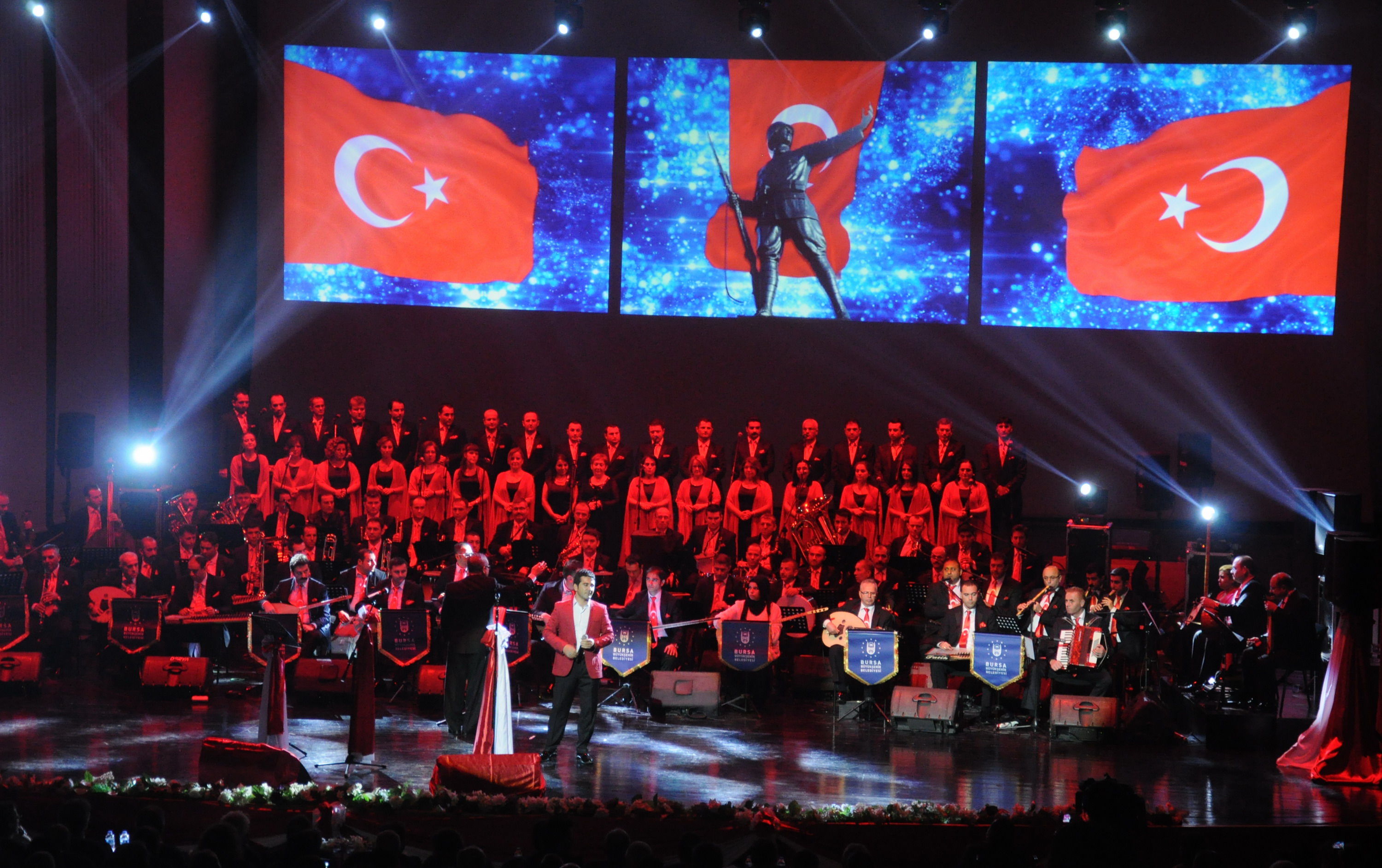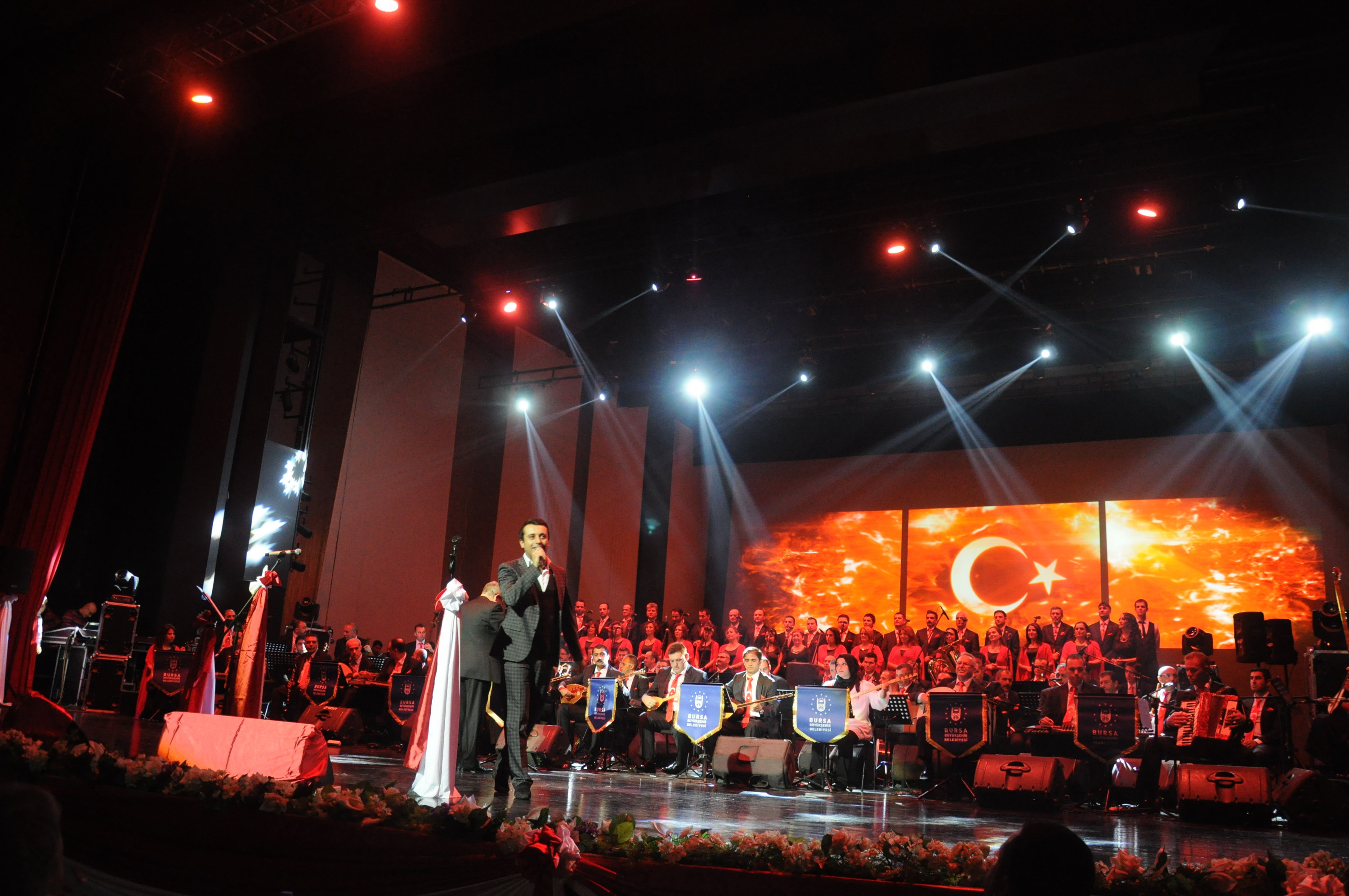 BURSA – Bursa Büyükşehir Belediyesi tarafından düzenlenen ‘Cumhuriyet Bayramı Konseri’nde, Türk Sanat Müziği ve Türk Halk Müziği bölümleri, Bursa Mehter Ekibi, Bando şefliği ve Çalgıcı Mektebi Roman Orkestrası’ndan oluşan 150 kişilik dev kadro seslendirdiği eserlerle Bursalıları mest etti.