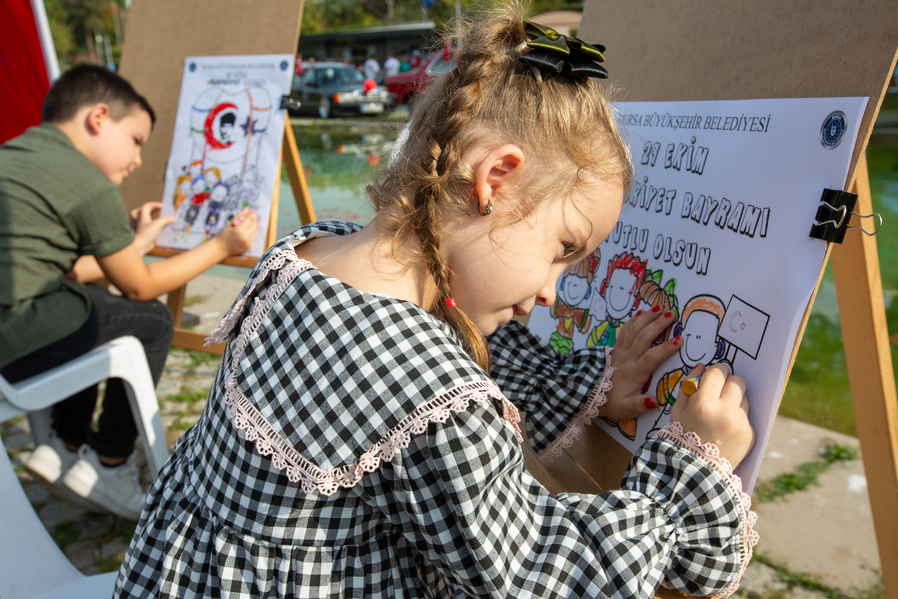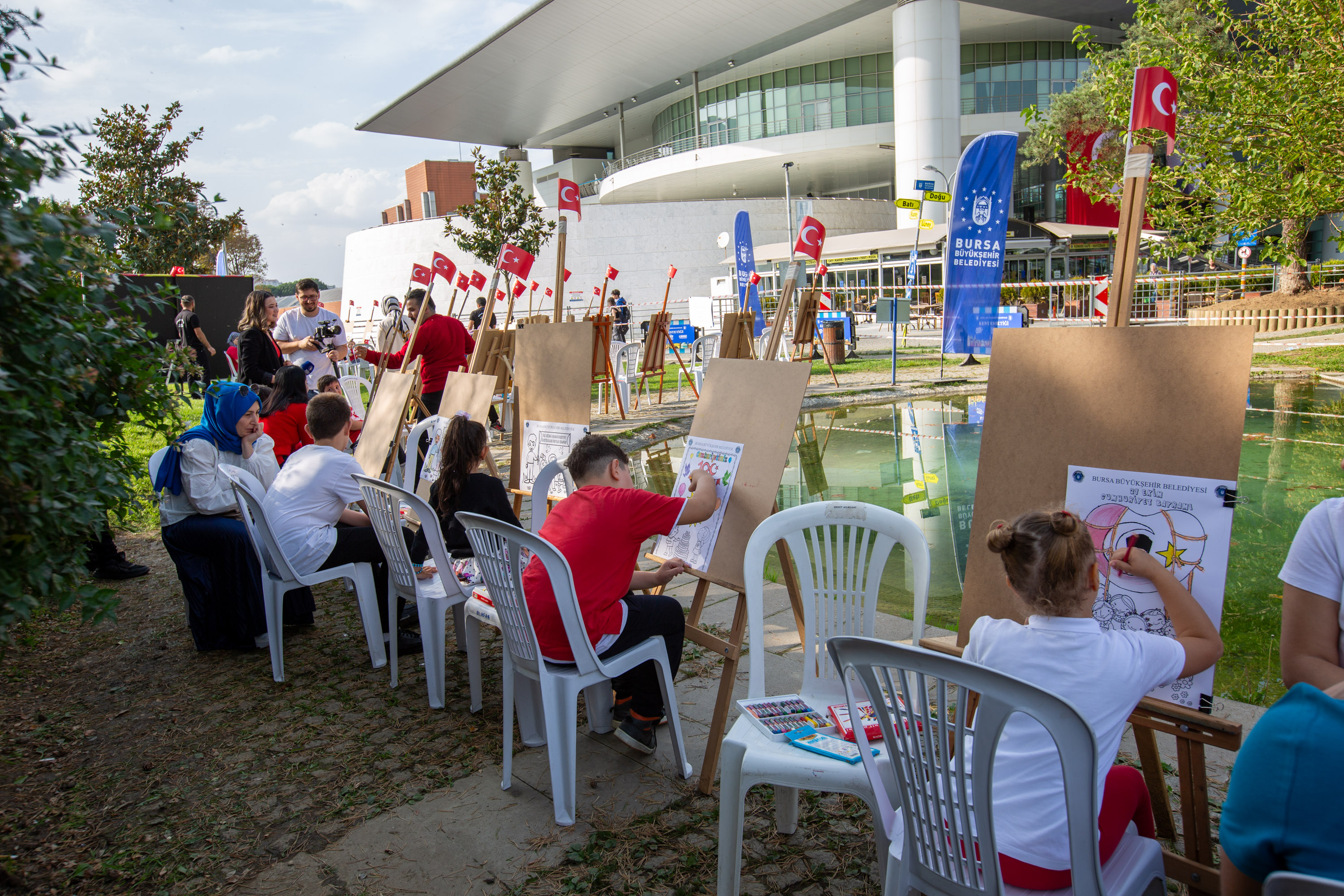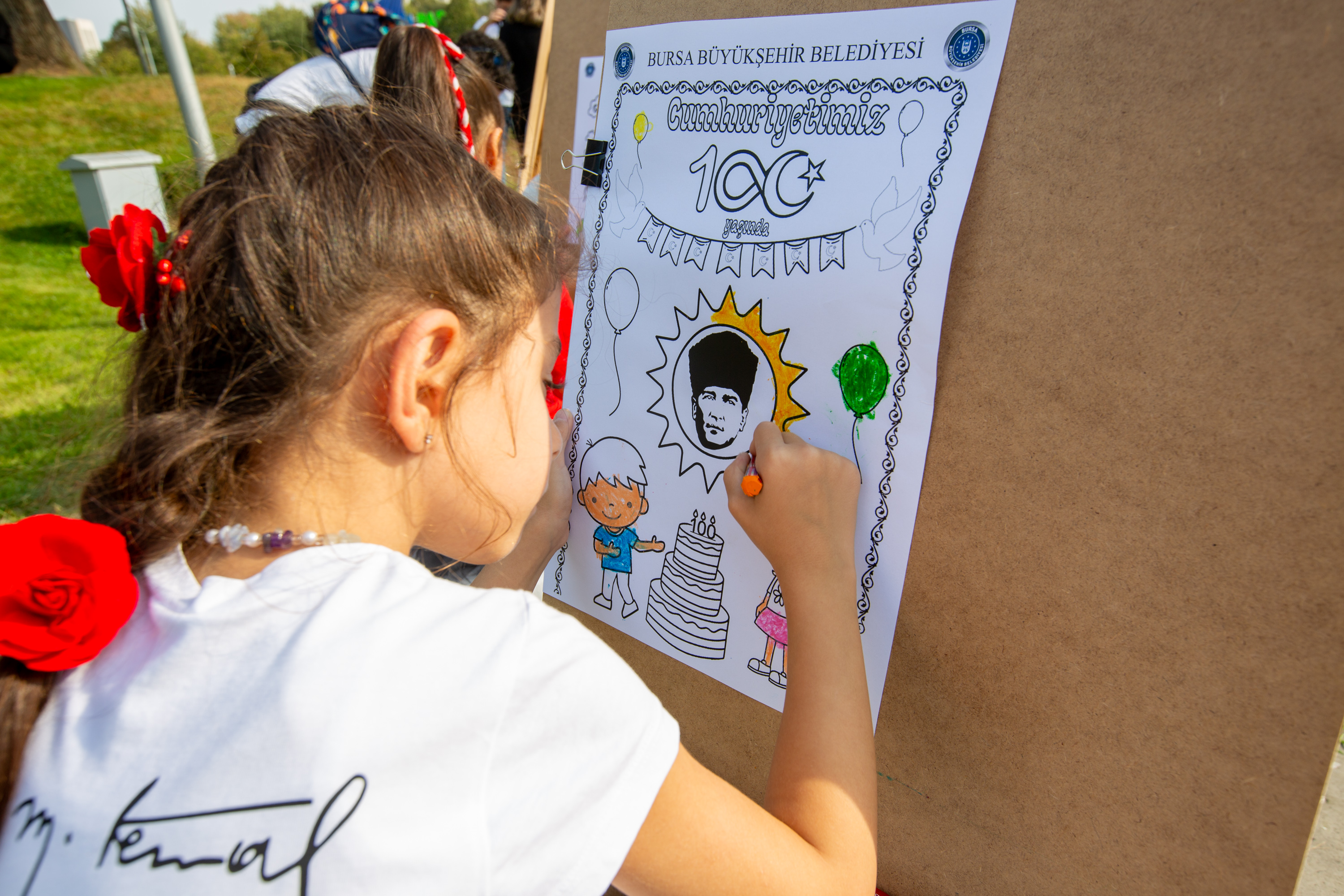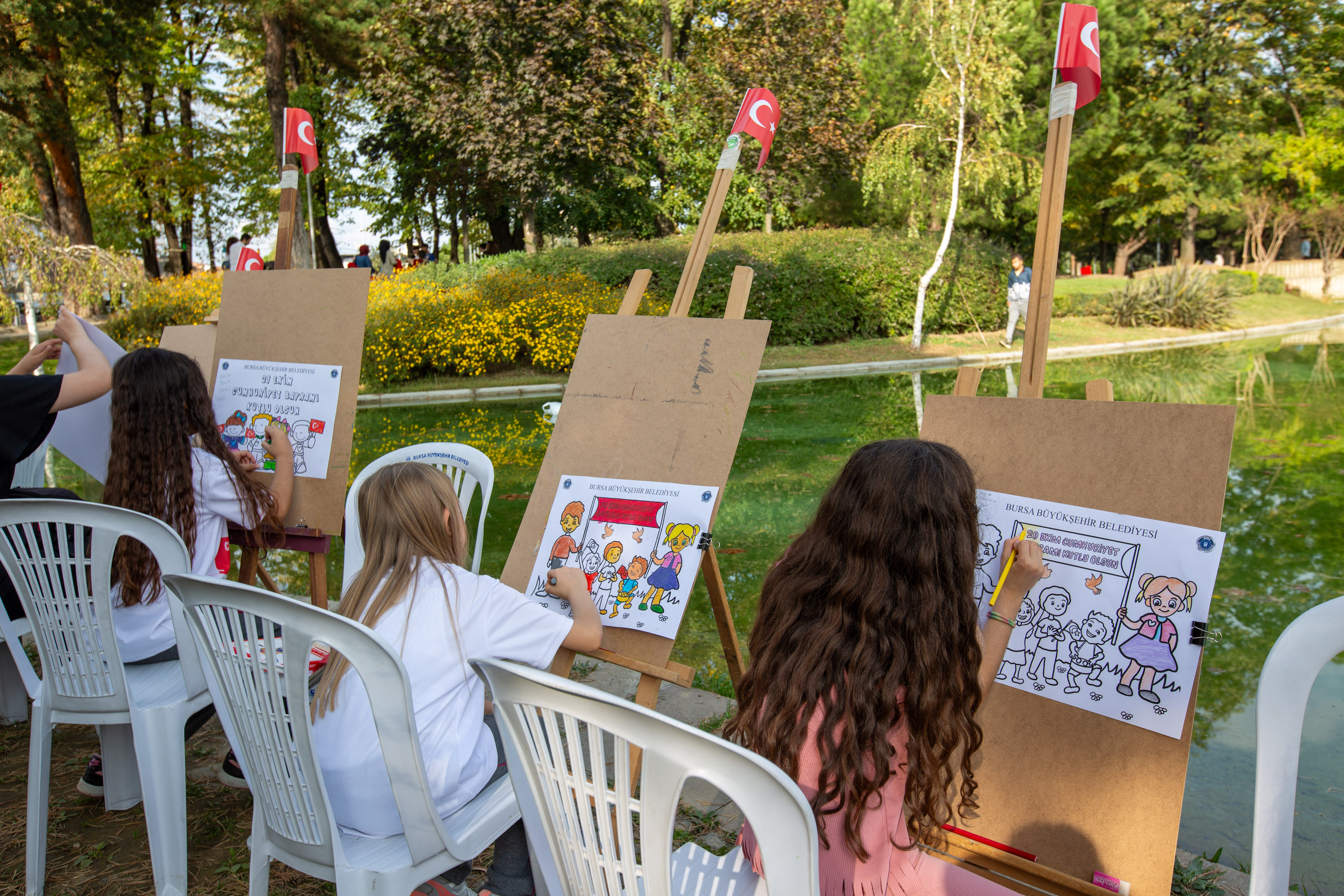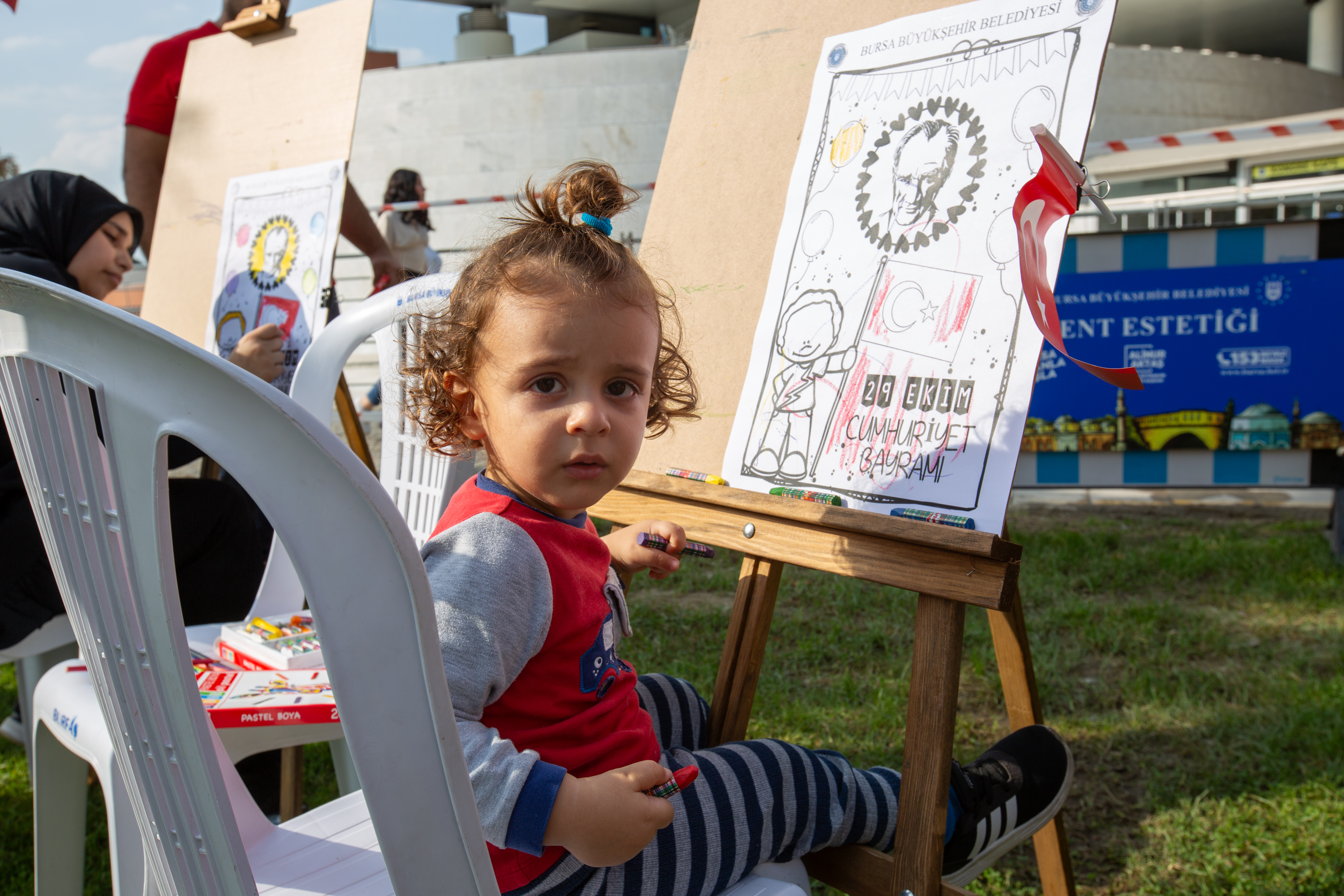 BURSA – Bursa Büyükşehir Belediyesi’nin Cumhuriyet’in 100’üncü yılı etkinlikleri kapsamında düzenlendiği açık hava resim yapma etkinliğine katılan yüzlerce çocuk, tuval başında hünerlerini gösterdi.