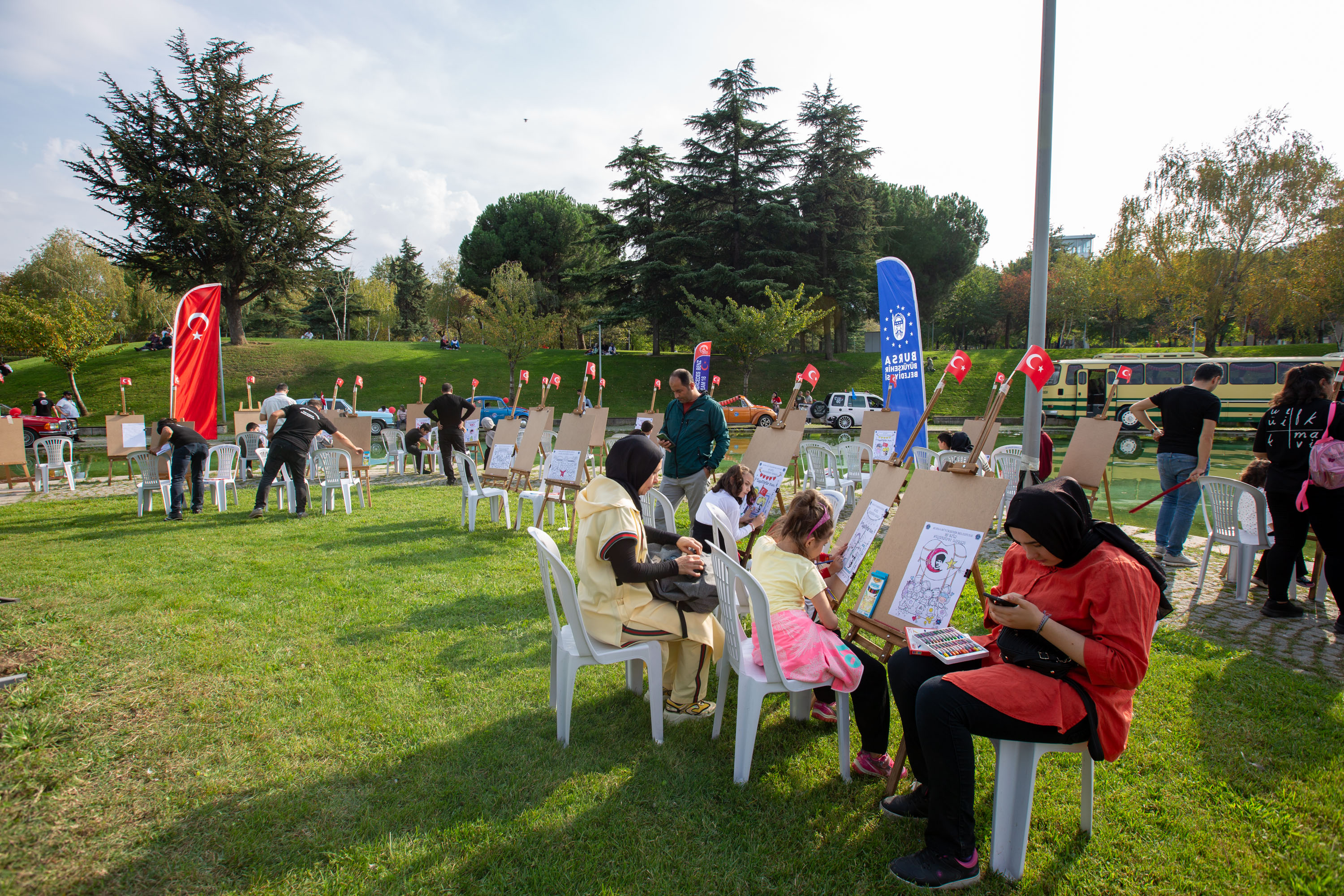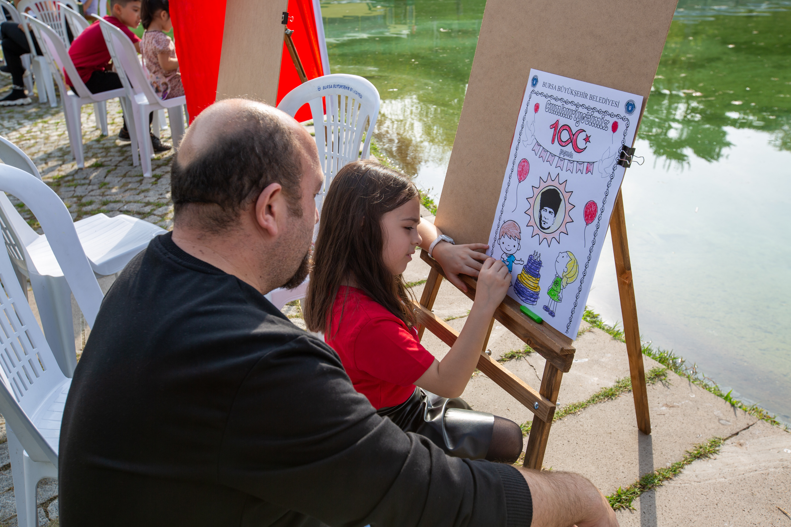 Havanın da güzel olması nedeniyle aileleriyle birlikte Merinos Park’a akın eden küçük ressamlar, tuval başında hünerlerini sergiledi. Gün boyu devam eden etkinlikle hem çocuklar hem de aileleri keyifli bir gün geçirirken, resim yapan her çocuğa Türk Bayrağı hediye edildi.