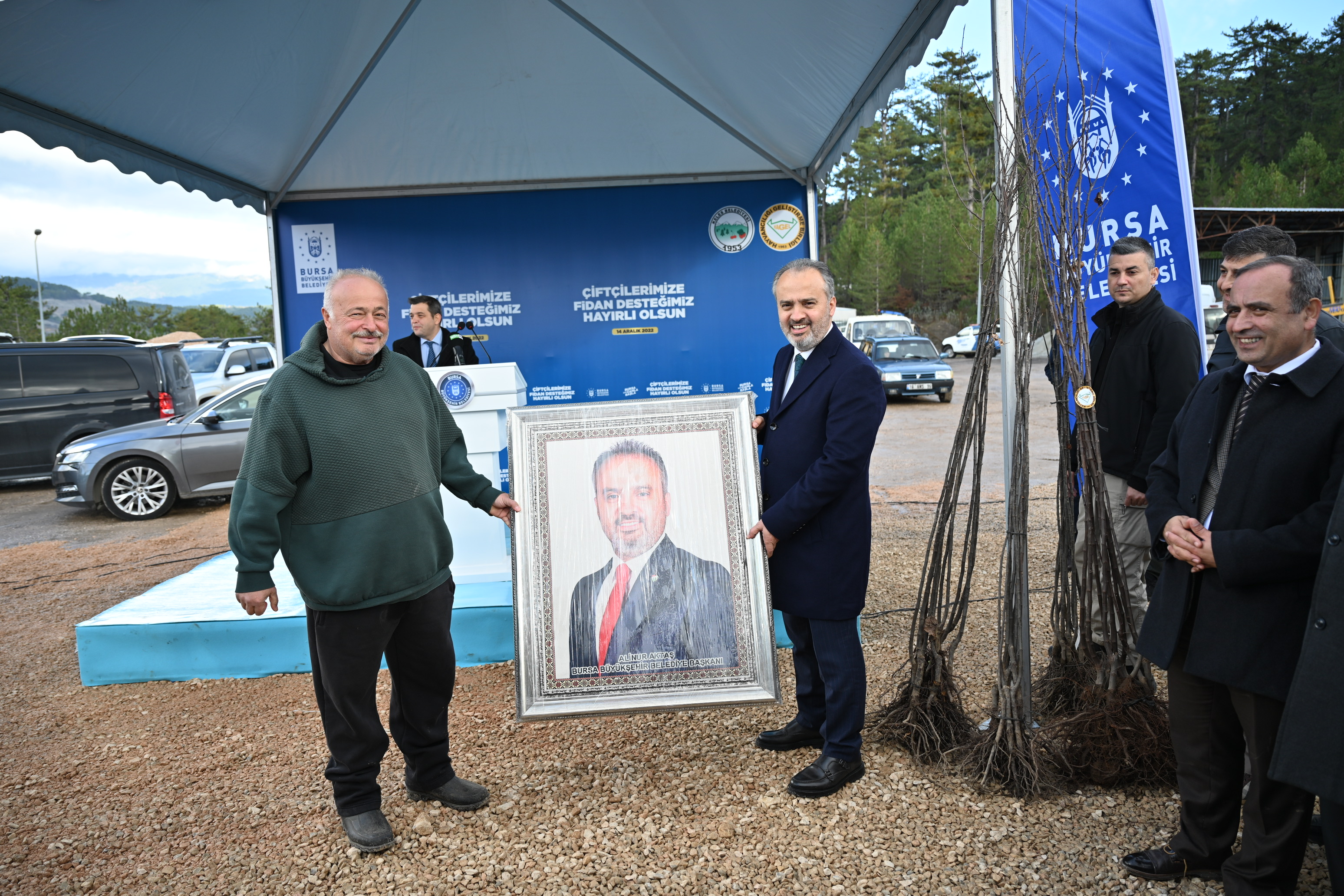 Konuşmaların ardından, Büyükşehir Belediye Başkanı Alinur Aktaş ve protokol üyeleri tarafından çiftçilere fidanlar teslim edildi. Program sonunda Yüksek Ziraat Mühendisi Erol Köse tarafından Başkan Aktaş’a günün anısına kilim tablo hediye edildi.