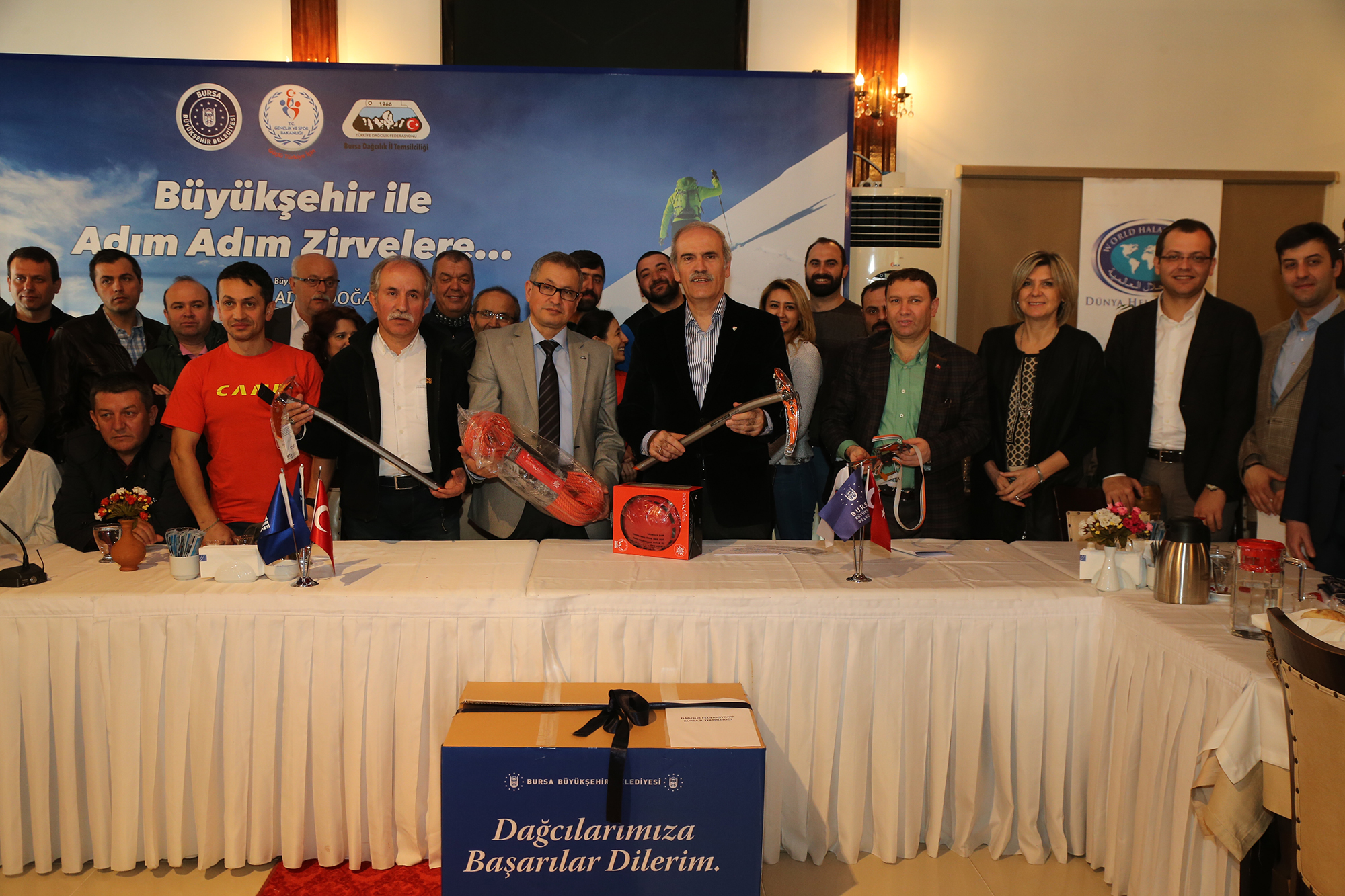Konuşmaların ardından Başkan Altepe, Uludağ Üniversitesi Dağcılık Topluluğunun da aralarında bulunduğu toplam 28 dağcılık kulübüne 2 teknik kazma, 60 metrelik dinamit ip, kask ve bir çift otomatik krampondan oluşan malzemeleri dağıttı.