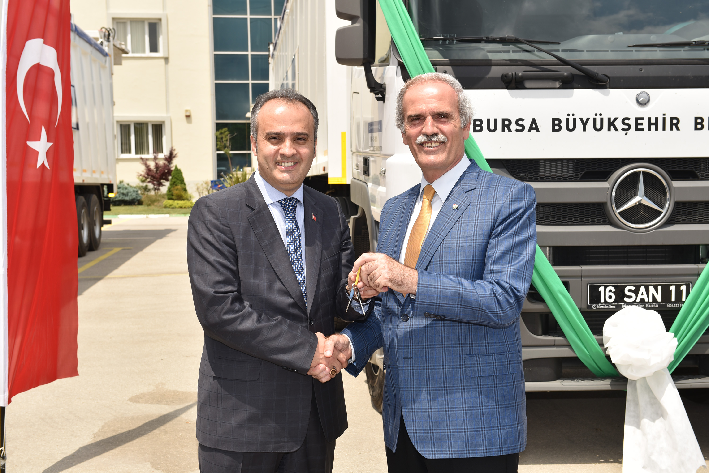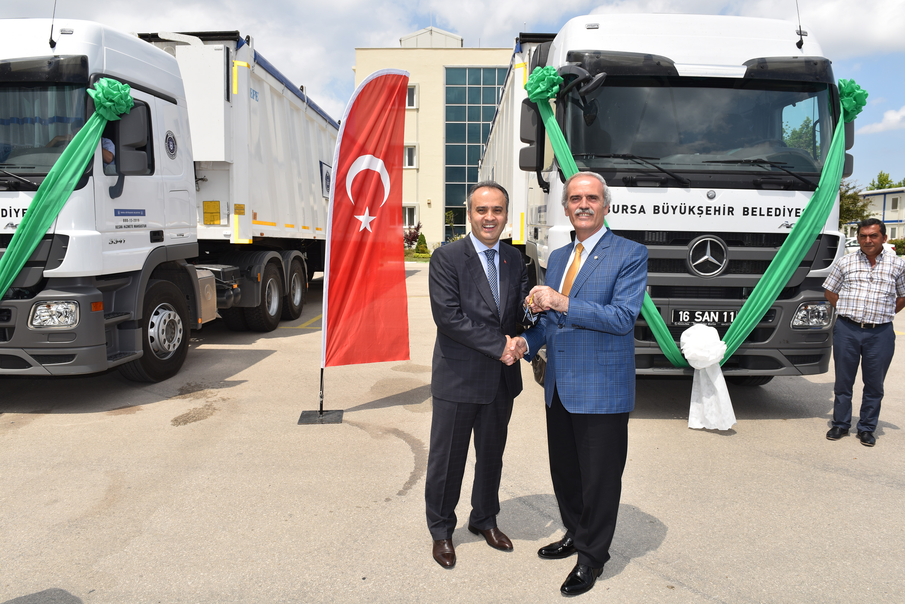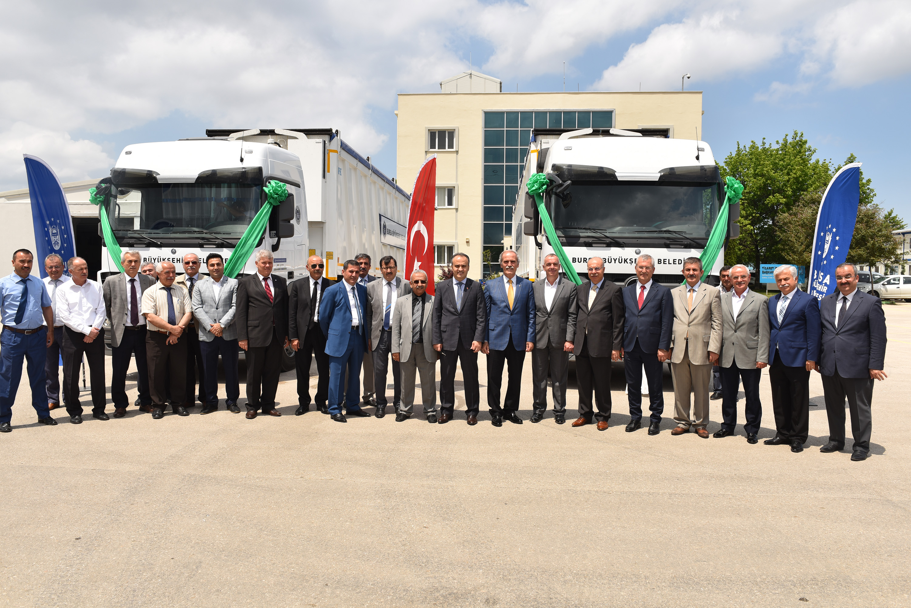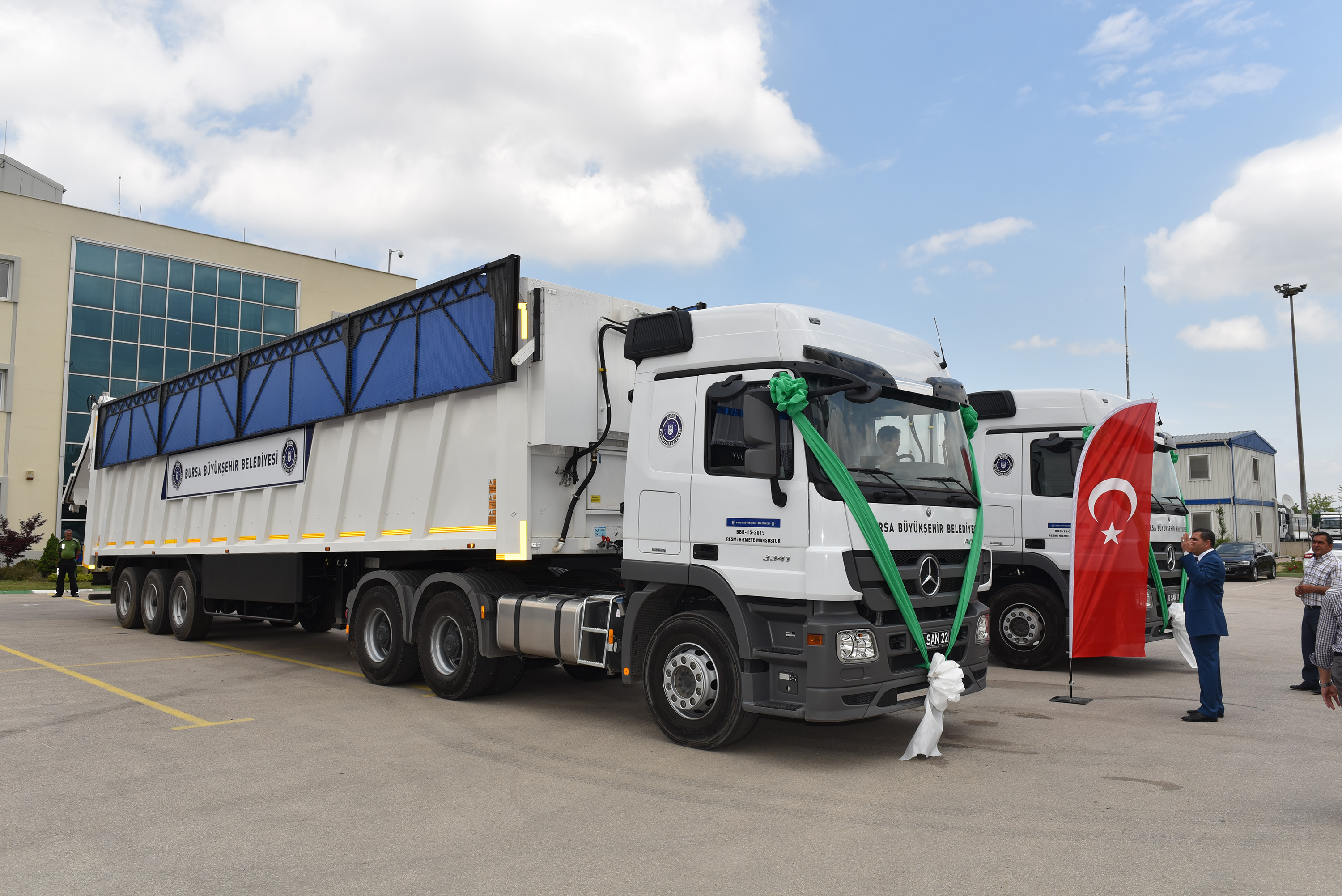 Bütünşehir uygulamasının ardından merkeze yeni bağlanan 10 ilçede de altyapıdan ulaşıma, tarihi kültürel mirastan kırsal kalkınmaya kadar her alanda önemli projeleri hayata geçiren Büyükşehir Belediyesi, ilçe belediyelerinin sorumluluk alanında bulunan faaliyetlere de destek sağlamaya devam ediyor. Daha önce İznik Belediyesi tarafından ilçede toplanan atıkların İnegöl’deki Katı Atık Depolama Alanı’na nakli için 1 adet çöp taşıma treyleri alan Büyükşehir Belediyesi, şimdi de İnegöl Belediyesi için 2 adet çöp taşıma treyleri ve bir çekici aldı. Büyükşehir Belediye Başkanı Recep Altepe İlçe merkezinde toplanan atıkların, depolama sahasına naklinde kullanılacak araçların anahtarlarını İnegöl Belediye Başkanı Alinur Aktaş’a teslim etti.
