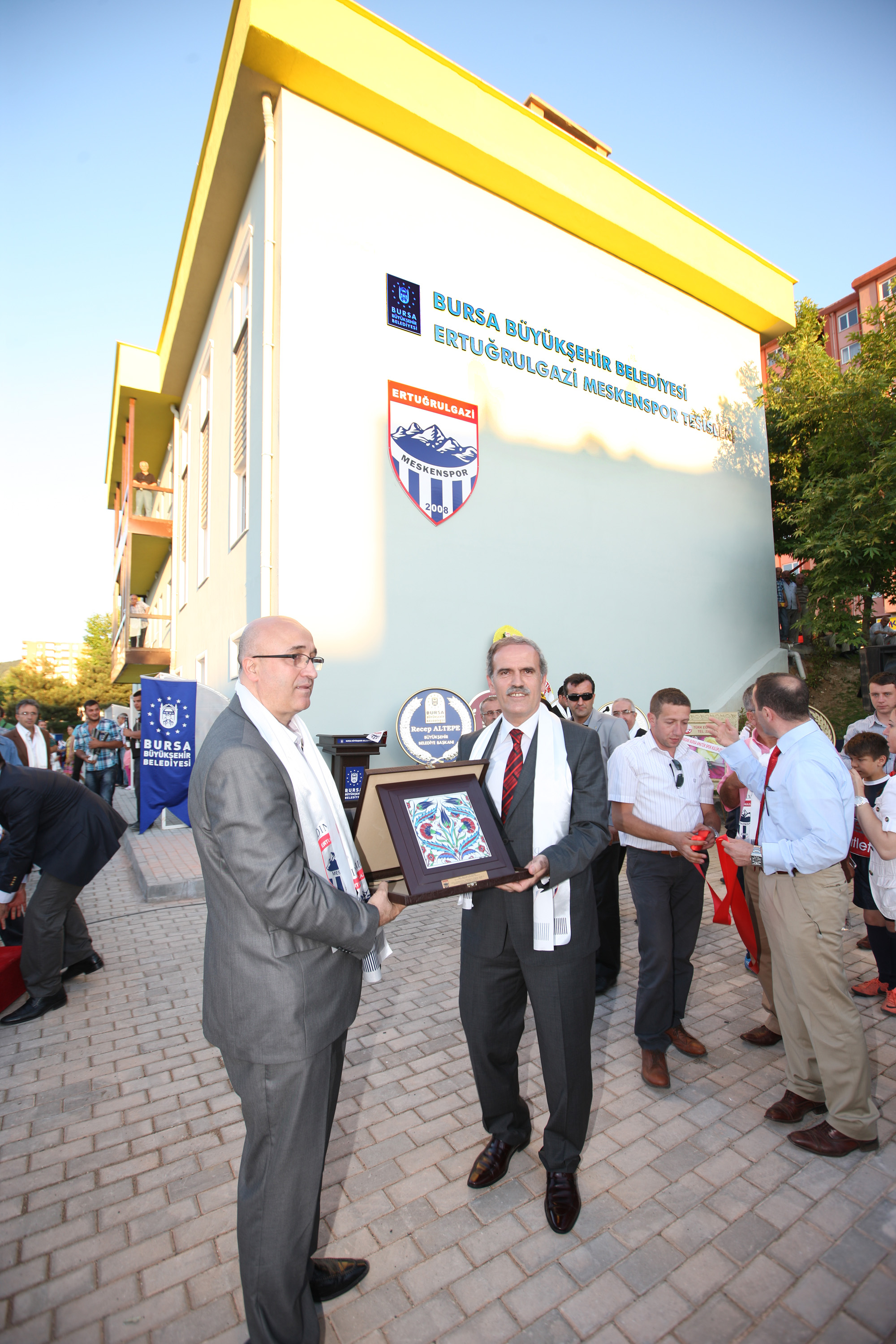 Yeniden kuruluşunun ardından geçen 3 yılda önemli başarılara imza atan Ertuğrulgazi Meskenspor Kulübü’nün yeni tesislerinin açılış töreni kulübün eski yöneticileri, oyuncuları ve Bursalı spor adamlarını bir araya getirdi. Kulüp kapatılmadan önce tezahüratlarıyla tribünleri coşturan takımın amigosu usta oyuncu Erkan Can da bu mutlu günde arkadaşlarını yalnız bırakmadı. Açılış töreninde ilk olarak kürsüye çıkan Ertuğrulgazi Meskenspor Kulübü Başkanı Nedim Kurtuluş, özellikle kıt imkanlarla amatör kulüplerde hizmet veren yöneticilerin birer kahraman olduğunu belirterek, “Bursa’nın gerçekten bir kahramanı var O’da sayın Büyükşehir Belediye Başkanı Recep Altepe. Çok açık yüreklilikle söylüyorum, Bursaspor’a ve amatör kulüplere bu kadar önem veren, bu kadar seven ve hep içimizde olan biri. Böyle bir şeyin altına imza atmak kolay değil. Böyle bir şeyi amatör küme bir yönetime teslim etmek hiç kolay değil. Kendisine minnettarız” dedi.
