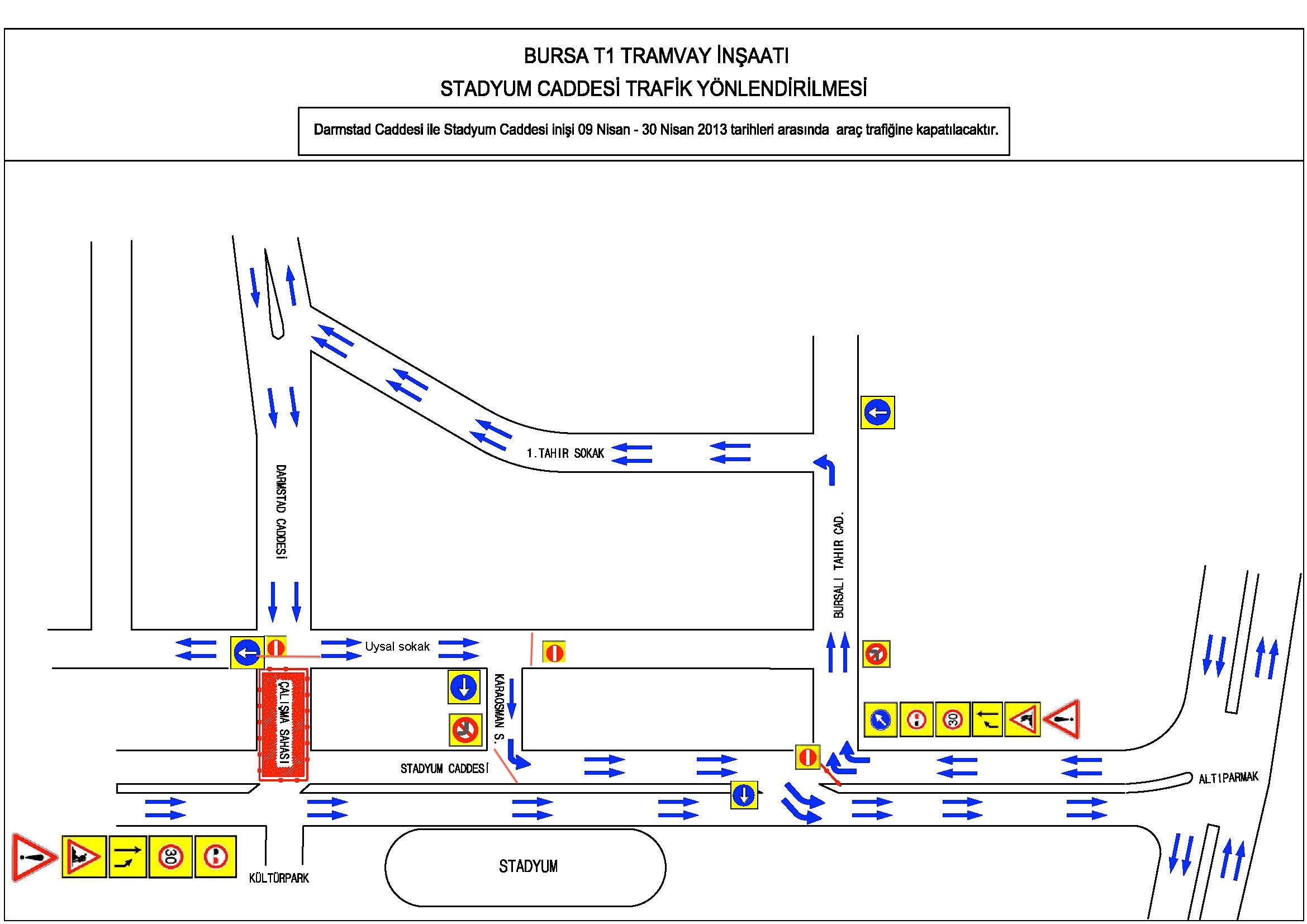 - BURSA BÜYÜKŞEHİR BELEDİYESİ TARAFINDAN YAPTIRILAN T1 TRAMVAY HATTI ÇALIŞMALARI KAPSAMINDA RAY BAĞLANTISI YAPILACAĞINDAN DARMSTADT CADDESİ – STADYUM CADDESİ BAĞLANTISI 10 – 30 NİSAN 2013 TARİHLERİ ARASINDA TRAFİĞE KAPATILACAK.