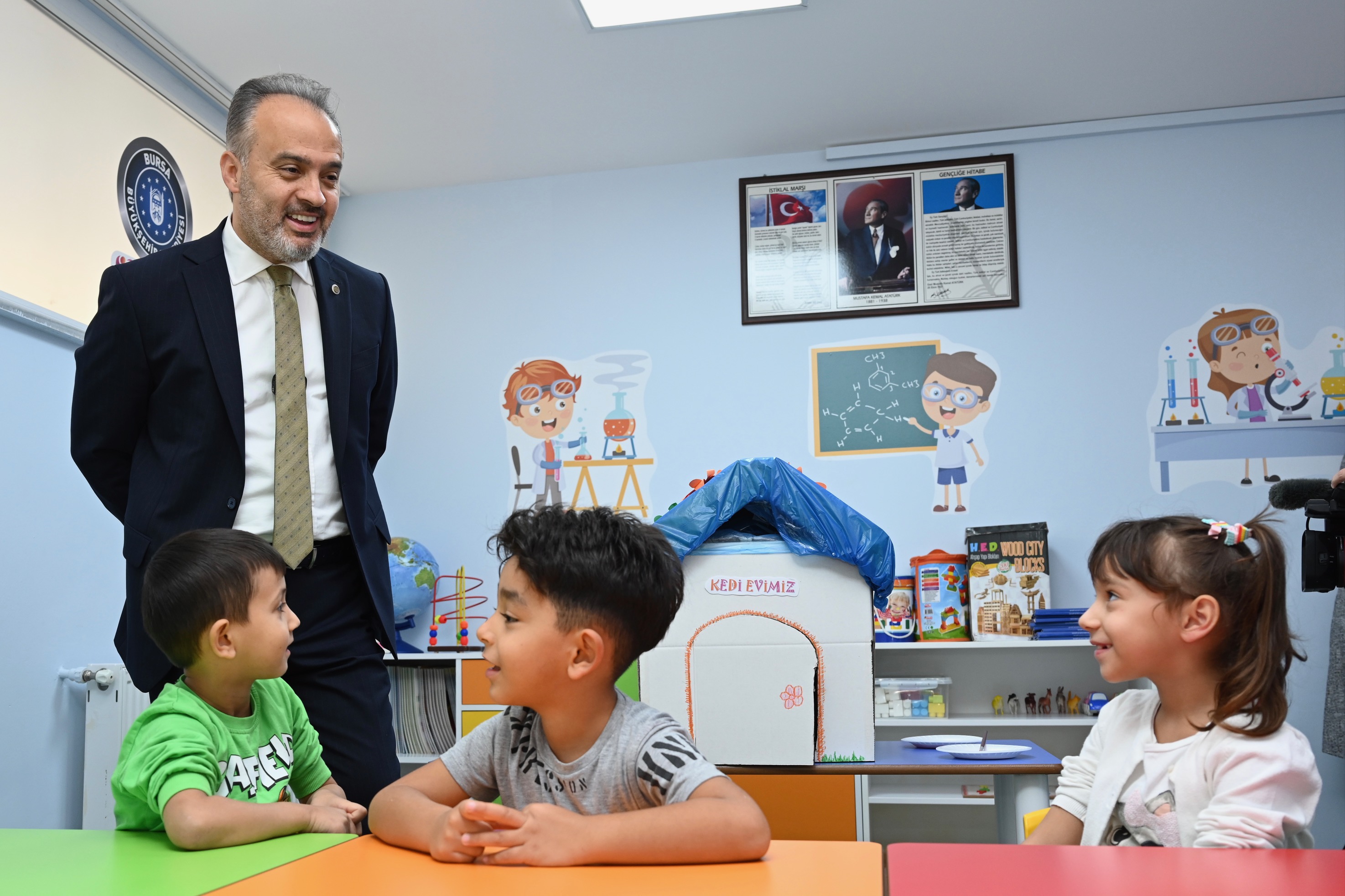Bursa Büyükşehir Belediyesi’nin özellikle dar gelirli ailelerin çocuklarının da okul öncesi eğitim hizmetlerinden faydalanabilmesi amacıyla 2019 yılında başlattığı Ana Kucakları, zengin müfredatıyla da çocukları geleceğe en iyi şekilde hazırlıyor. Bu dönem eğitime başlayan Demirtaş Ana Kucağı ile sayıları 29’a ulaşan merkezlerde halen 3500’e yakın öğrenci eğitim görüyor. Fırsat buldukça Ana Kucaklarını ziyaret edip, çocuklarla buluşan Büyükşehir Belediye Başkanı Alinur Aktaş’ın son durağı da Demirtaş Ana Kucağı oldu. Hayvanları Koruma Günü kapsamında kedi evi yaparak, önemli bir farkındalığa imza atan Demirtaşlı miniklerle bir araya gelen Başkan Aktaş, sohbet ettiği çocuklara eğitim hayatlarında başarılar diledi.