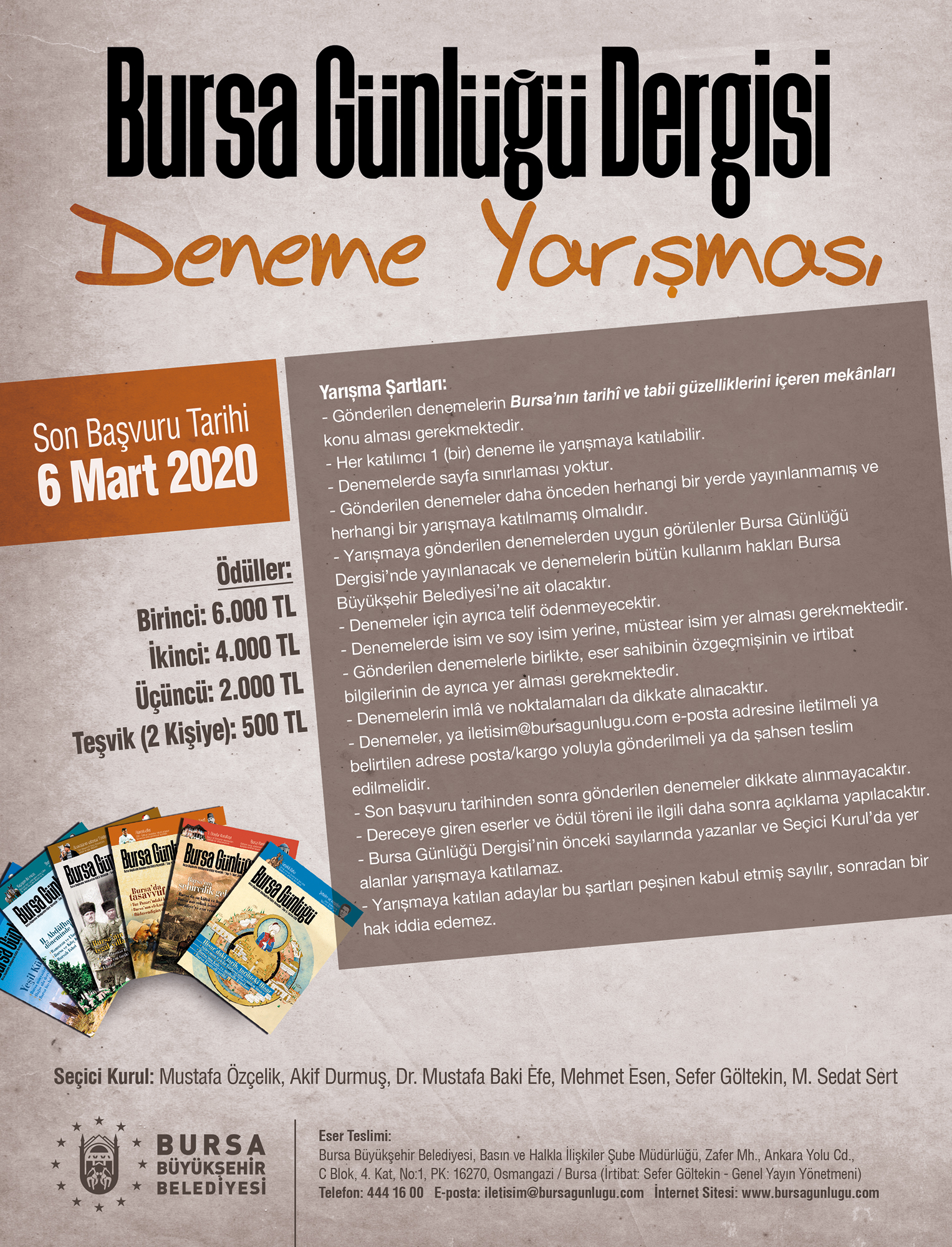 Büyükşehir Belediyesi Basın Yayın ve Halkla İlişkiler Dairesi Başkanlığı bünyesinde hazırlanan ve tarih, kültür, edebiyat penceresinden Bursa’ya ayrı bir ışık tutan Bursa Günlüğü tarafından, “Deneme Yarışması” düzenlendi. Son başvuru tarihinin 6 Mart 2020 olduğu yarışmaya gönderilen denemelerin “Bursa’nın tarihî ve tabii güzelliklerini içeren mekânları” konu alması gerekiyor. Her katılımcının bir deneme ile başvurabileceği yarışmada denemeler için herhangi bir sayfa sınırlaması yok. Gönderilen denemelerin daha önceden herhangi bir yerde yayınlanmamış ve herhangi bir yarışmaya katılmamış olması şartı aranıyor. Yarışmaya gönderilen denemelerden uygun görülenler Bursa Günlüğü Dergisi’nde yayınlanacak ve denemelerin bütün kullanım hakları Bursa Büyükşehir Belediyesi’ne ait olacak. Denemeler için ayrıca telif ödenmezken, denemelerde isim ve soy isim yerine, müstear isim yer alması gerekiyor. Gönderilen denemelerle birlikte, eser sahibinin özgeçmişinin ve irtibat bilgilerinin de ayrıca yer alması gerekirken, denemelerin imlâ ve noktalamaları da dikkate alınacak.
