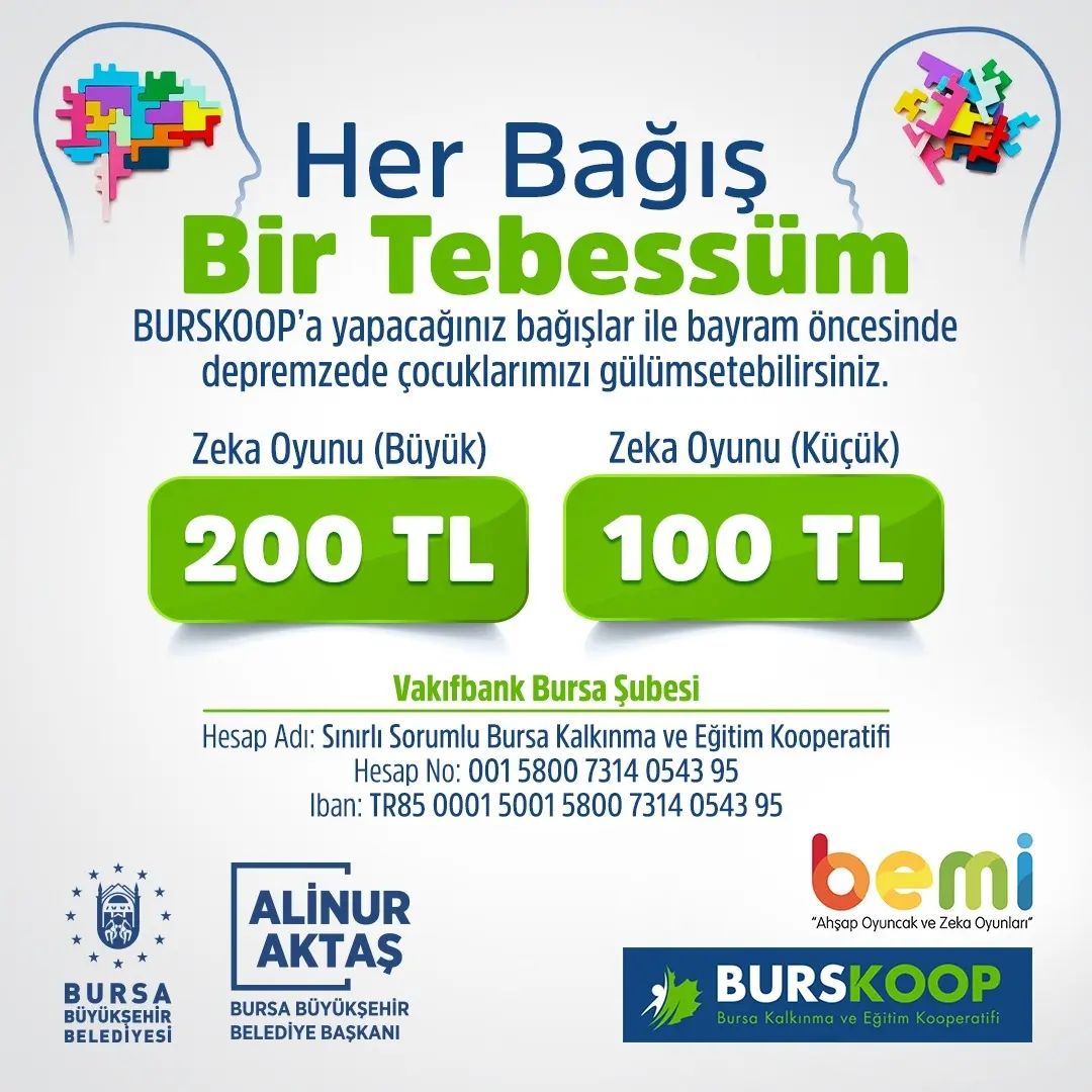 Bursa Büyükşehir Belediyesi tarafından ihtiyaç sahibi öğrencilerin eğitimine katkı sunmak amacıyla kurulan BURSKOOP, çıtayı her geçen gün yükseltiyor. Halen meslek lisesi ve üniversite olmak üzere 10 bin öğrenciye burs veren, doktora ve yüksek lisans tez çalışmalarını desteklemeye hazırlanan BURSKOOP, şimdi de depremzede çocuklar için devreye girdi. ‘Her Bağış Bir Tebessüm’ sloganıyla Ramazan ayı başında yardım kampanyası başlatan BURSKOOP, toplanan bağışlarla deprem bölgesindeki çocuklara bayramlık kıyafet alacak. BURSKOOP’a arife gününe kadar yapılacak her 1000 liralık bağış, depremzede çocuklara bayramlık olarak dönecek. Aynı bağış kampanyası kapsamında 100 ve 200 liralık bağışlarla da afetzede çocuklara zeka oyunu hediye edilebilecek.