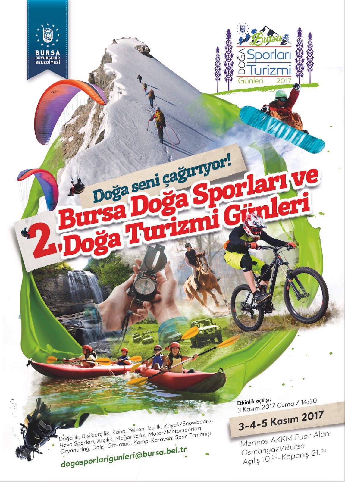 - BURSA BÜYÜKŞEHİR BELEDİYESİ TARAFINDAN KENTİN SAHİP OLDUĞU DOĞAL ZENGİNLİKLERİ VE YAPILABİLECEK DOĞA SPORLARINI TANITMAK AMACIYLA 03-04-05 KASIM 2017 TARİHLERİNDE 2.BURSA DOĞA SPORLARI VE DOĞA TURİZMİ GÜNLERİ DÜZENLENİYOR.