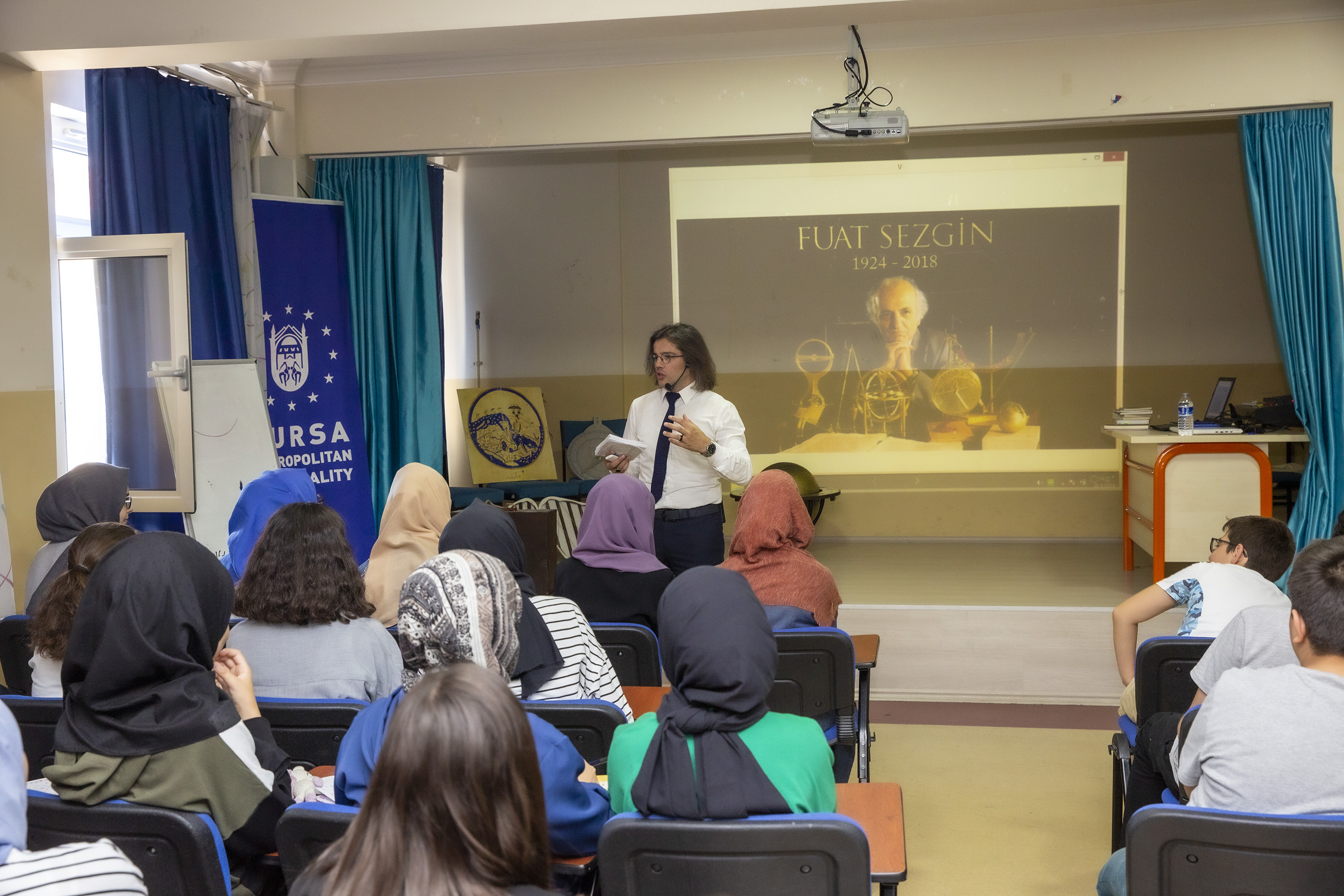 Kültür ve Sosyal İşler Dairesi Başkanlığı tarafından hazırlanan ve 30 hafta sürecek projede görev alan İstanbul Medipol Üniversitesi Öğretim Görevlisi Uğur Polat, İpekçilik Anadolu İmam Hatip Lisesi, Nilüfer İMKB Fen Lisesi ve Bursa Anadolu Lisesi’ndeki öğrencilerle bir araya geldi. 2019 Prof. Dr. Fuat Sezgin yılı anısına düzenlenen Doğu’dan Gelen Işık: Müslüman Bilim Adamları projesi hakkında bilgi veren Polat, “Bu çalışma, bütün ömrünü İslâm Bilimleri’nin dünyayı aydınlatan zengin birikimini ortaya çıkarmak için sarf etmiş, İslâm Bilimler Tarihi’nin 21. yüzyıldaki duâyen ismi Prof. Dr. Fuat Sezgin’in ciltler dolusu emeklerine bir saygı duruşu ve bir minnet vesikasıdır. 94 yıllık dünya hayatında, bir an olsun durmadan, hayatının en önemli zamanlarını günde 17 saat çalışarak İslâm Bilimler Tarihi’nin adeta sahipsiz kalmış 800 yıllık mirasını ortaya çıkarmak için sarf etmiş olan Prof. Dr. Fuat Sezgin; böylesi önemli 8 asırlık dev bir hazineyi gelecek nesiller olan bizlere armağan etmiştir. Eski Mısır’dan Babil’e oradan da Antik Yunan’a ulaşan bilimler; 8. yüzyıldan 16. yüzyıla kadar Müslümanların elinde göz kamaştıran bir seviyeye ulaştıktan sonra bugün Avrupa’ya ulaşmış tüm dünya milletlerinin ortak mirasıdır” diye konuştu.