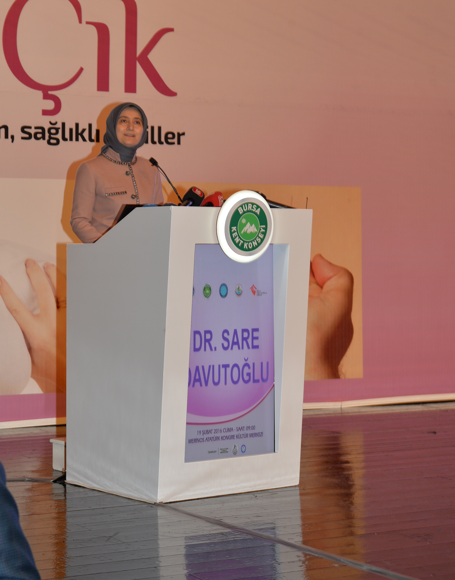Bursa’dan başlatılan ‘Doğumuna Sahip Çık’ projesine destek olan Başbakan Ahmet Davutoğlu’nun eşi Dr. Sare Davutoğlu, konuşmasında, hem adı hem de içeriğiyle anlamlı bir projenin gerçekleştiğini söyledi. Bu proje için çok heyecanlandığını ifade eden Dr. Davutoğlu, “Doğum, çok özel bir durum. Doğum yolculuğunun çok güzel hatıralarla anılması, hem bebeğin hem de annenin bu durumdan güçlenerek çıkması önemli. Bu projenin Bursa’dan başlatılmasını da önemsiyorum” dedi.