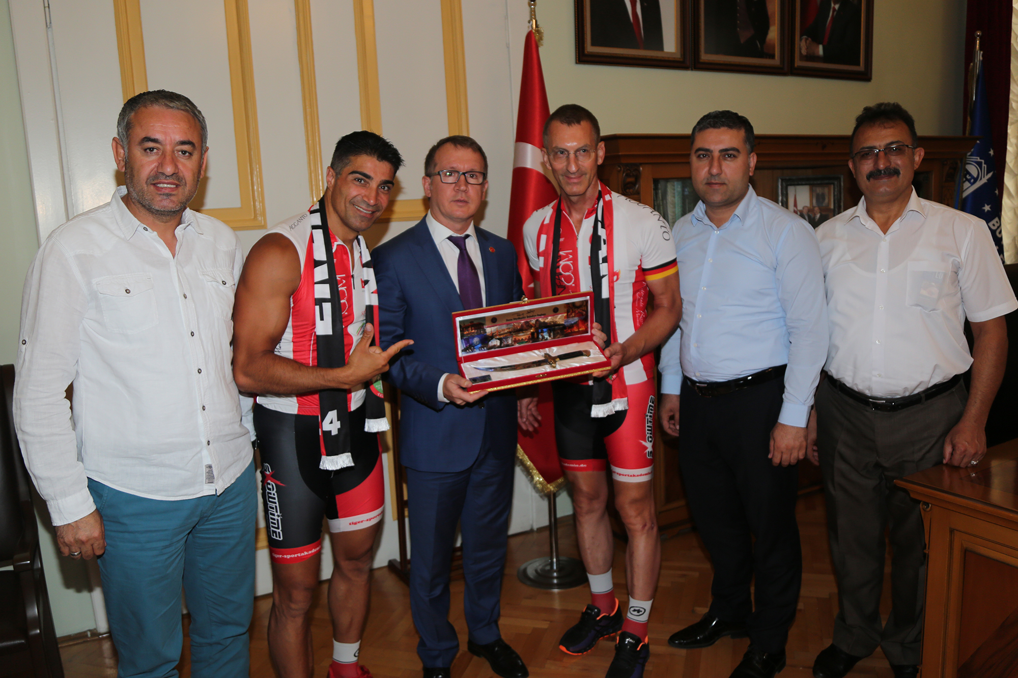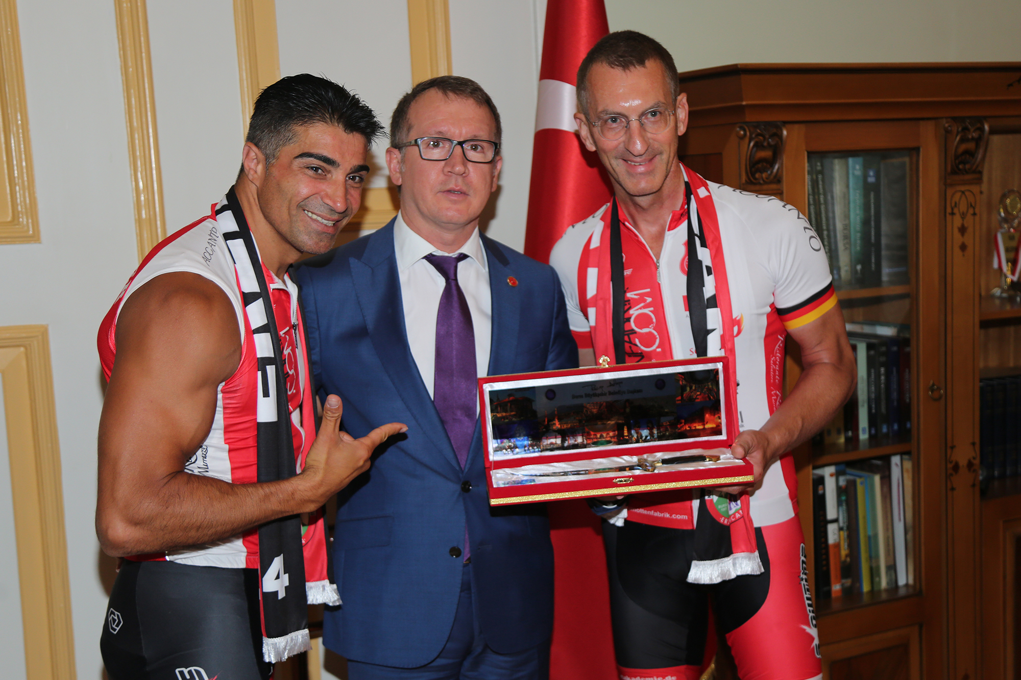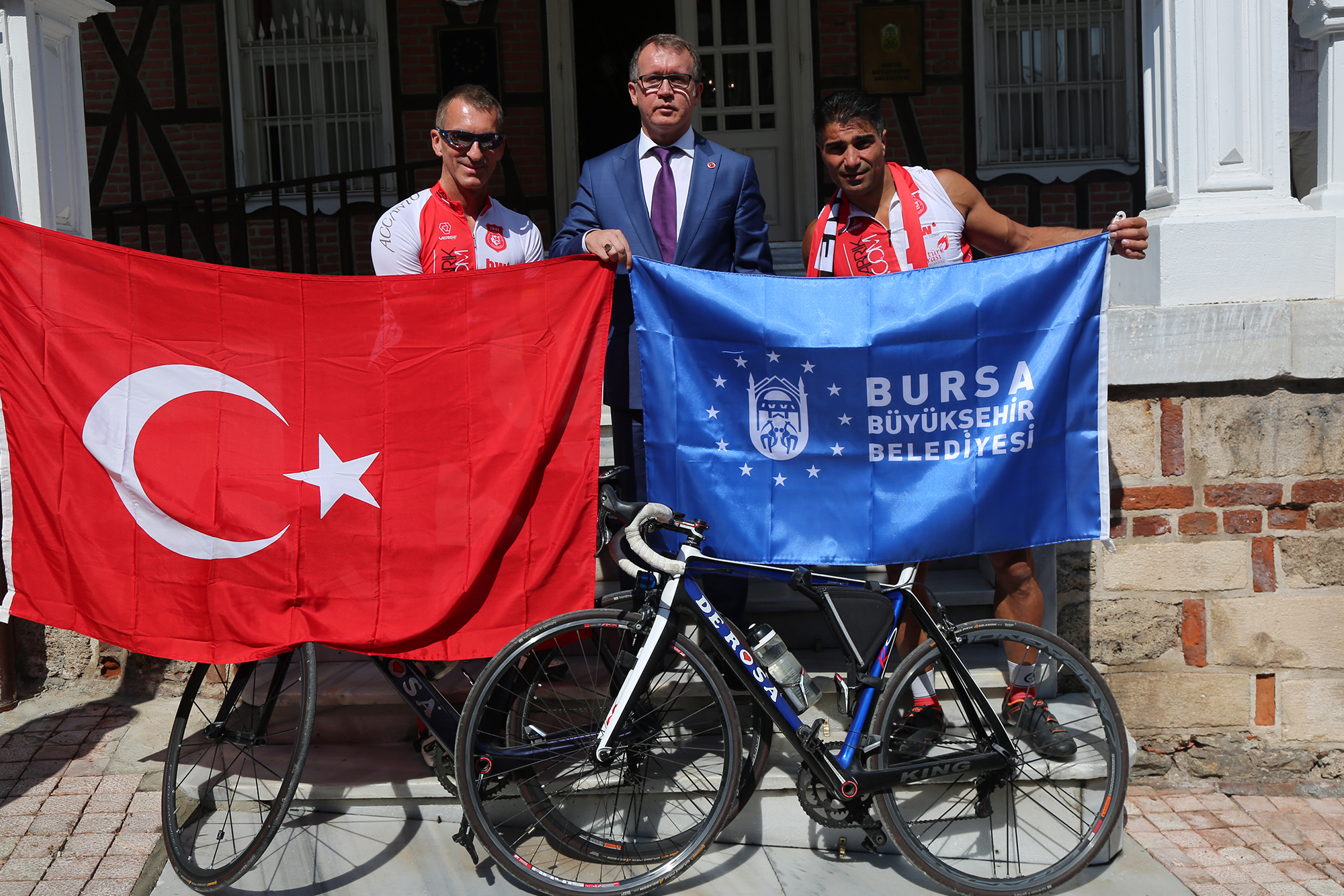 Dünyaca ünlü kick boks şampiyonu Erzincanlı sporcu Gökhan Arslan, Almanya ve Türkiye arasında, barış ve dostluk köprüsü kurmak amacıyla Alman Serbest Mali Müşavir Möhl Christoph ile birlikte Bursa’dan Erzincan’a kadar bisikletle gidecek. Gökhan Arslan, Alman dostu Christoph Möhl ile birlikte Bursa’dan Erzincan’a uzanan bisiklet yolculuğu öncesinde Bursa’da Büyükşehir Belediyesi Başkanvekili Abdülkadir Karlık ile bir araya geldi. Bursa Erzincanlılar Kültür ve Dayanışma Derneği tarafından ‘Etnik Kimliklerin Kardeşliği ve Dostluğu’ adıyla düzenlenen aktivitede Bursa’dan Erzincan’a bisiklet kullanacak olan Arslan ve Möhl, Türk Bayrağı’nı Başkanvekili Karlık’tan teslim alarak, dostluk için pedal çevirmeye Büyükşehir Belediye Tarihi Belediye Binası önünden başladı. Karlık, sporcuların adımının önemine dikkati çekerek, “Türk – Alman dostluğuna katkı sağlayacak olan projeye imza attığınız için tebrik ediyorum. Duyarlı bir hareketin temelinde kardeşlik ve dostluk niyeti var. Hepimizin istediği de bu, tüm dünyada barış ve huzur olsun… Bursa Büyükşehir Belediyesi olarak her zaman yanınızdayız” dedi.