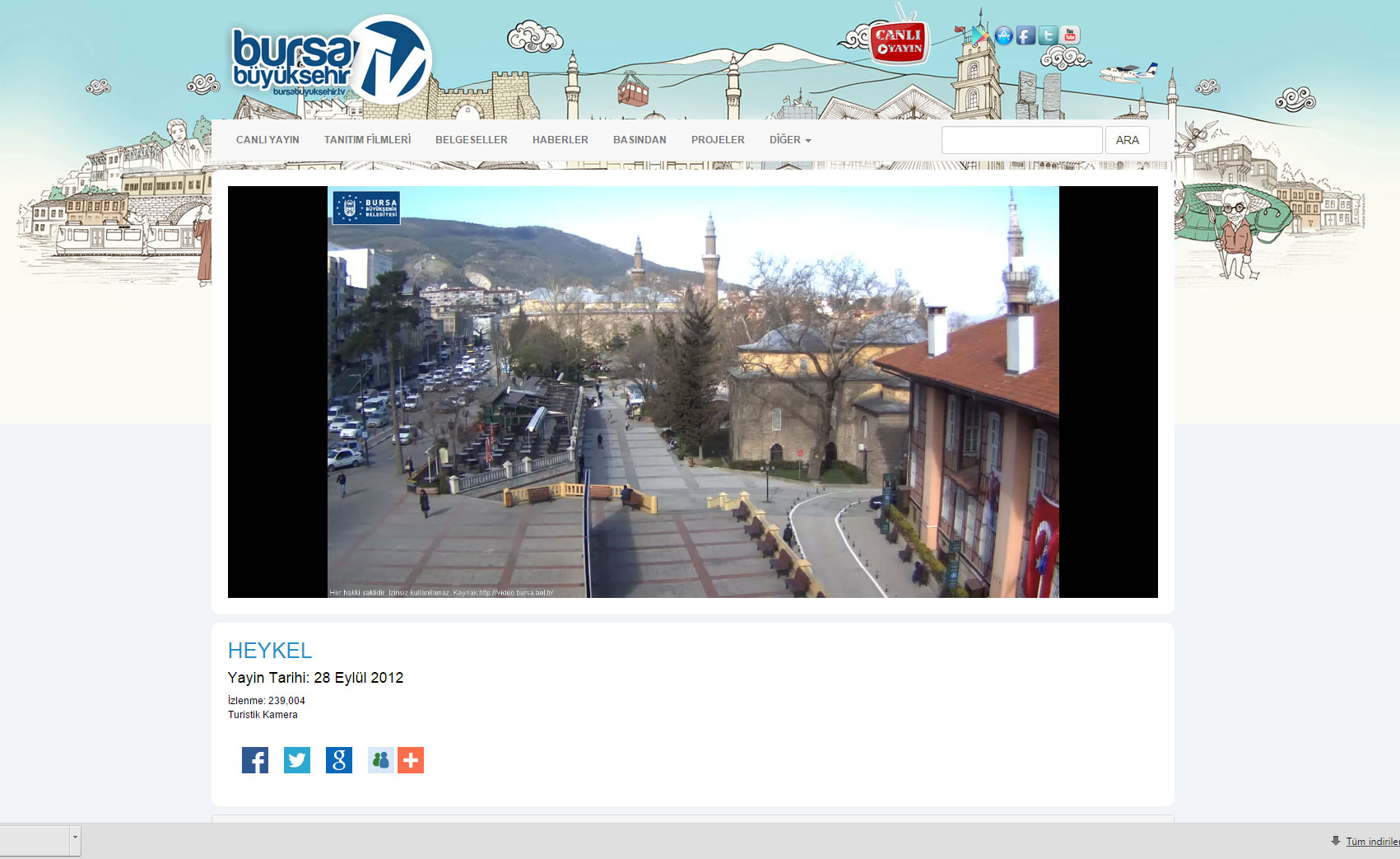 Bursa’da hem şehir içi trafiğin görüntülenerek trafiğe çıkacak sürücülere yol durumu hakkında bilgi vermek, hem de tarihi ve turistik mekanlarının tanıtımı amacıyla Büyükşehir Belediyesi Bilgi İşlem Dairesi Başkanlığı tarafından 2012 yılında iki kamerayla başlatılan canlı yayın hizmeti, bugün 54 ayrı noktaya ulaştı. Dünyanın 115’i aşkın ülkesinden ayda yaklaşık 2 milyon kişi tarafından ziyaret edilen yayınların, Türkiye’den sonra Almanya, Fransa, İngiltere, İsviçre ve Amerika Birleşik Devletlerinden yoğun olarak takip edildiği gözlendi.