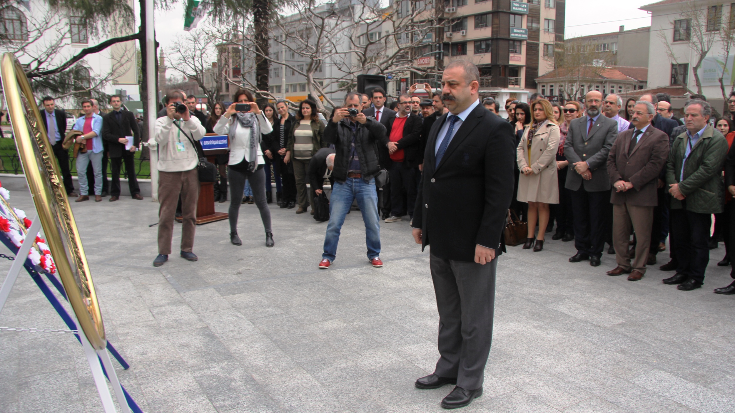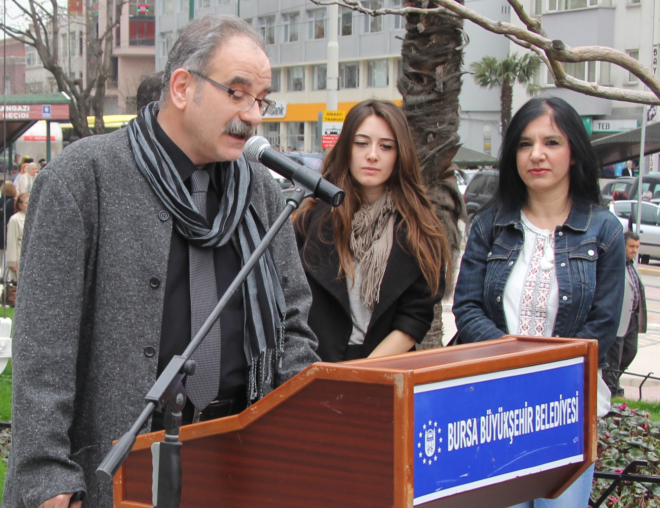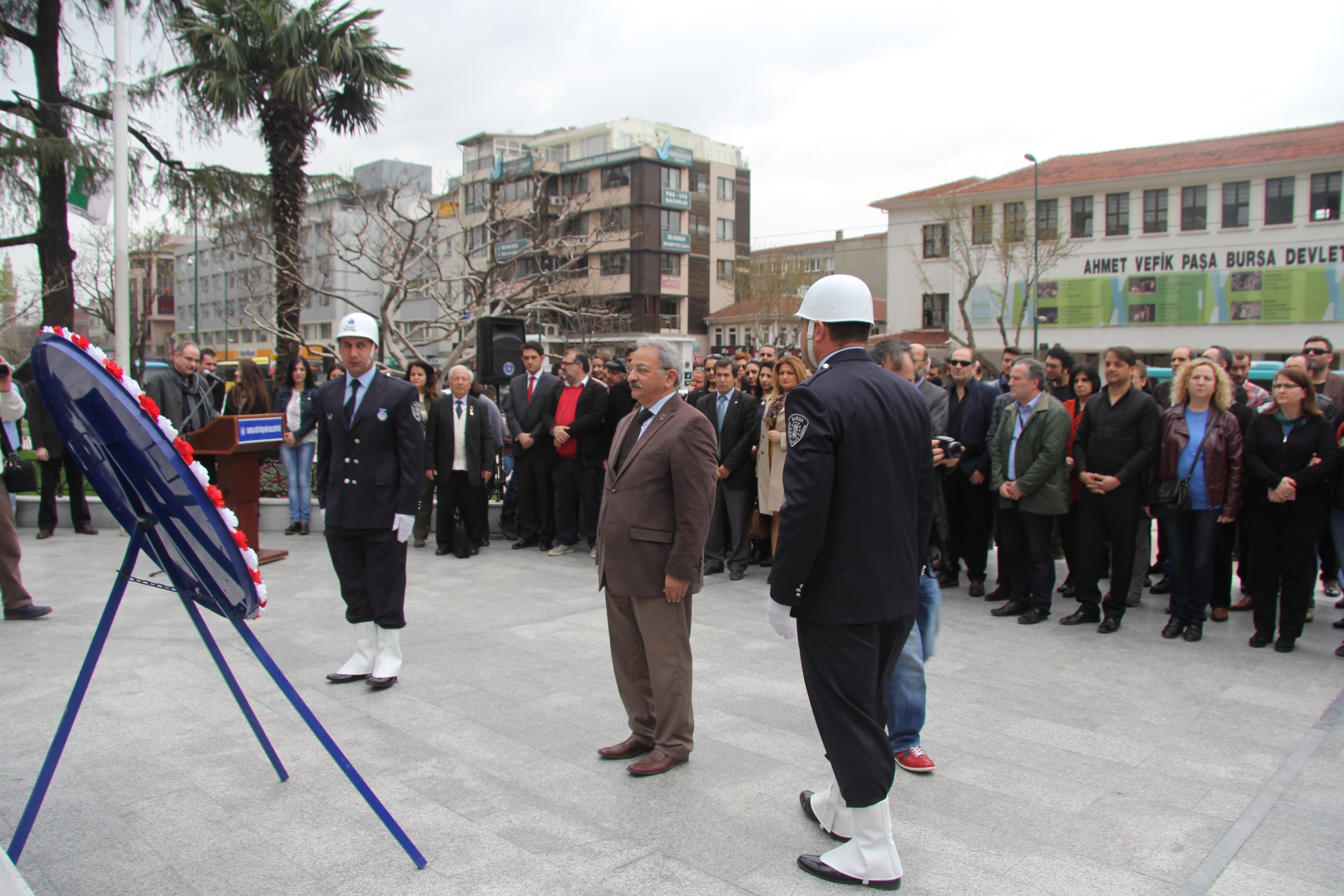 Büyükşehir Belediyesi Bandosu eşliğinde İstiklal Marşı’nın okunmasıyla başlayan törende, Atatürk Anıtı’na çelenk sunuldu. Büyükşehir Belediyesi Şehir Tiyatrosu Genel Sanat Yönetmeni Ertan Akman ve Bursa Devlet Tiyatrosu Müdürü Ömer Naci Topçu, konuşmalarıyla anlamlı günün değerine ve önemine dikkati çekti.