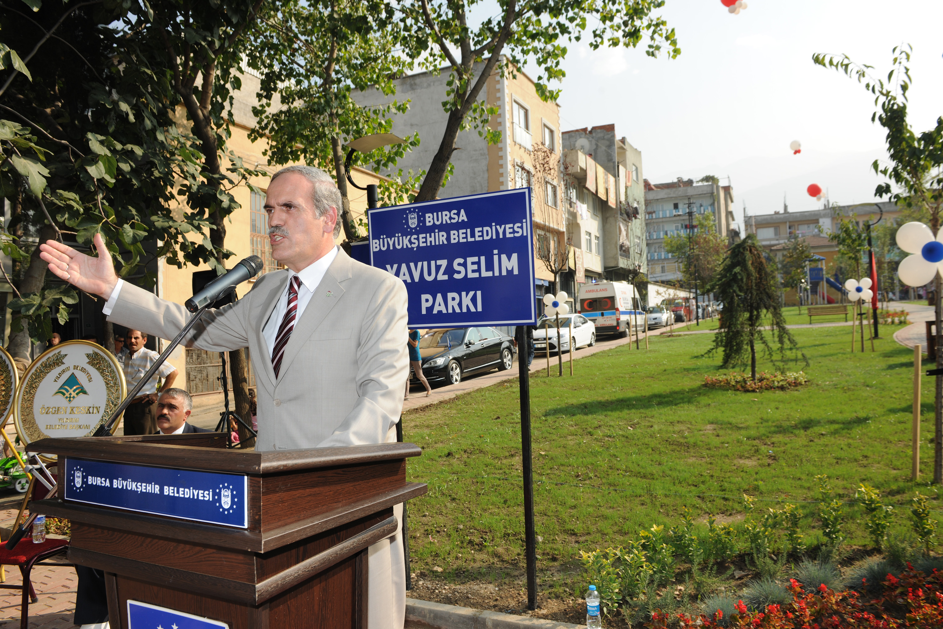 Büyükşehir Belediye Başkanı Recep Altepe, Yavuzselim Parkı’nın hizmete açılışı için düzenlenen törende, kentin batısı ile doğusu arasındaki hizmet farklılıklarını ortadan kaldırmayı amaçladıklarını söyledi. “Yönümüzü önemli ölçüde doğuya çevirdik” diyen Başkan Altepe, “Bu nedenle programda olmamasına rağmen Bursaray doğu hattında çalışmaları başlattık, İnşallah önümüzdeki yaz ortalarında seferler başlayacak. Bursa’nın Ankara girişini tamamen değiştirecek projeleri hazırlıyoruz. Tüm köşe noktalarda modern konut alanları rezidanslar olacak. Hemen Ankara yolu üzerinde bulunan Hanımlar Lokalini tamamladık, önümüzdeki günlerde hizmete açacağız. Yine içinde yüzme havuzu, spor salonu ve futbol sahaları bulunan Şahin Başol Spor Kompleksi tamamlanmak üzere. Sağlık Parkı’nı hizmete açmıştık. Halkımıza nefes alacağı daha fazla alanlar oluşturmak için tüm alanları değerlendiriyoruz. Burada olduğu gibi Yüksek İhtisas Hastanesi üzerindeki BUSKİ deposunun bulunduğu 10 bin metrekarelik alan Eğitim Mahallesi’ndeki 5 bin metrekarelik alanda da çalışmalarımız sürüyor. Vakıf Mahallesi’nde belirlediğimiz yaklaşık 300 bin metrekare alanı da botanik park olarak Yıldırım’a kazandırıyoruz. Bir taraftan resmi işlemleri sürerken, bir taraftan biz çalışmaları başlattık. Orayı da önümüzdeki halkımızın buluşma noktası haline getirmeyi amaçlıyoruz” diye konuştu.