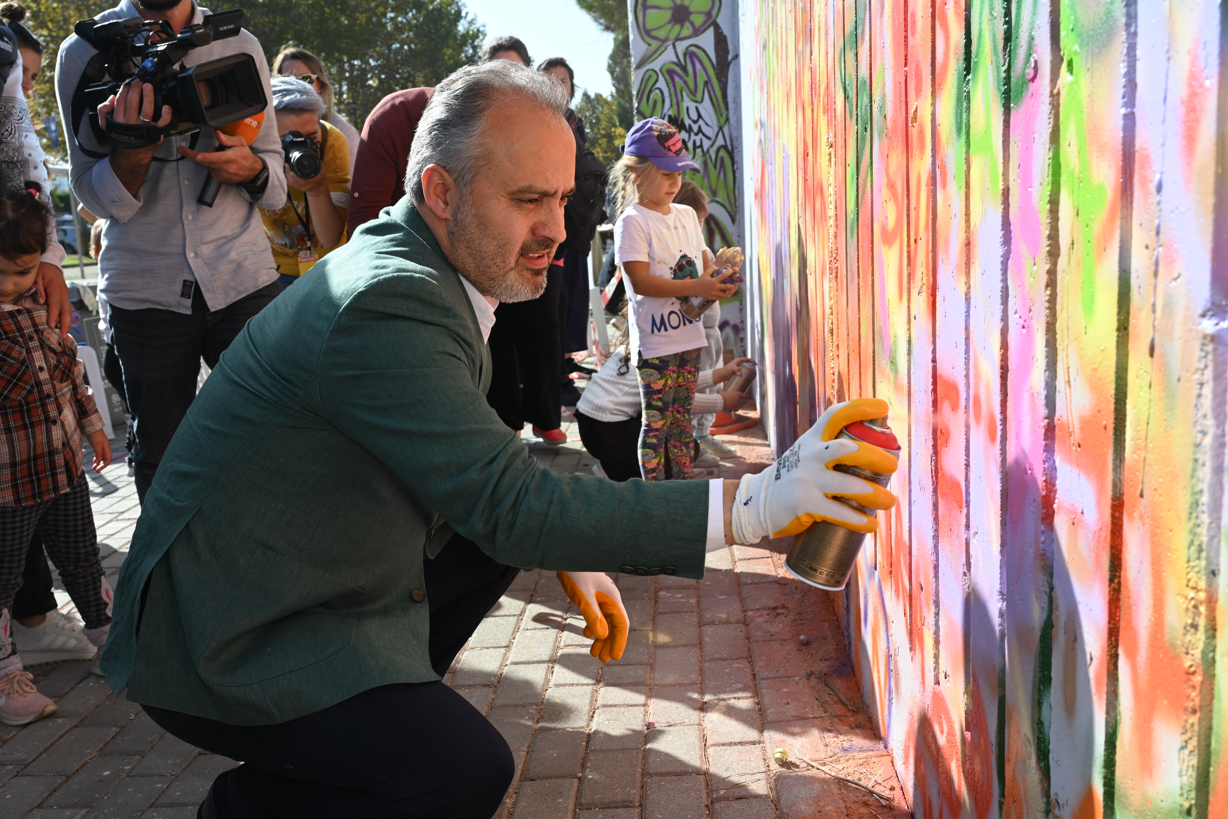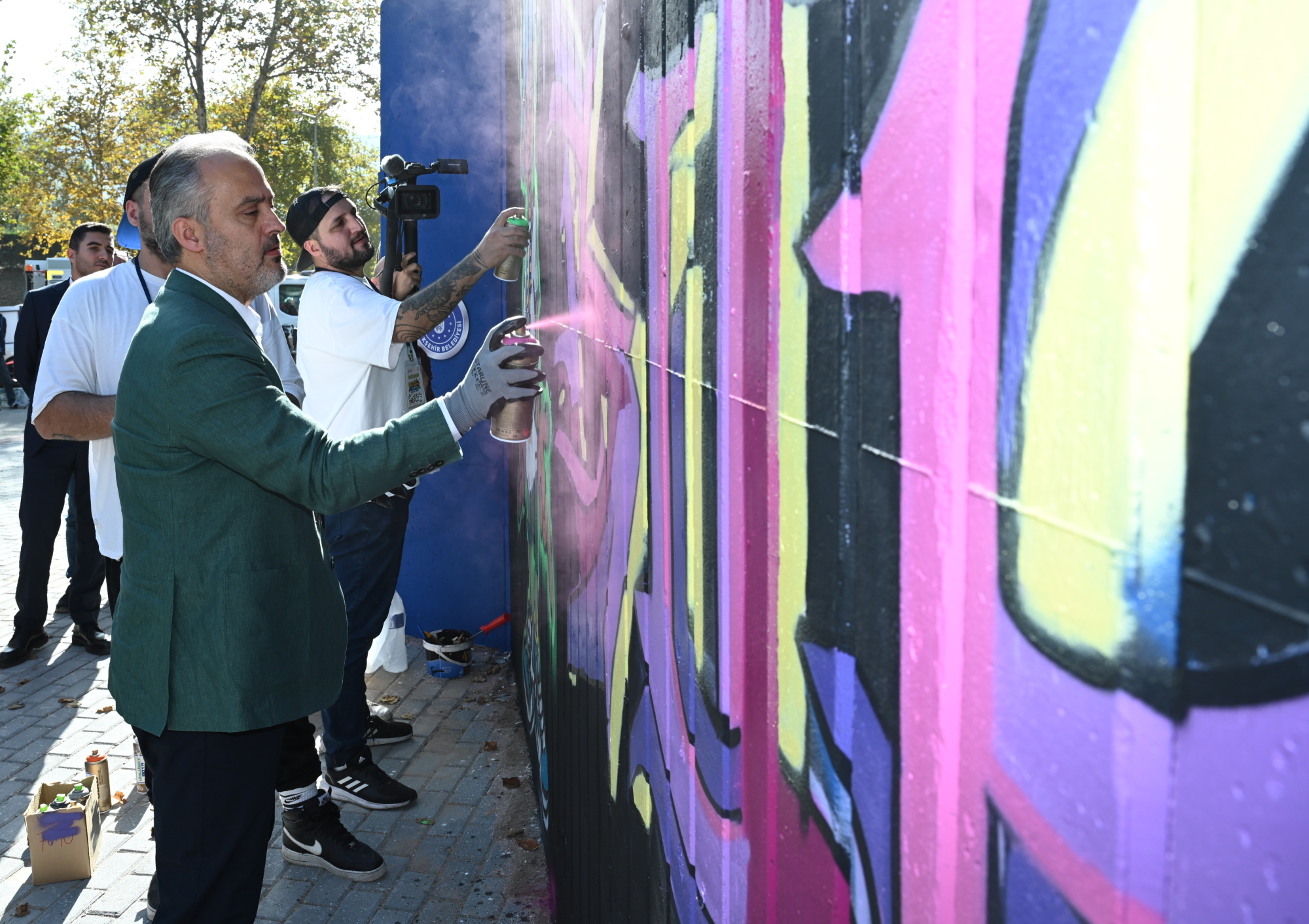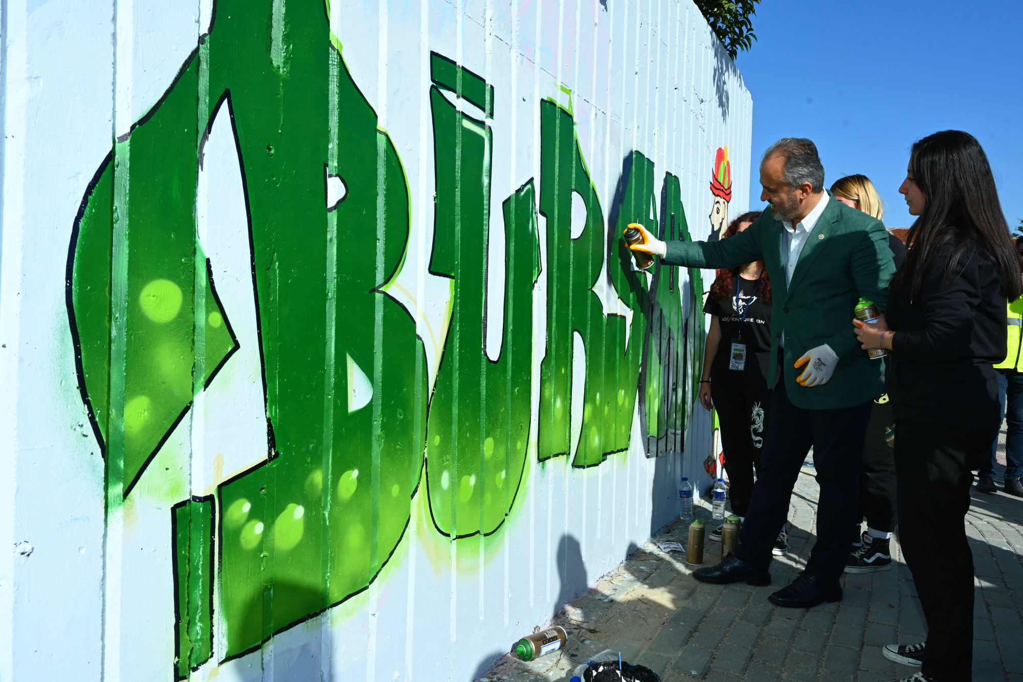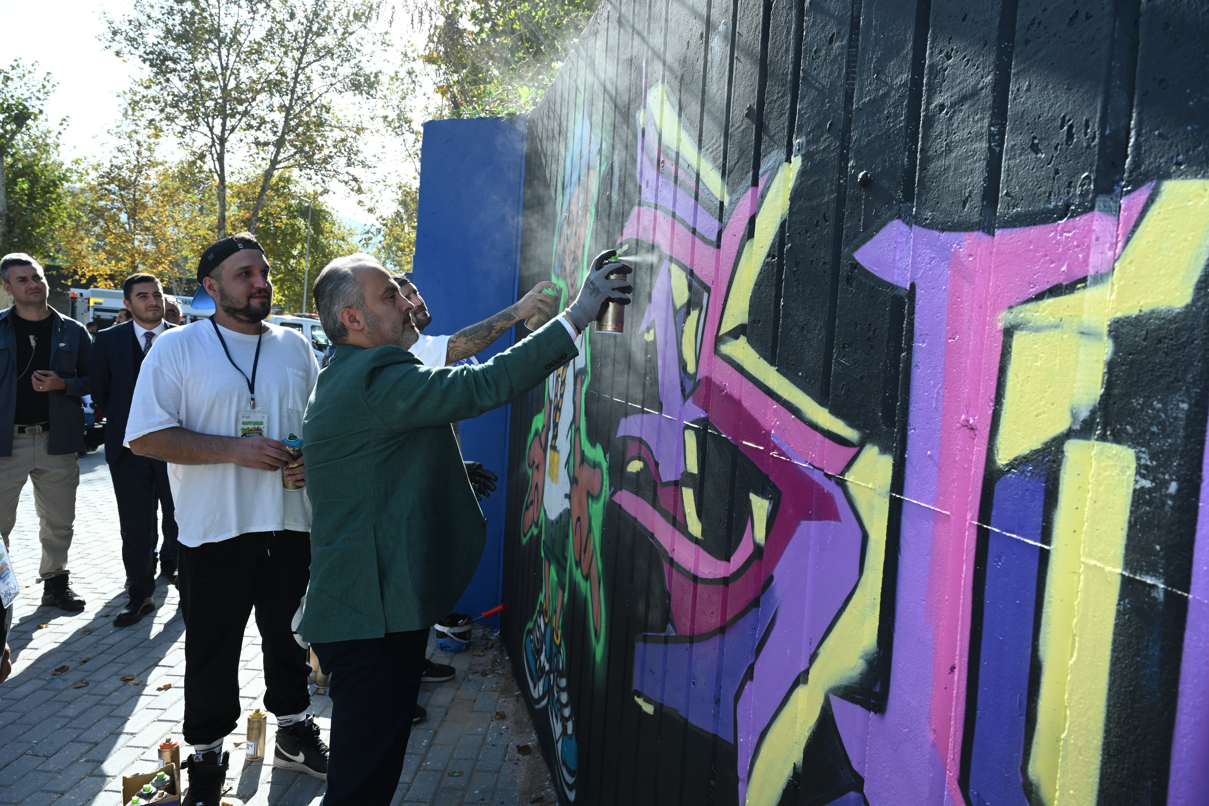 Bursa Büyükşehir Belediye Başkanı Alinur Aktaş da şenlik alanına gelerek, sprey boya ile hünerlerini sergileyen vatandaşlarla sohbet etti. Kendisi de eline eldiven giyip, sprey boya ile duvarlara iz bırakan Başkan Aktaş, profesyonel sanatçıların eserlerini hayranlıkla izleyip, çalışmalarından dolayı kutladı. Bursa’da farkındalık oluşturacak bir etkinliğe daha imza attıklarını belirten Başkan Aktaş, “Başta çocuklarımız ve gençlerimiz olmak üzere, toplumun tüm kesimlerini farklı etkinlik ve aktivitelerle buluşturuyoruz. Grafiti şenliği de bunlardan biri. Günümüzde küresel bir sanat akımı olarak anılmaya başlayan grafiti, 1990’lardan beri ülkemizde de yükselen bir değer. Grafitinin illegal değil de kontrollü şekilde şehrimize katkı sağlamasını arzu ediyoruz. Profesyoneli, amatörü, genci, yaşlısı herkes burada. O kadar harita işler yapmışlar ki her birine teşekkür ediyorum” dedi.