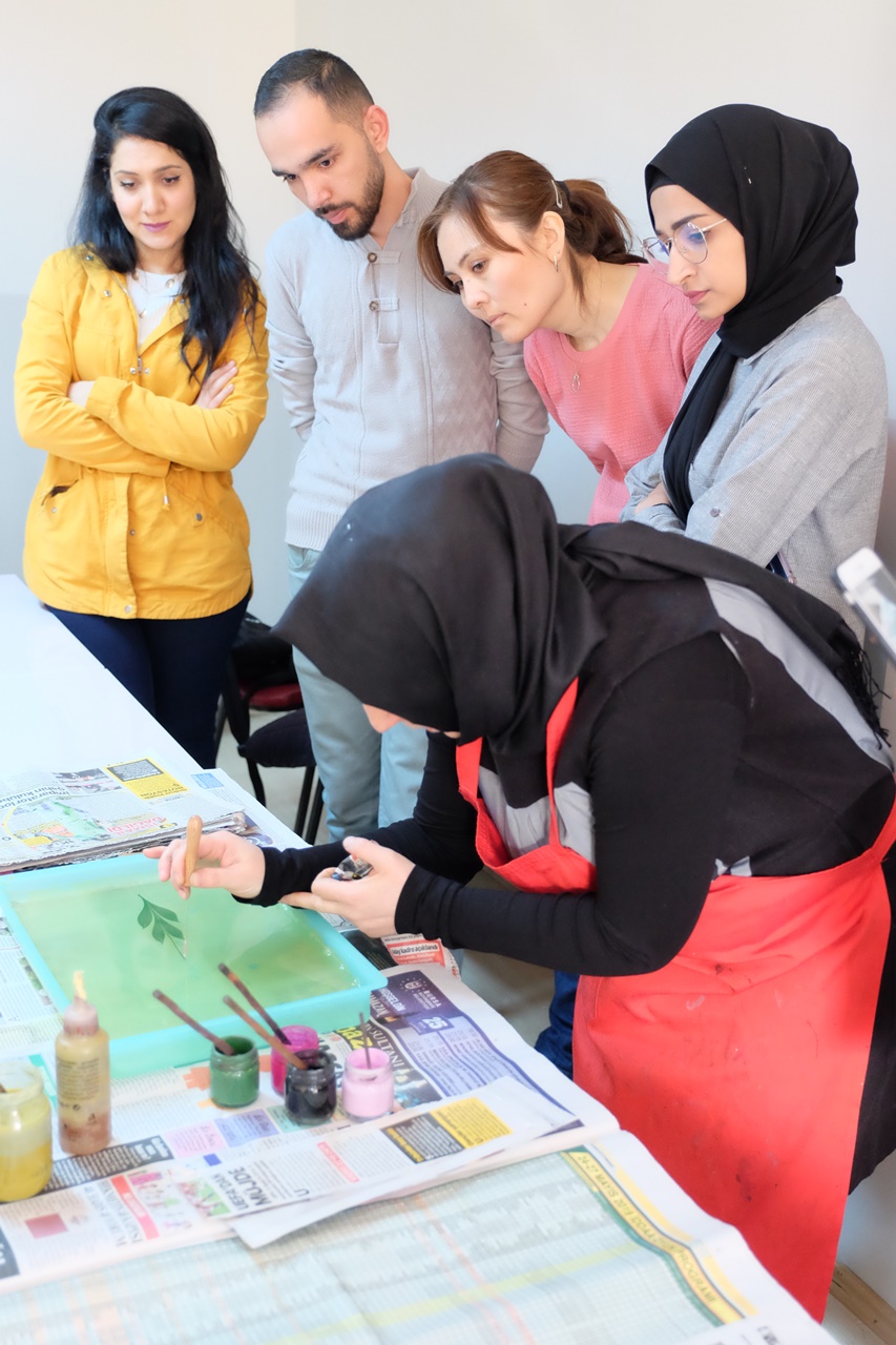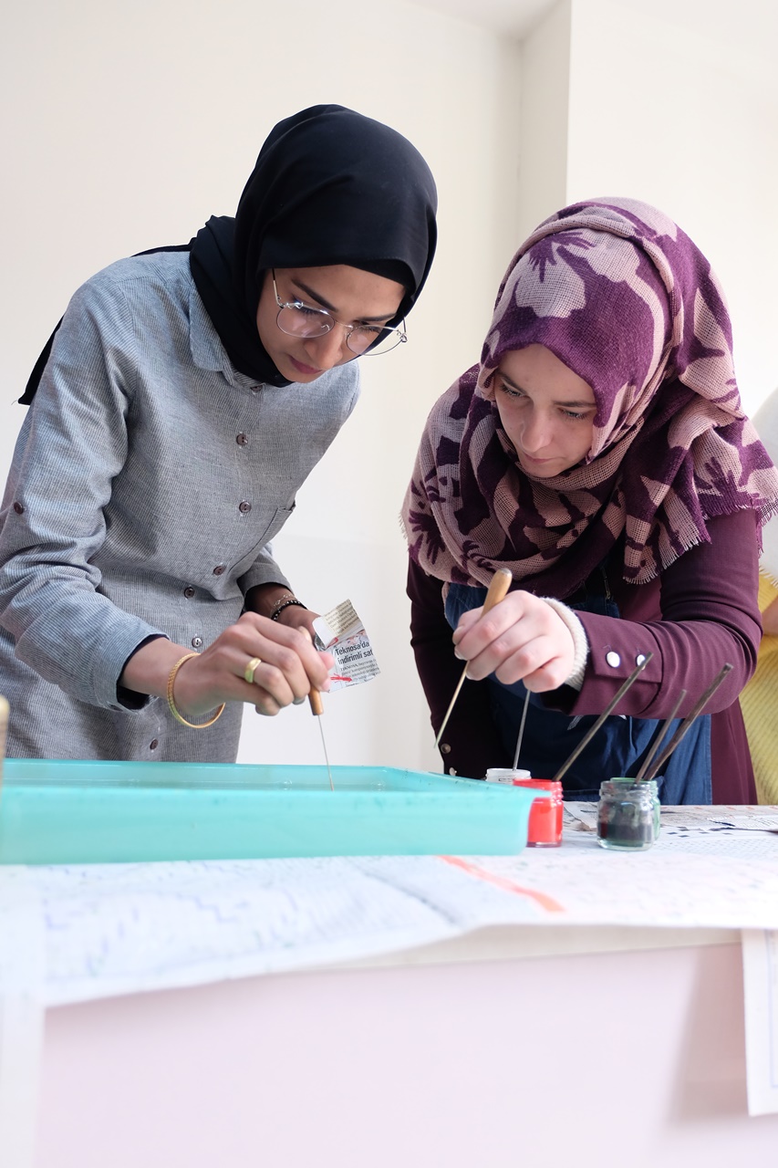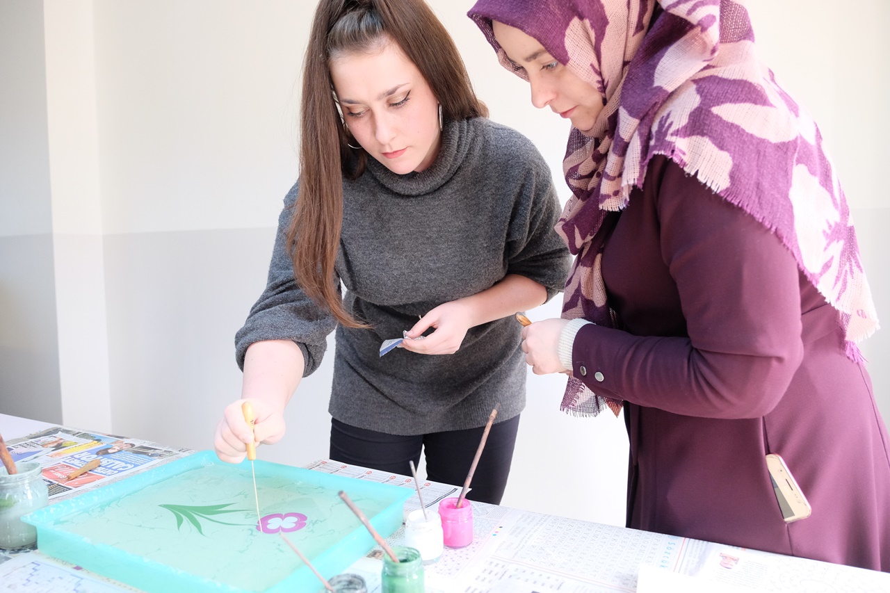 TÖMER Bursa Şubesi’nde eğitim alan tüm öğrencilerin kültürlerarası etkileşimini artırmak amacıyla düzenli olarak tarihî ve kültürel amaçlı geziler, seminerler, sergiler ve spor turnuvaları düzenleniyor. Bursa tarihi ve kültürel gezilerini tamamlayan öğrenciler Ebru Usta Öğreticisi Elif Aydın’ın hazırlamış olduğu Ebru teknelerinin başına geçtiler. Usta Öğretici Elif Aydın öncelikle Ebru sanatının tarihsel sürecinden bahsetti. Aydın, 16’ncı yüzyılda Orta Asya’dan Osmanlı Devleti topraklarına gelerek kitapların iç yüzeyini süsleyen Ebru’nun, daha sonra tablo olarak da kullanılmaya başlandığını söyledi. Ardından sırayla teknelerin başına geçen yabancı konuklar hünerlerini sergiledi. Zor bir zanaat olan ebruyu öğrenmek için büyük çaba sarf eden ziyaretçiler gün boyu süren etkinlikte keyifli anlar yaşadı.