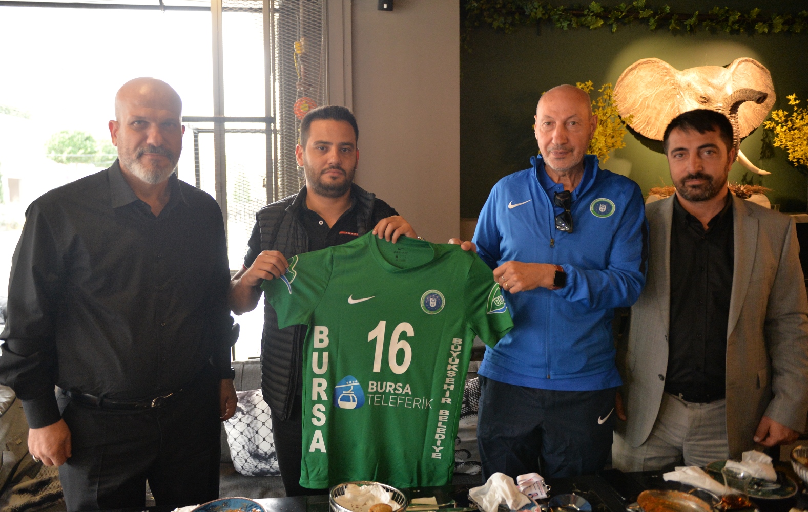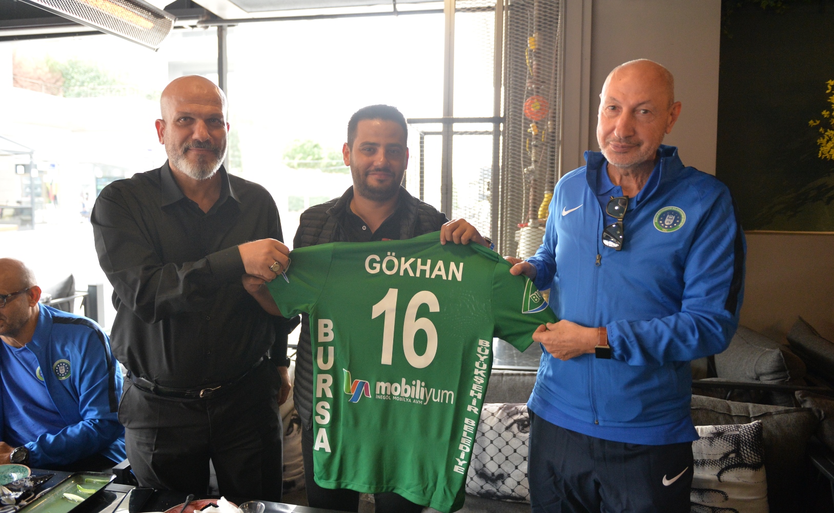 Kahvaltının ardından Büyükşehir Belediyespor Kulübü yönetim kurulu üyeleri Murat Mestan ve Muhittin Bilici, Gökhan Dinçer’e forma hediye etti.