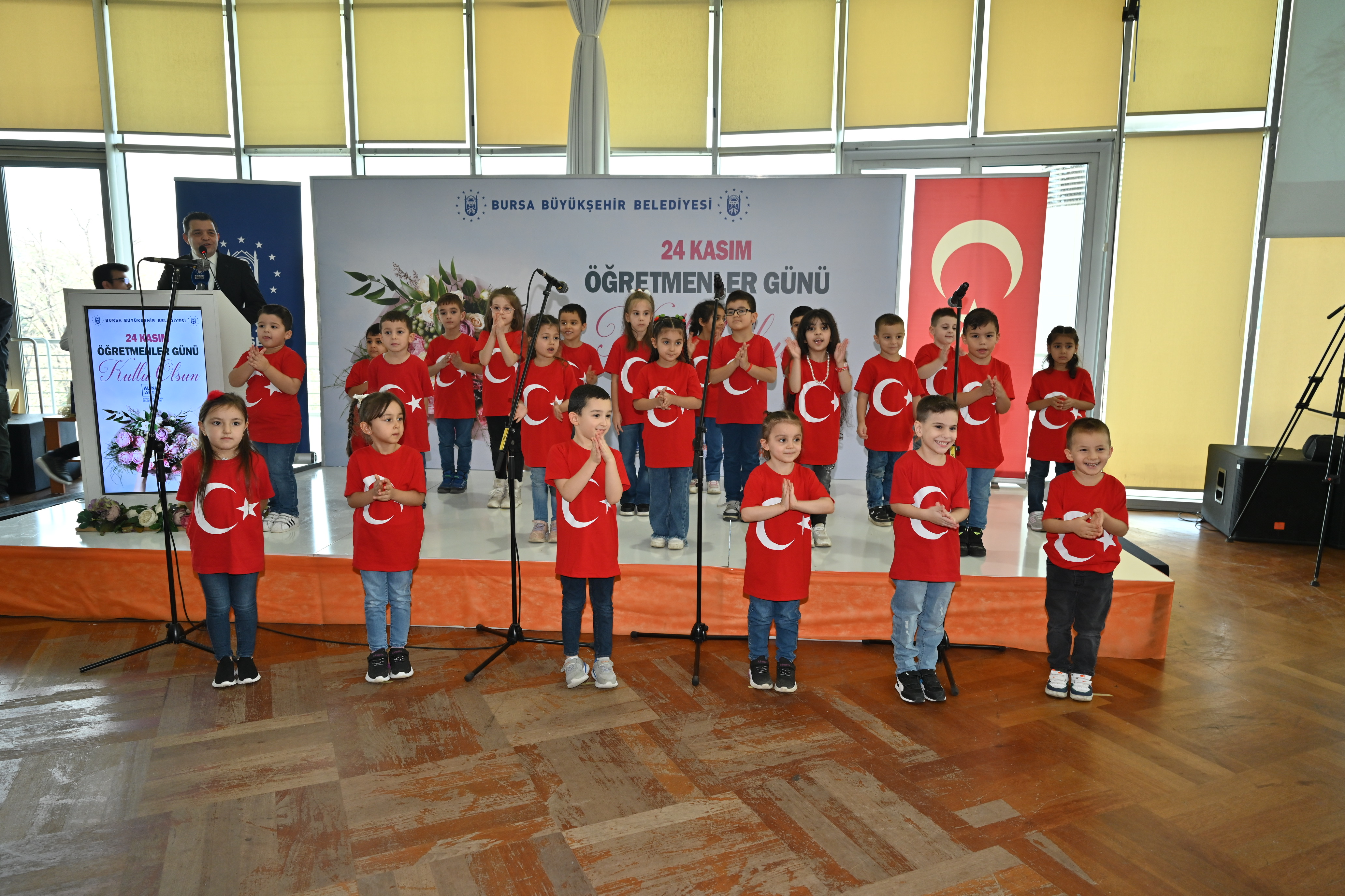 Atatürk Kongre ve Kültür Merkezi’nde düzenlenen program, Ana Kucağı Eğitim Merkezi’nde eğitim alan çocukların 24 Kasım Öğretmenler Gününe özel müzik dinletisiyle başladı. Bursa Büyükşehir Belediyesi’nin eğitim ile ilgili yatırımlarının anlatıldığı film gösterimiyle devam eden etkinliğe Bursa Büyükşehir Belediye Başkanı Alinur Aktaş, İl Milli Eğitim Müdürü Dr. Ahmet Alireisoğlu, Milli Eğitim Şube Müdürleri, Bursa Kent Konseyi Başkanı Şevket Orhan, çeşitli okullardan ve Ana Kucağı Eğitim Merkezleri’nden çok sayıda öğretmen katıldı.