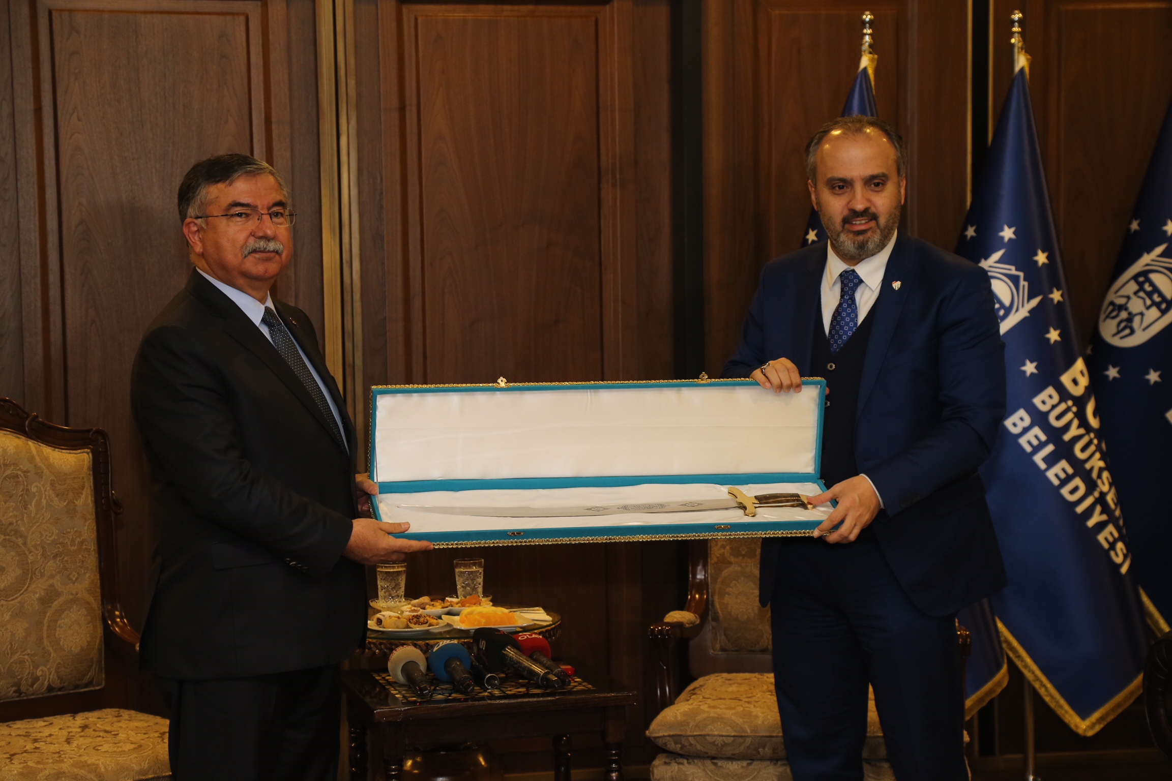 Ziyaretin sonunda Başkan Aktaş, günün anısına Bakan Yılmaz’a el yapımı kılıç hediye etti.