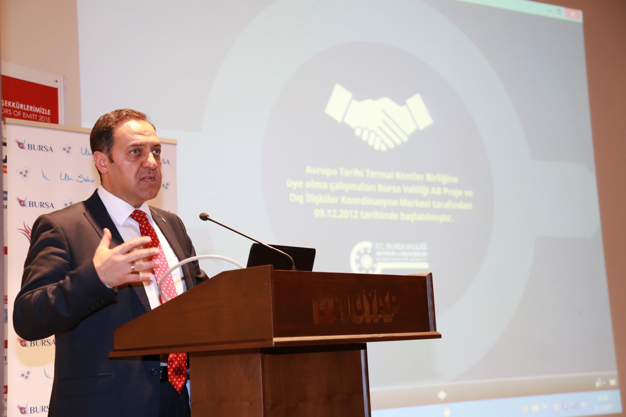 Bursa Vali Yardımcısı Ahmet Hamdi Usta da ‘Bursa’nın Avrupa Tarihi Termal Kentler Birliği’ne (EHTTA) Üyelik Süreci’ konusunda bilgiler verdi. Bursa’nın tarihi ve kültürü kadar termal değerleriyle de öne çıkan önemli bir kent olduğunu anlatan Usta, “Bursa’nın dahil olduğu termal kentler arasında dünyanın önemli ülkelerinden Budapeşte, Karlovy gibi şehirler de yer alıyor. Kentin değerlerini anlatırsınız ancak bir uluslararası birliğe üye olunduğu takdirde biz Bursa olarak gitsek de gitmesek de birlik tarafından hazırlanan kataloglarda yer alıyor oluşumuz, konuya ilgi duyanların dikkatini çekecektir. Bursa artık EHTTA’ya akreditedir ve termal şehirler listesinde adı geçen bir şehirdir. Bu gelişmelerin sonuçlarını gelecek günlerde göreceğimize inanıyoruz” dedi.