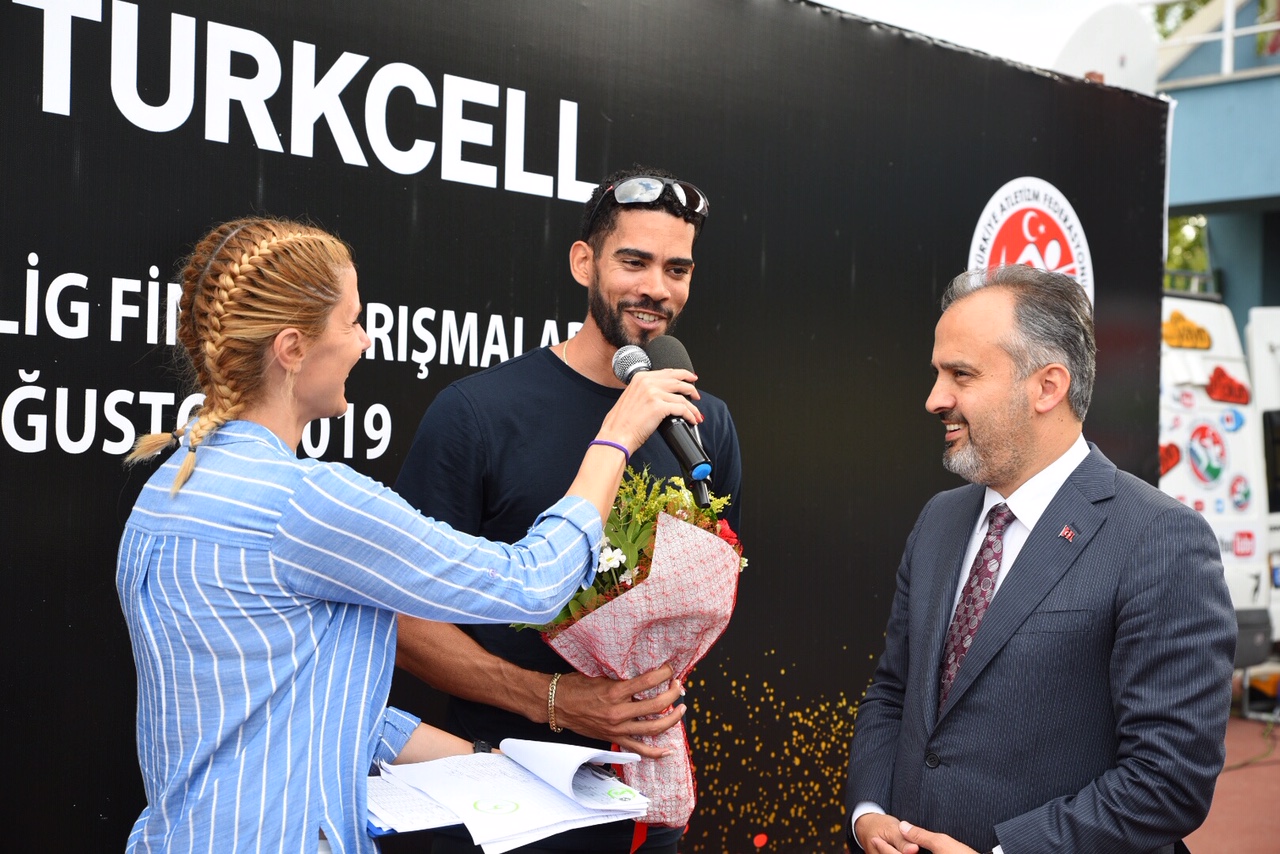 Bursa Büyükşehir Belediye Başkanı Alinur Aktaş, 400 metre engel koşusunda birinci olan milli sporcu Yasmani Capello’ya çiçek takdim etti. Başkan Aktaş ayrıca dereceye giren diğer sporcuları da tebrik etti.
