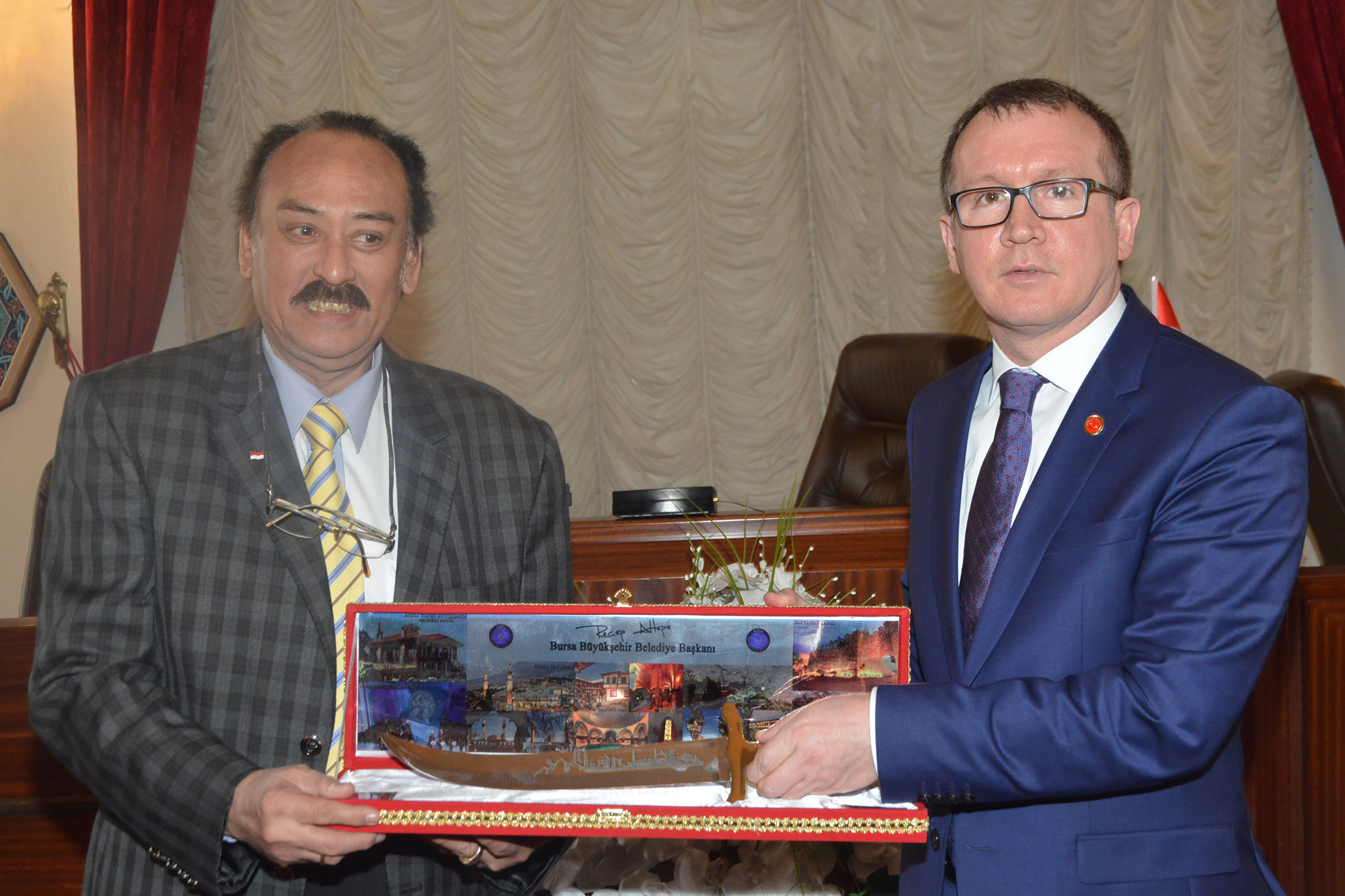 Konuşmaların ardından Başkanvekili Karlık, Endonezya Belediyeler Birliği Başkanı Deibel Effendi’ye Bursa bıçağı hediye etti.
