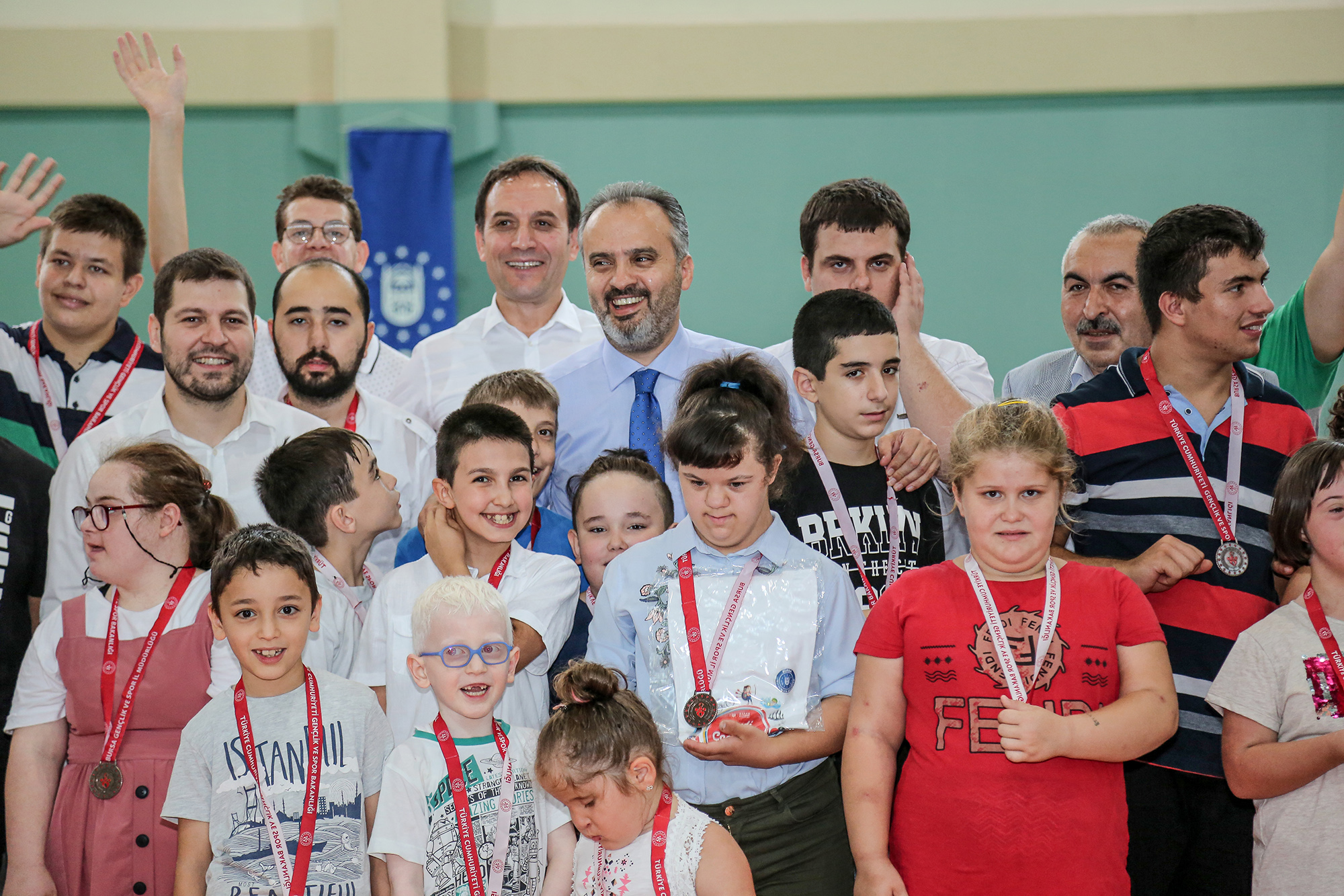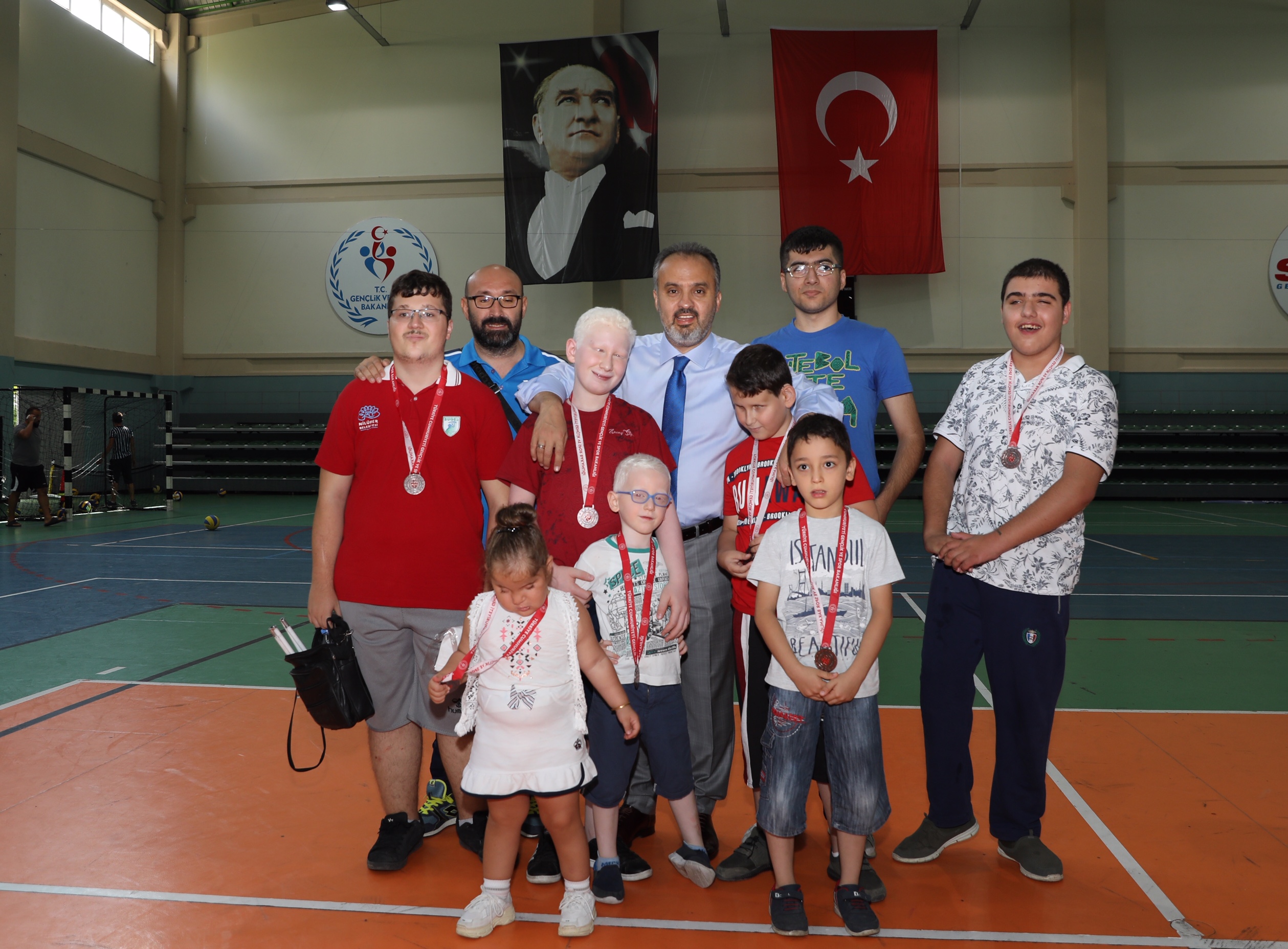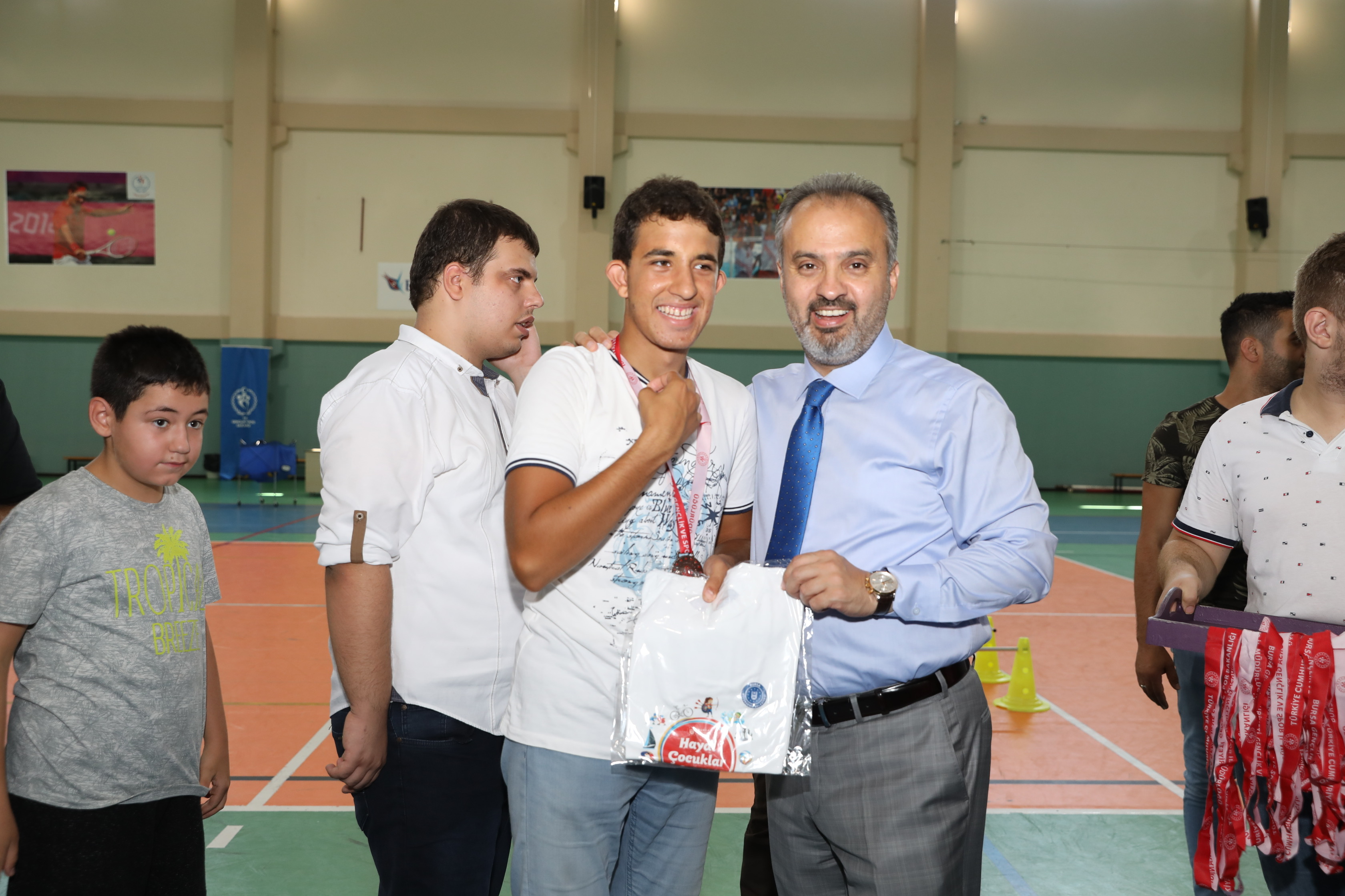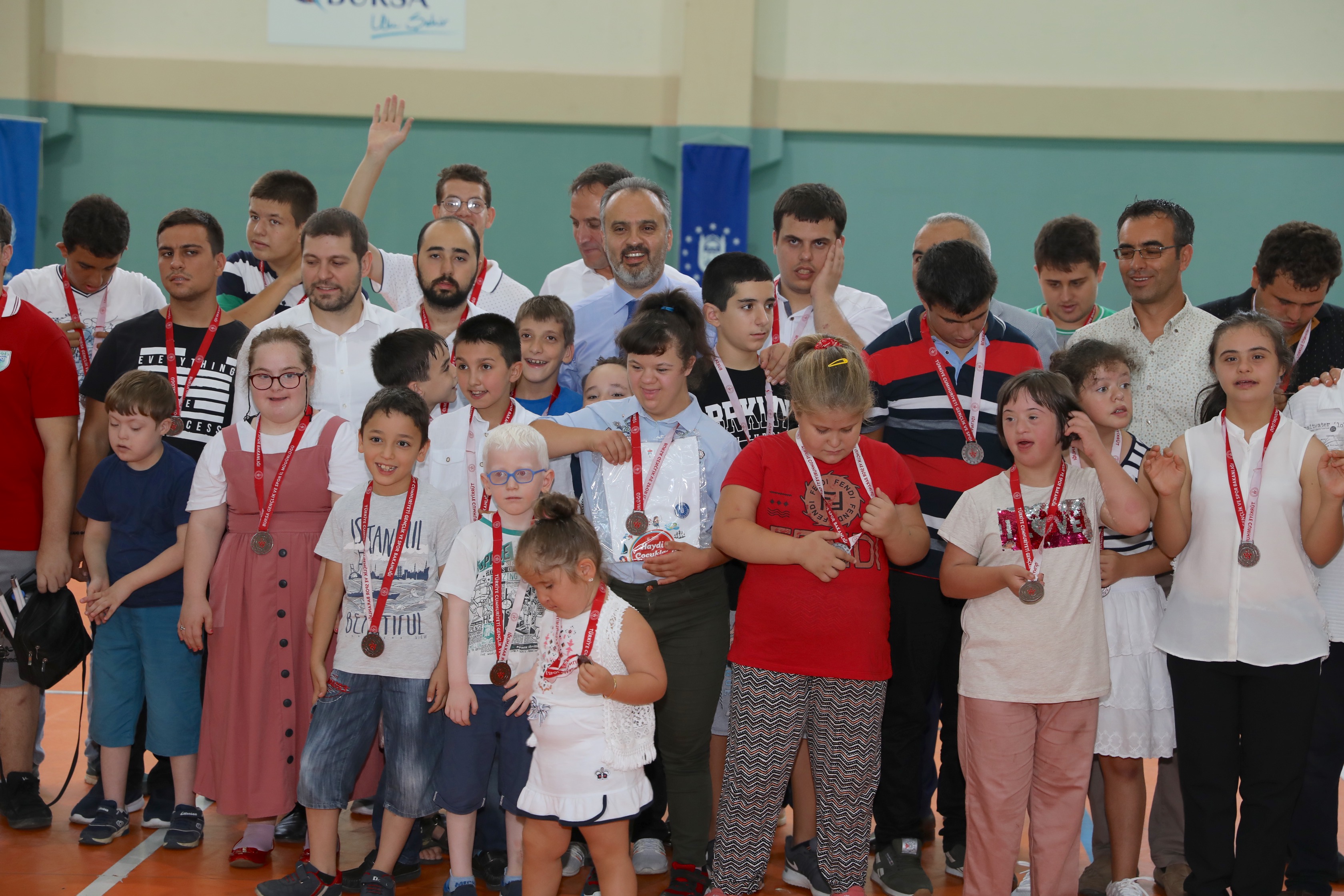 Büyükşehir Belediyesi Engelliler Şube Müdürlüğü Engelsiz Yaşam Merkezi, Gençlik Spor İl Müdürlüğü ve Osmangazi Gençlik Spor İlçe Müdürlüğü işbirliğinde düzenlenen Engelli Yaz Spor Okulları sona erdi. Yüzme, eğitsel oyunlar ve tenis branşlarındaki etkinliklere 5-30 yaş arasındaki engelli vatandaşlar katıldı. Uzman eğitimcilerin gözetiminde spor yapmanın keyfini çıkaran 80 engelli kursiyer, Atıcılar Spor Salonu’nda düzenlenen törenle madalyalarına kavuştu. Kursiyerleri bu mutlu günlerinde yalnız bırakmayan Büyükşehir Belediye Başkanı Alinur Aktaş, çocuklarla birlikte spor yaptı. Ceketini çıkaran Başkan Aktaş, hem engelli parkurunu aşıp, sepete basket attı hem de kaleye geçip, engelli çocukların attığı şutları yakalamaya çalıştı.