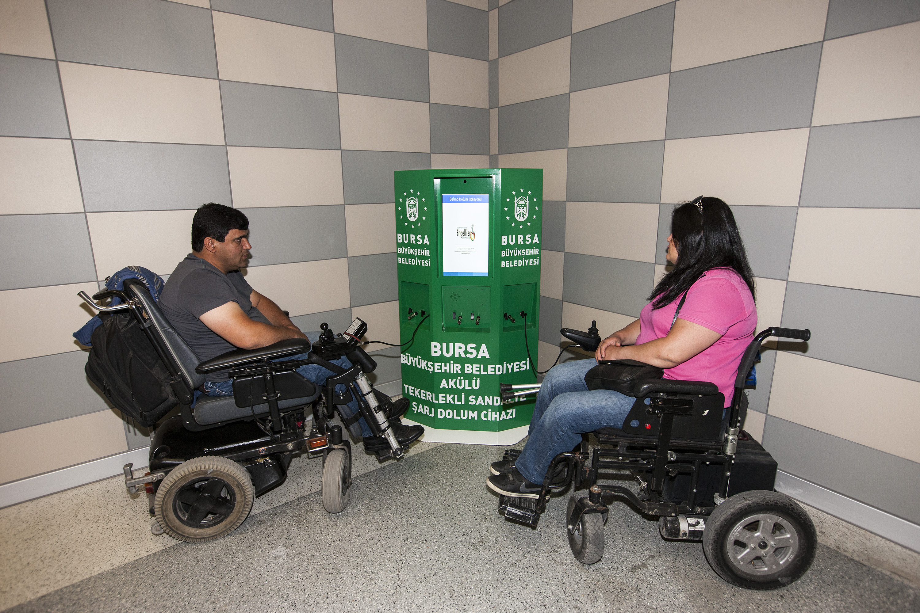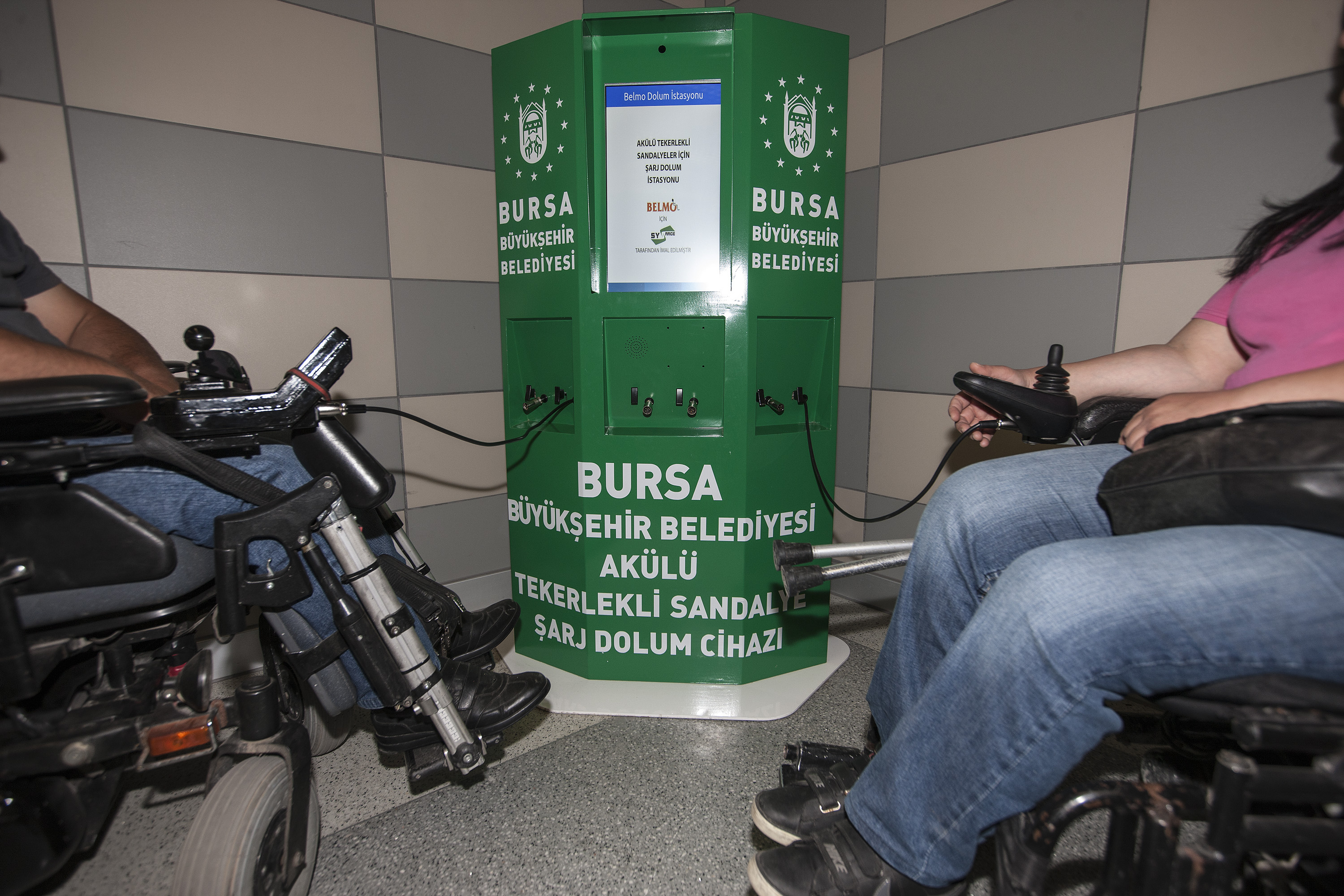 Bursa’daki kamuya açık ortak kullanım alanlarını hasta, yaşlı, çocuk ve engellilerin kolay kullanımı için yeniden dizayn eden Büyükşehir Belediyesi, özellikle akülü tekerlekli sandalye kullanan engelli vatandaşların yaşadığı önemli bir sorunu daha çözümü kavuşturdu. Şehir merkezinde gezerken, araçlarının şarjı bittiği için evlerine dönmek zorunda kalan engelli vatandaşlar için Bursaray Şehreküstü istasyonu geçiş turnikelerinin bulunduğu alana, akülü tekerlekli sandalyeler için şarj aleti konuldu. Aynı anda 6 aracı şarj edebilen cihaz sayesinde, engelli vatandaşların önemli bir sorunu daha ortadan kaldırılmış oldu.