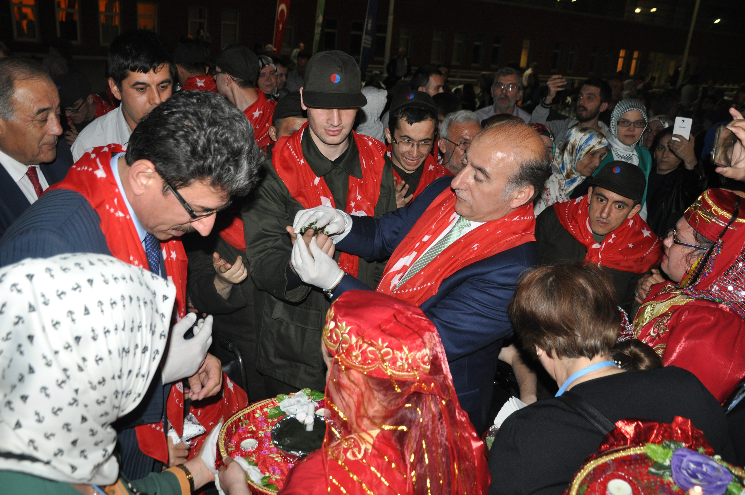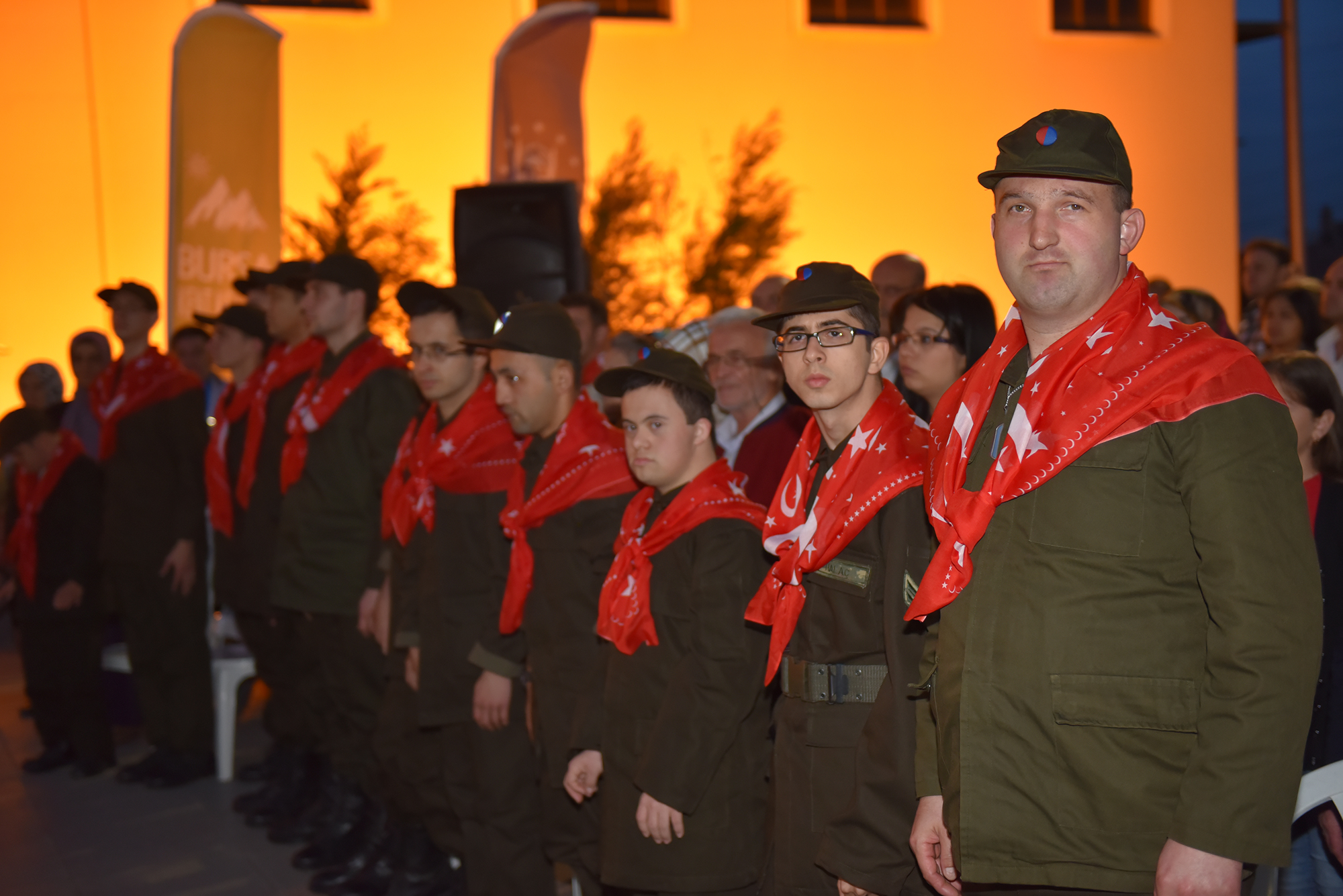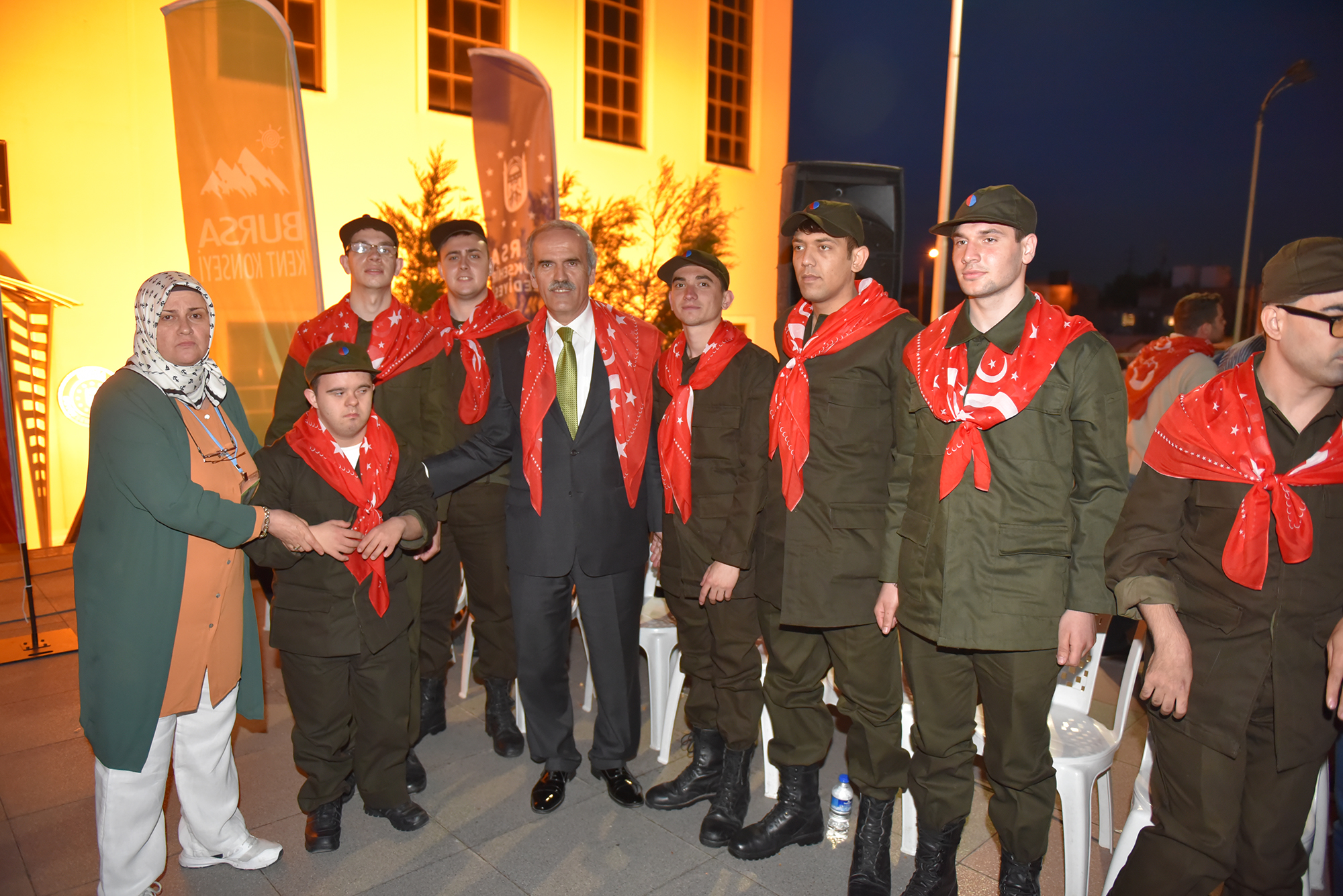 Bursa Kent Konseyi Engelliler Meclisi, zihinsel ve fiziksel engelleri dolayısıyla yaşıtları gibi askere gidemeyen engelli bireylerin, vatani görevlerini yerine getirebilmeleri için başlatılan ‘1 günlük askerlik uygulamasından yararlanan 110 engelli genç için kına eğlencesi düzenledi. Atatürk Kongre Kültür Merkezi (Merinos AKKM) Açık Otopark alanındaki geceye, Büyükşehir Belediyesi Başkanı Recep Altepe, Bursa Kent Konseyi Başkanı Hasan Çepni, Büyükşehir Belediyesi yöneticileri, Bursa Kent Konseyi Başkan Yardımcısı Lütfi Taşcı, Yerel Gündem Şube Müdürü Mahmut Turunç engelli derneklerinin temsilcileri ve engelli aileleri katıldı. Dev Türk bayrağı altında ve meşaleler eşliğinde alana gelen engelli askerler, Büyükşehir Belediye Bandosu’nun çaldığı marşlar eşliğinde yürüdü. Engelli genç kızlarında en önde kına tepsilerini taşıdığı program, saygı duruşu ve İstiklal Marşı’nın okunmasıyla başladı. Ailelerin duygusal anlar yaşadığı programda, Bursa Kent Konseyi Başkanı Hasan Çepni ve Başkan Yardımcısı Lütfi Taşcı tarafından gençlerin ellerine kınalar yakıldı.