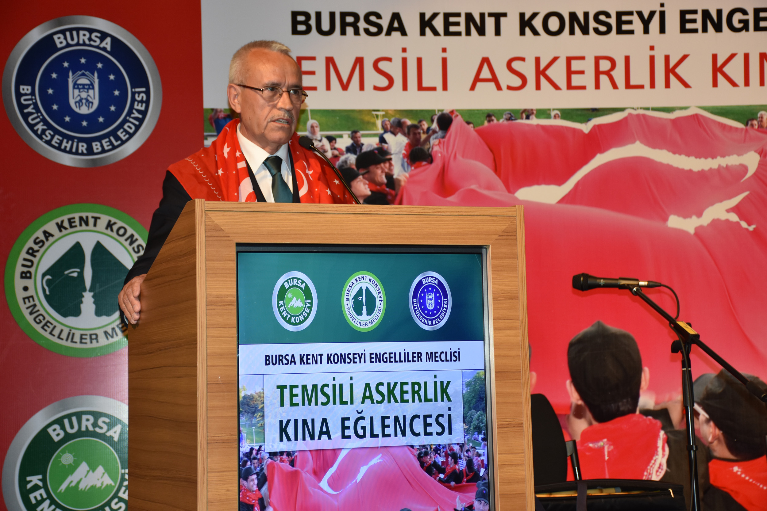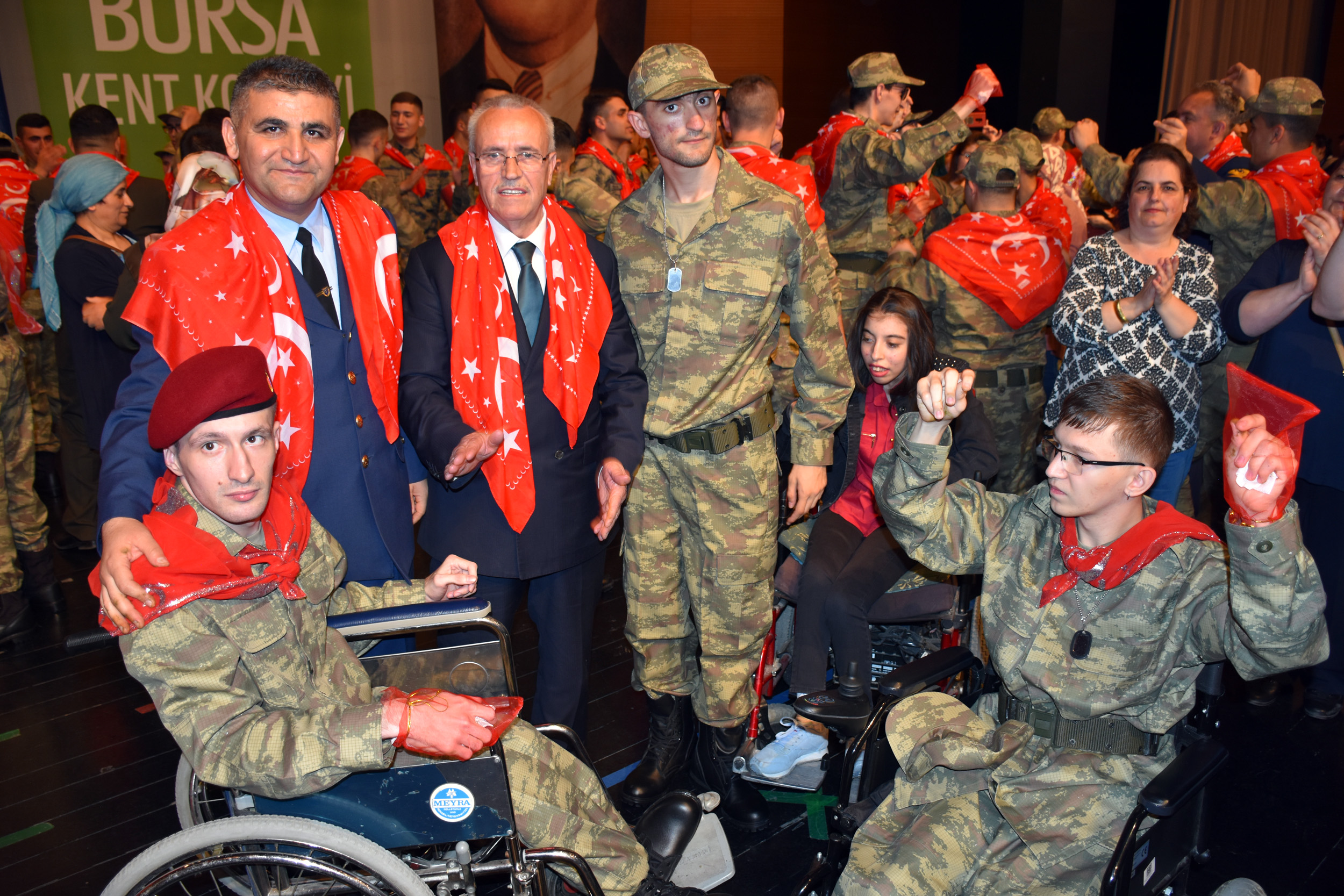 Zihinsel ve fiziksel engelleri nedeniyle yaşıtları gibi askere gidemeyen bireylerin vatani görevlerini yerine getirebilmeleri için başlatılan 1 günlük askerlik uygulamasından yararlanan 80’den fazla engelli birey, Bursa Kent Konseyi Engelliler Meclisi’nin organize ettiği kına gecesiyle askere uğurlandı. Merinos Atatürk Kongre Kültür Merkezi (Merinos AKKM) Orhangazi Salonu’nda düzenlenen programa Bursa Merkez Komutanı Topçu Albay Gürkan Çankaya, Bursa Kent Konseyi Başkanvekili Şuayip Toprak, Yerel Gündem Şube Müdürü Mahmut Turunç, Bursa Kent Konseyi Genel Sekreteri Murat Başlar, Engelliler Meclisi Başkanı İbrahim Sönmez, askeri erkan ve engelli bireylerin aileleri katıldı.