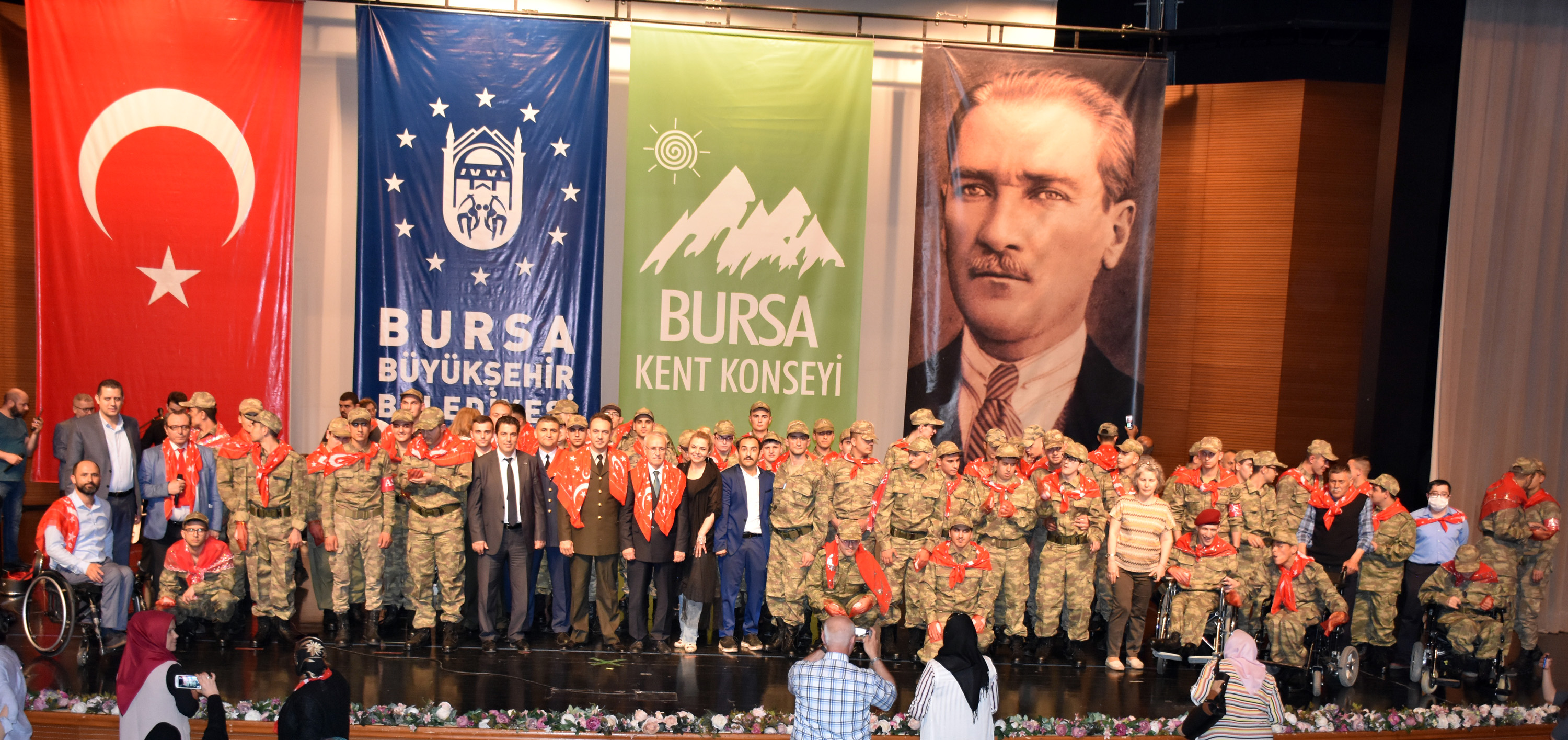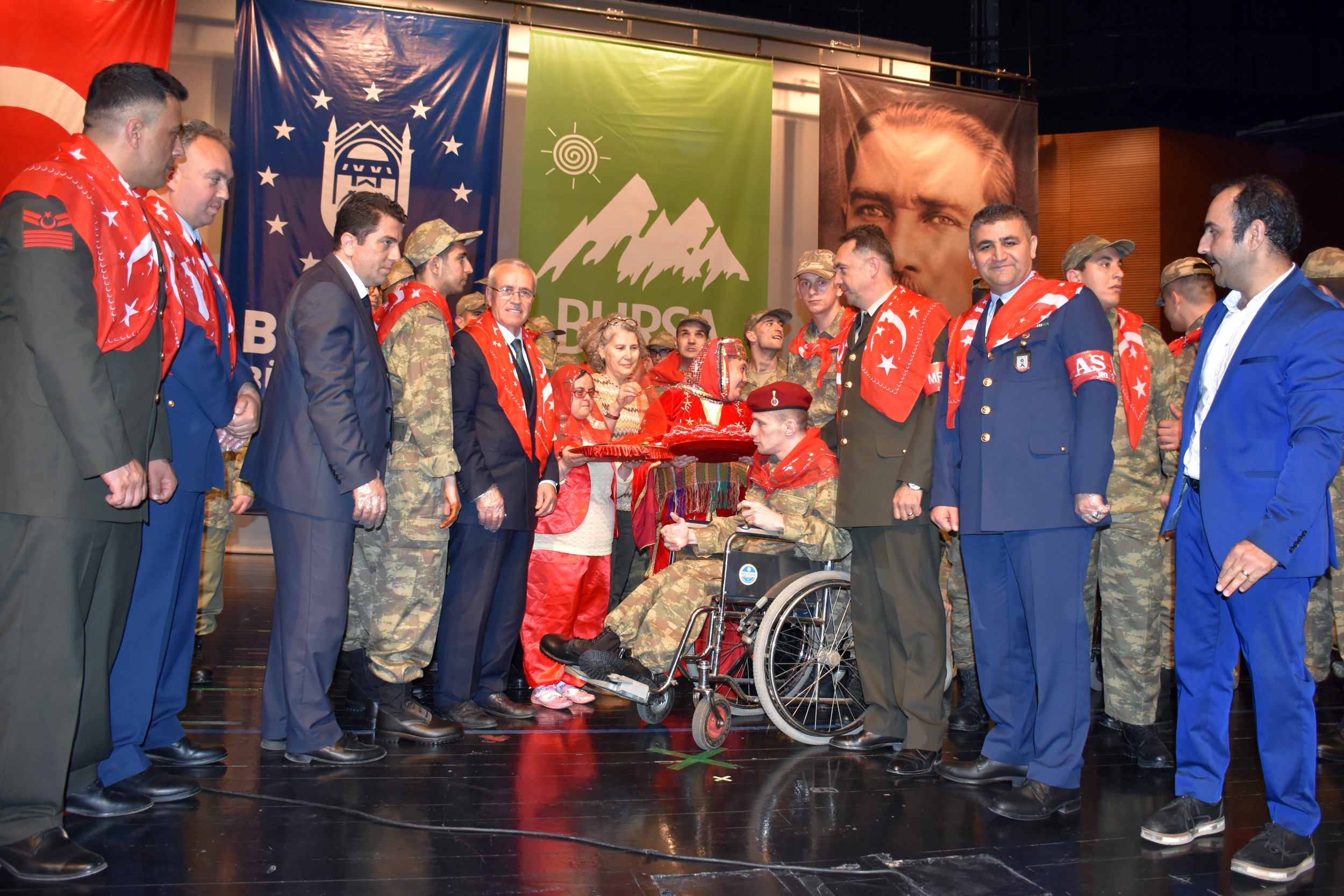 Dev Türk bayrağı açarak salona giren askerler, Bursa Bando takımının marşlarıyla yürüdü. Engelli genç kızların kına tepsilerini taşıdığı yürüyüş, Türk bayrağının dalgalandırılmasıyla sona erdi. Saygı duruşu ve İstiklal Marşı’nın okunduğu programda protokol üyeleri, gençlerin eline kınalar yaktı. Duygusal anlar yaşayan aileler, asker kıyafeti içerisindeki çocuklarıyla bol bol hatıra fotoğrafı çektirdi.