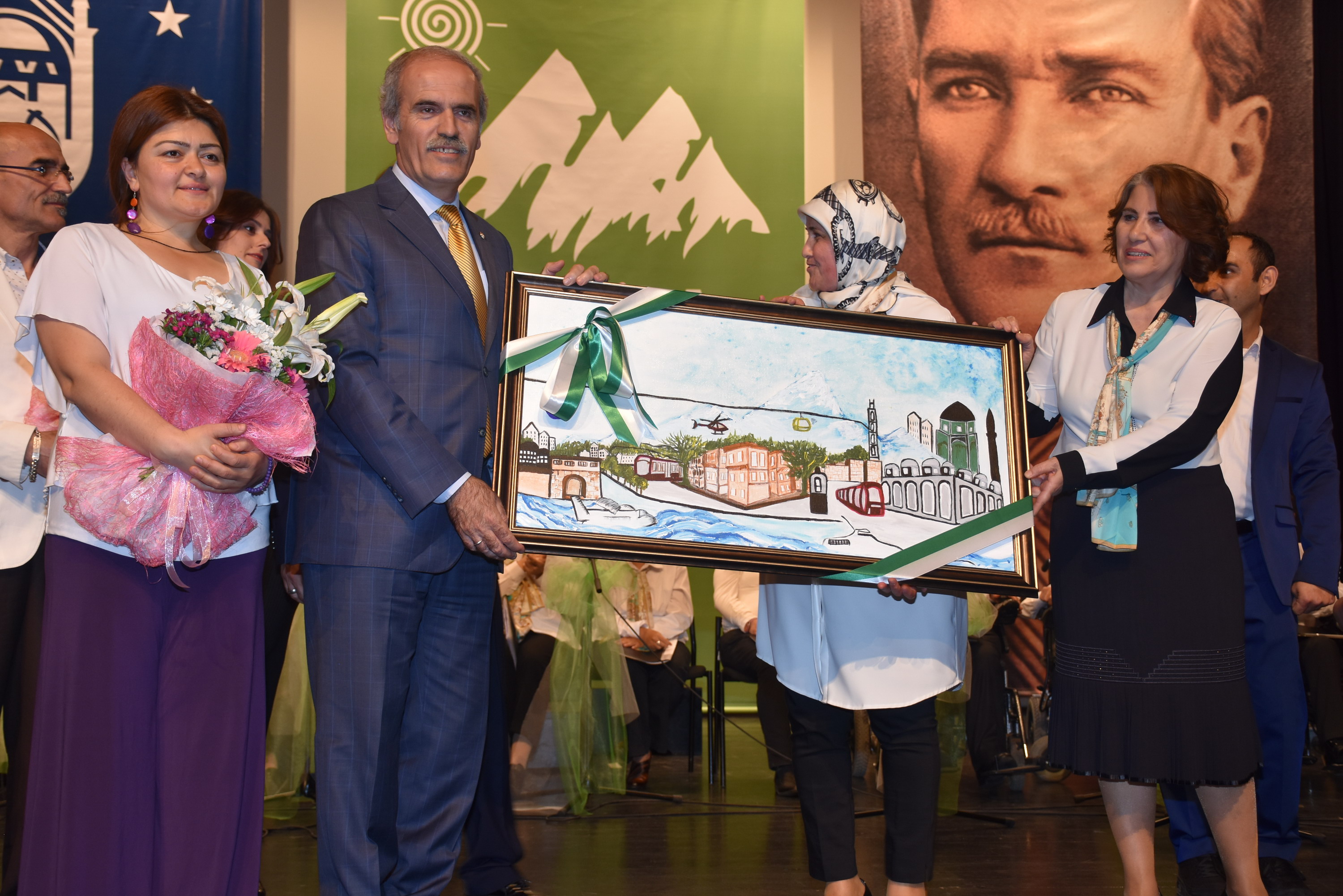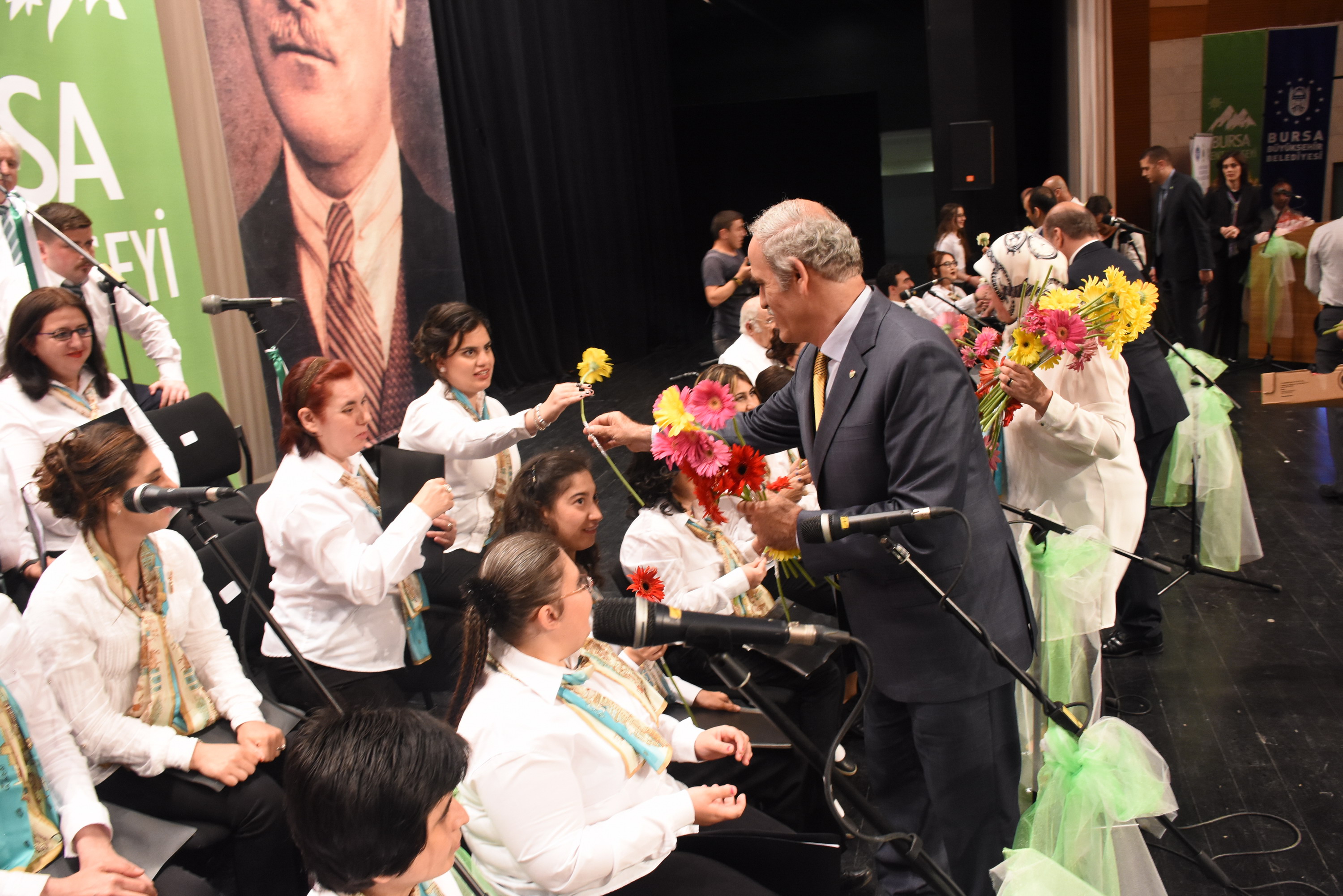Konuşmaların ardından Büyükşehir Belediye Başkanı Recep Altepe ve Bursa Kent Konseyi Başkanı Hasan Çepni tarafından İşaret Dili Eğitmeni Gökçe Çayır’a, Resim Atölyesi Eğitmeni Nurcan Çobantürk’e, Ritim Eğitmeni Cuma Çimen’e ve Koro Şefi Kemal Kamalı’ya çiçek takdim edildi. Başkan Altepe tarafından ayrıca ‘Yılın annesi’ seçilen İlknur Yıldız Başaran’a plaket ve hediyesi verildi. Engelliler Meclisi resim atölyesi tarafından üretilen yağlı boya tablolar ise Başkan Recep Altepe ve Bursa Kent Konseyi Başkanı Hasan Çepni’ye takdim edildi. Daha sonra koroda yer alan engelli bireylere çiçek dağıtan Başkan Recep Altepe ve Hasan Çepni, koroyla birlikte ‘Bursa’nın ufak tefek taşları’ türküsünü söyledi.