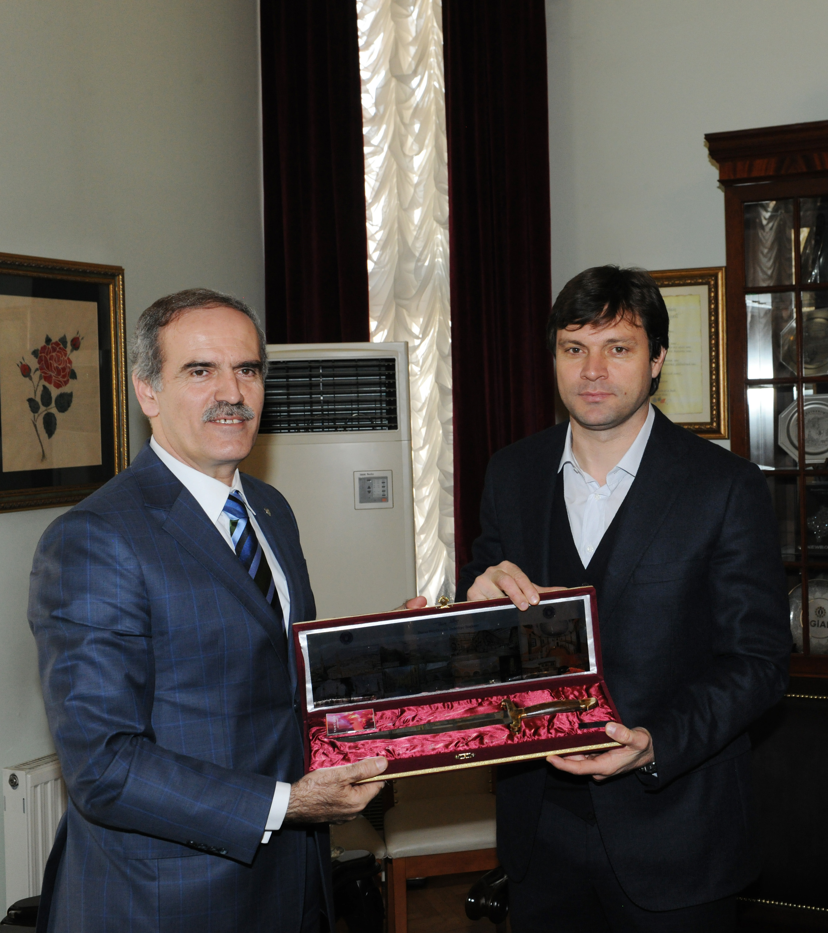 Başkan Altepe, Bursa hatırası olarak Sağlam’a Bursa bıçağı hediye ederken, Bursa Kent Konseyi Başkanı Mehmet Semih Pala da Kent Konseyi flamasını anı olarak Sağlam’a verdi.