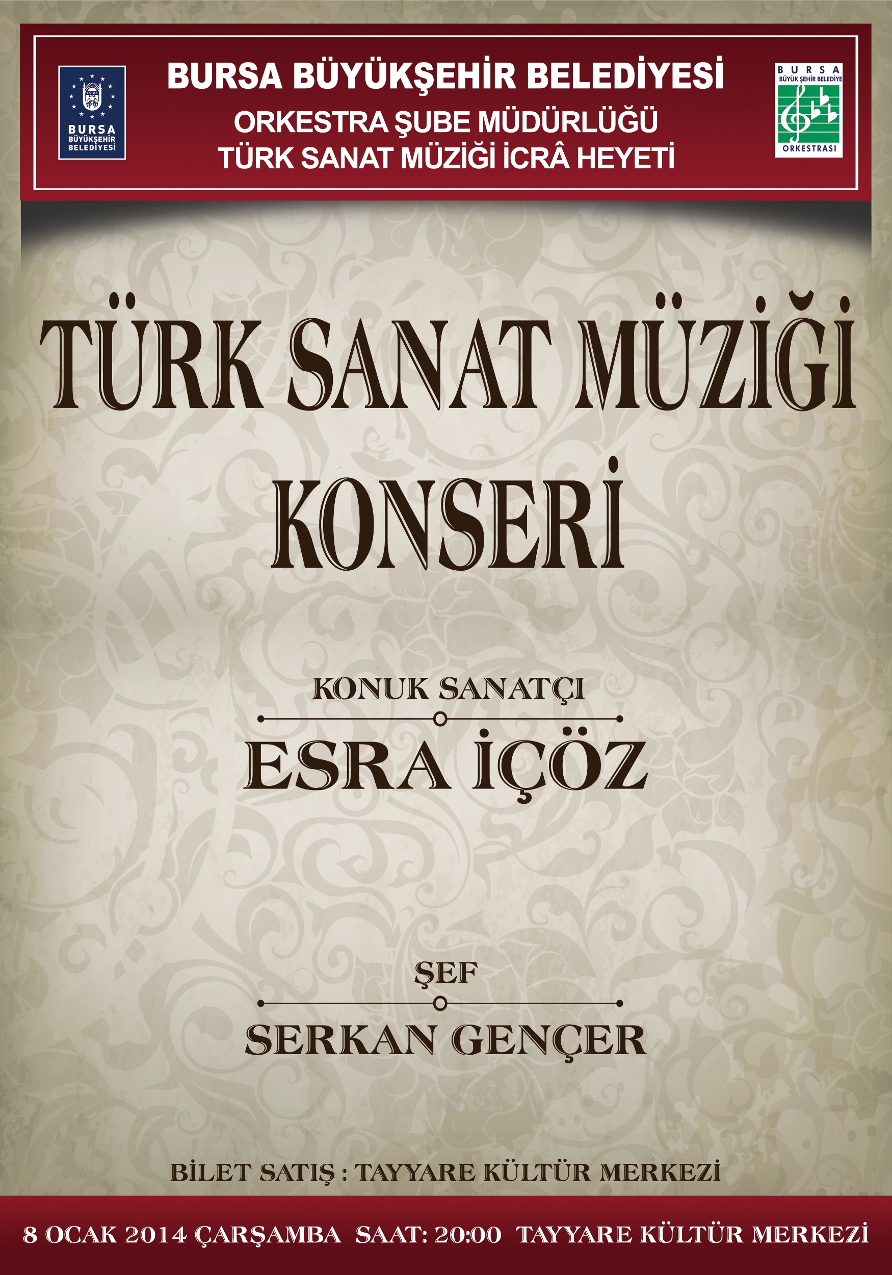 BURSA – Bursa Büyükşehir Belediyesi Orkestrası Türk Sanat Müziği Bölümü’nün Ocak ayı konseri, 8 Ocak Çarşamba günü saat 20.00’de Tayyare Kültür Merkezi’nde gerçekleştirilecektir.