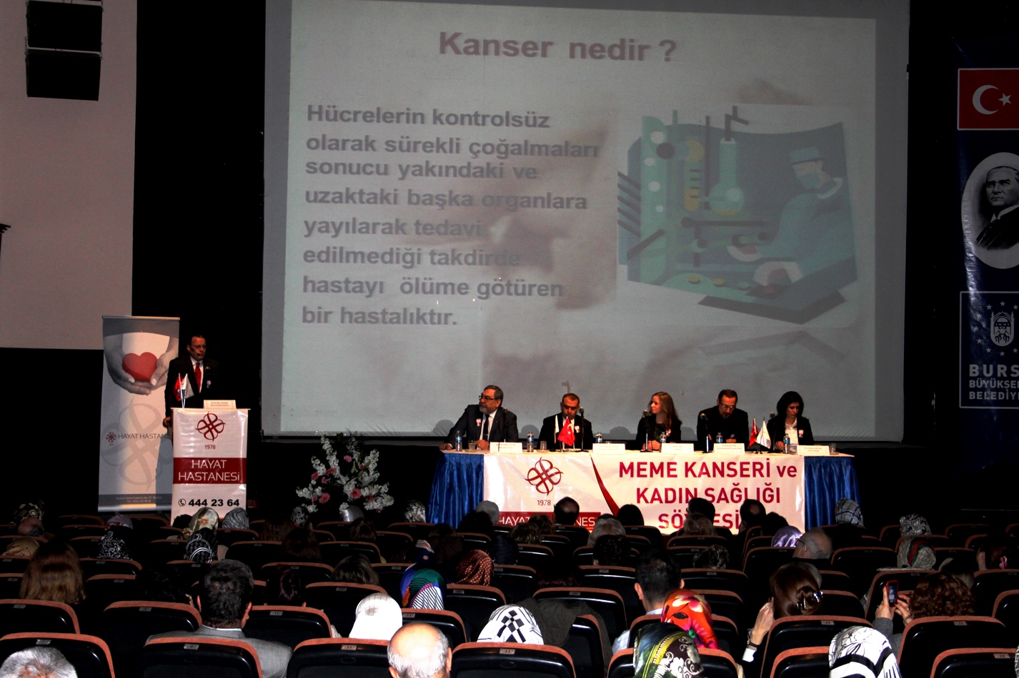 Tıp Bayramı etkinlikleri kapsamında ‘Meme Kanseri ve Kadın Sağlığı’ konulu söyleşi de vatandaşların dikkatini çekti. Tayyare Kültür Merkezi’nde gerçekleştirilen ve Hayat Hastanesi Meme Kliniği Direktörü Op. Dr. Adil Aydemir’in sunum yaptığı söyleşide, Radyoloji Uzmanı Uzm. Dr. Ahmet Öztürk, Plastik Rekonstrüktif Cerrahi Uzmanı Op. Dr. Selçuk Aytaç, Radyasyon Onkoloji Uzmanı Dr. İbrahim Yıldırım, Uzman Psikolog Filiz Yakmaz Basılgan ve Diyetisyen Merve Şanlı da katılımcılara meme kanseri ve kadın sağlığı ile ilgili bilgiler verdi.