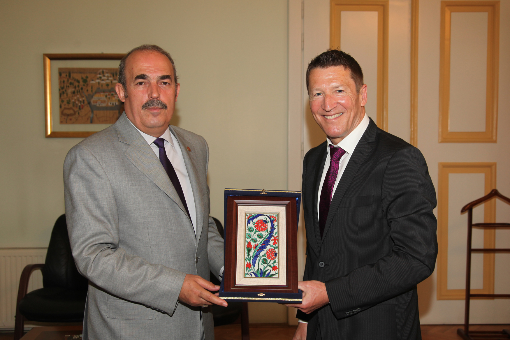 Genel Sekreter Yardımcısı Necmettin Şenocak, ziyaretin anısına misafirine İznik çinili plaket ile Bursa´yı tanıtan hediyeler verdi.