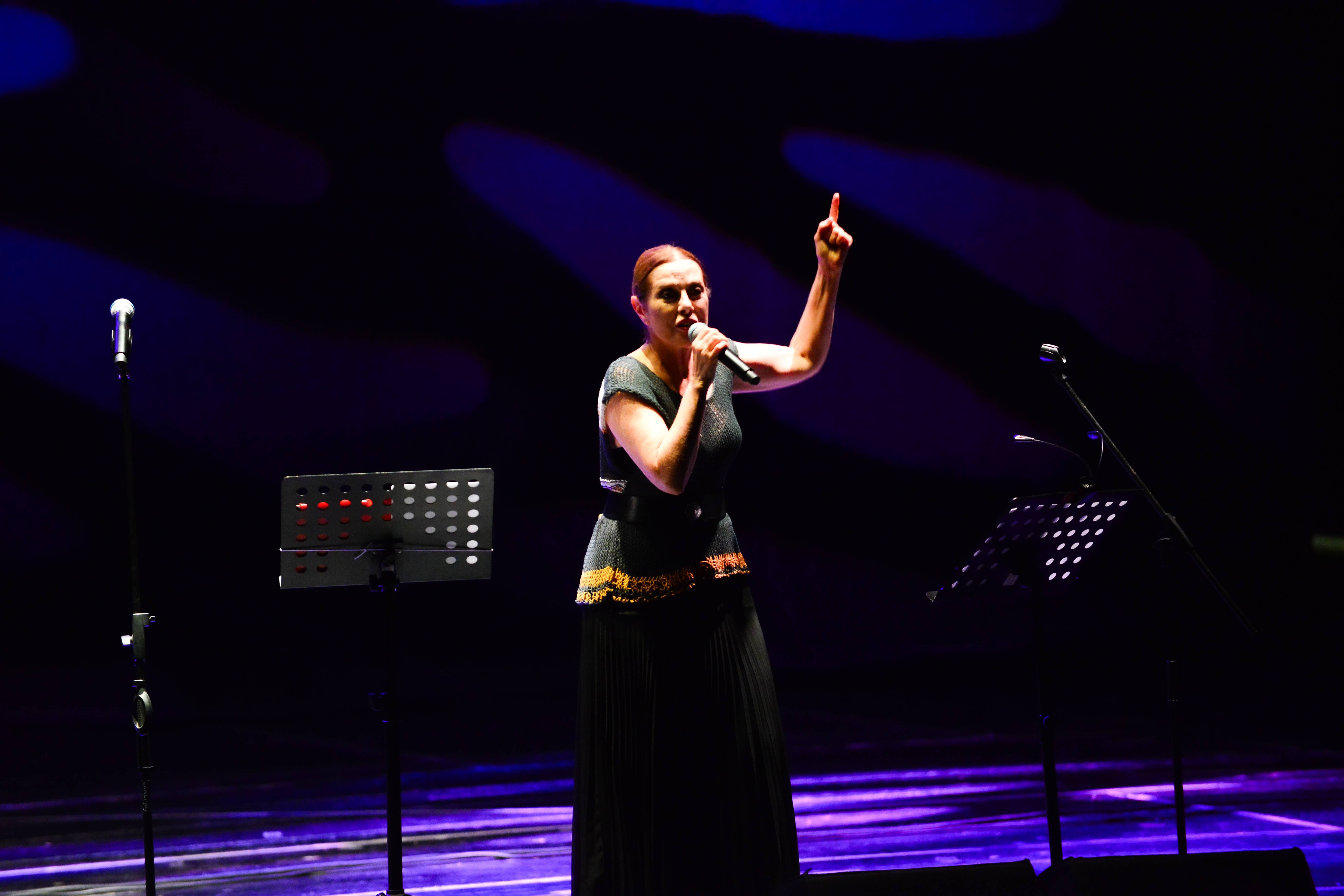Gecede Bursa Kültür Sanat ve Turizm Vakfı (BKSTV) Yönetim Kurulu Üyesi Elif Özhan, sanatçılara teşekkür ederek festival plaketini sundu.