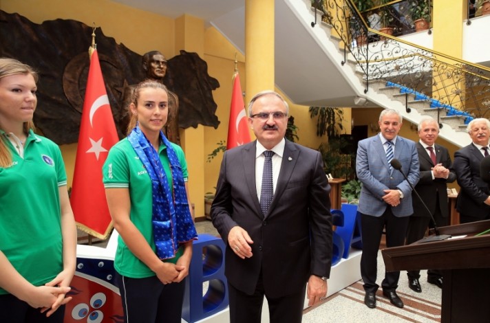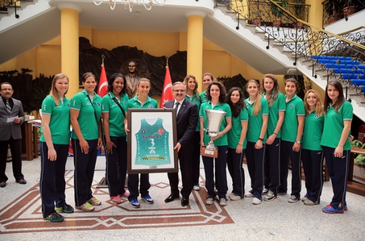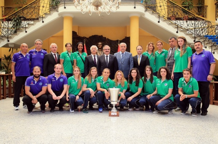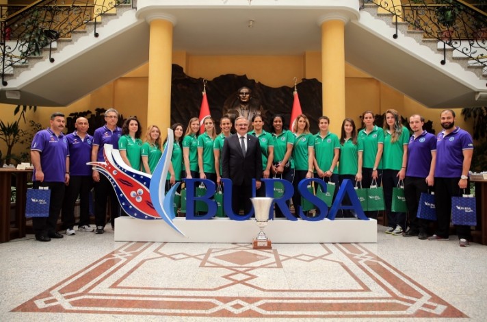 BURSA – Bayanlar CEV Challenge final maçında Uralochka NTMK Ekaterinburg takımını yenerek Avrupa Şampiyonu olan ve aynı zamanda bu yıl ligi 5. sırada tamamlayıp yeniden Avrupa kupalarına katılma hakkı kazanan Bursa Büyükşehir Belediyespor Kulübü Bayan Voleybol Takımı, Bursa Valisi Münir Karaloğlu’nu Tarihi Heykel Valilik binasında ziyaret etti.