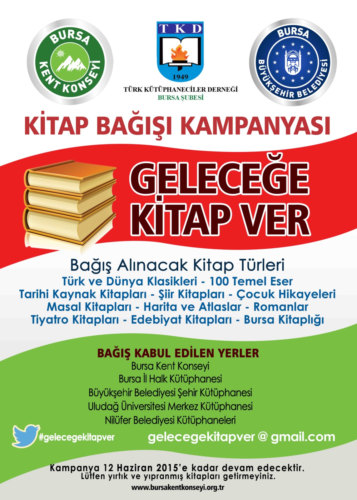 Bursa Kent Konseyi (BKK) ve Türkiye Kütüphaneciler Derneği Bursa Şubesi ortaklığıyla “Geleceğe Kitap Ver” kitap bağışı kampanyası başlatıldı. Bursa İl Halk Kütüphanesi, Büyükşehir Belediyesi Şehir Kütüphanesi, Uludağ Üniversitesi Merkez Kütüphanesi, Nilüfer Belediyesi Kütüphaneleri ve Bursa Kent Konseyi ofislerinde toplanan kitaplar, uzman eğitimciler tarafından tasnif edilecek. Tasnifin ardından köy okulları başta olmak üzere okul kütüphanelerine bağışlanacak.