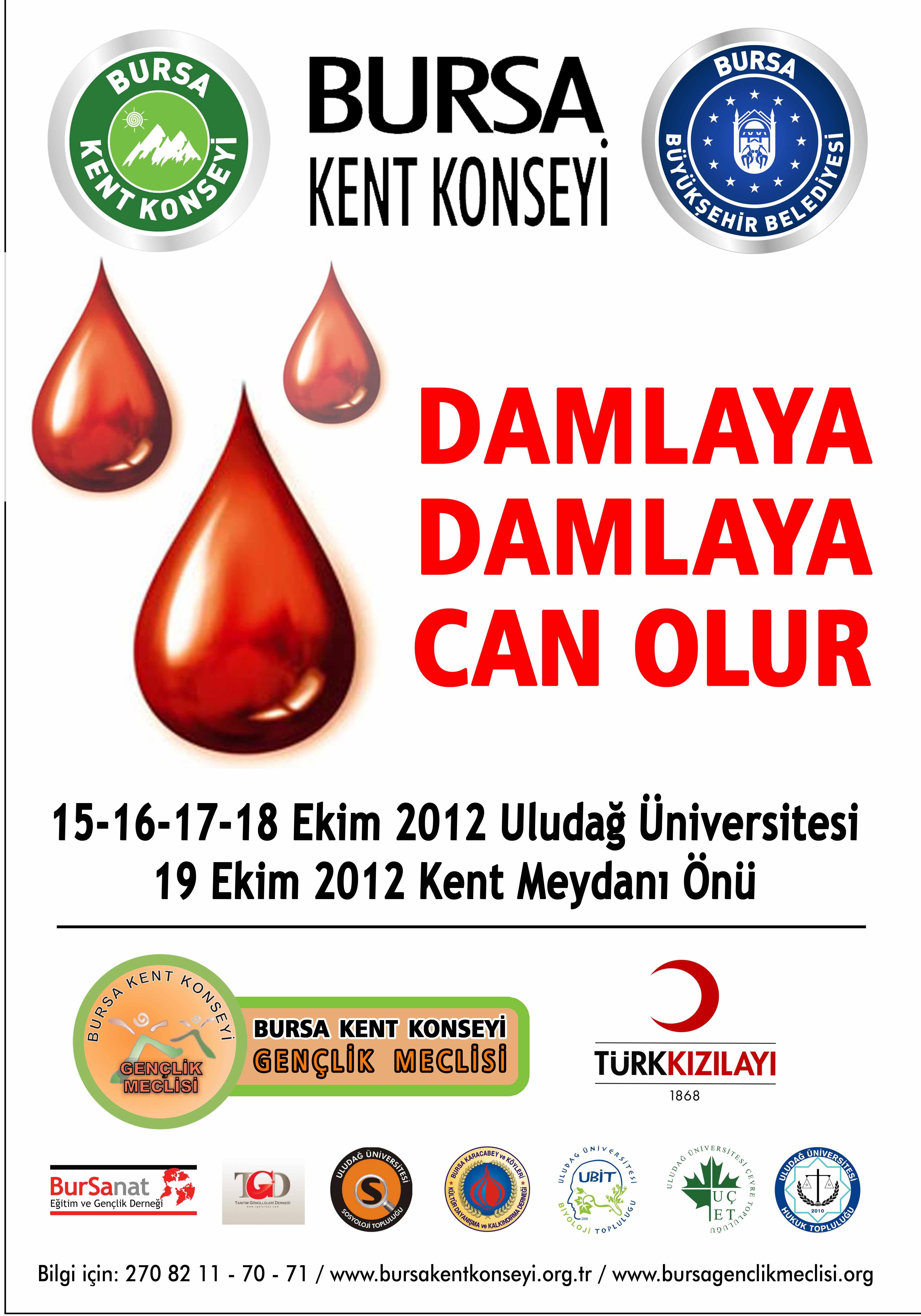 Tek kaynağı insan olan kanın, acil değil sürekli ihtiyaç olduğuna dikkat çekmek amacıyla Bursa Kent Konseyi Gençlik Meclisi ve Türk Kızılayı ortaklığında BurSanat Eğitim ve Gençlik Derneği, Tanıtım Gönüllüleri Derneği, Bursa Karacabeyliler Derneği, Uludağ Üniversitesi Çevre, Hukuk, Sosyoloji ve Uluslararası İlişkiler Toplulukları desteğiyle ‘Damlaya Damlaya Can Olur’ kan bağışı kampanyası düzenleniyor. 15-18 Ekim tarihleri arasında Uludağ Üniversitesi’nde, 19 Ekim tarihinde ise Kent Meydanı’nda açılacak kan toplama noktalarında vatandaşlar bağışında bulunabilecek.