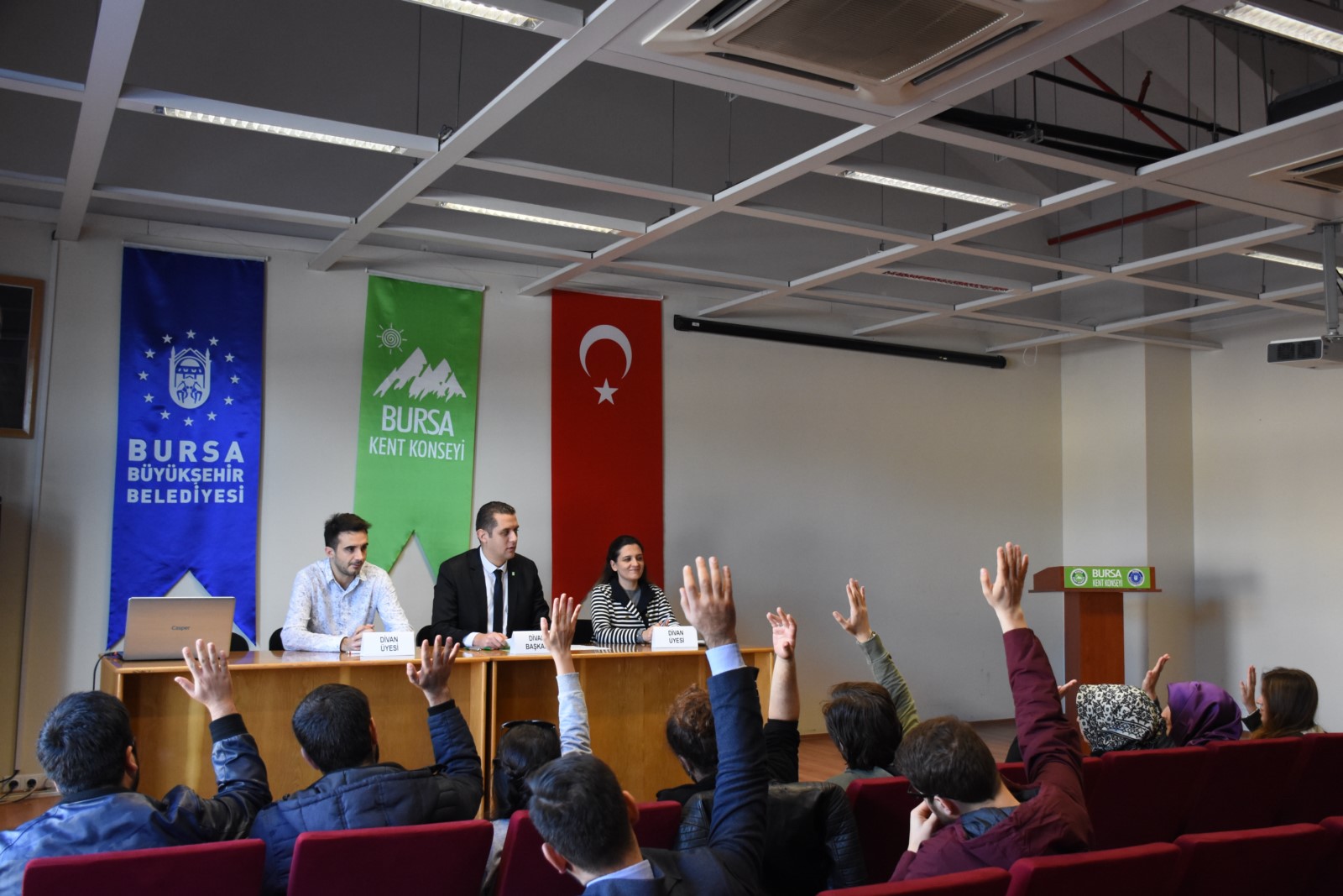 Bursa Kent Konseyi Koza Salonu’nda yapılan saygı duruşu ve İstiklal Marşı’nın okunmasıyla başlayan genel kurulda Divan Kurulu Başkanlığı’na Bursa Kent Konseyi Genel Sekreteri Murat Başlar, Divan Kurulu üyeliklerine ise Hanife Bayram ve Onur Akgün seçildi.