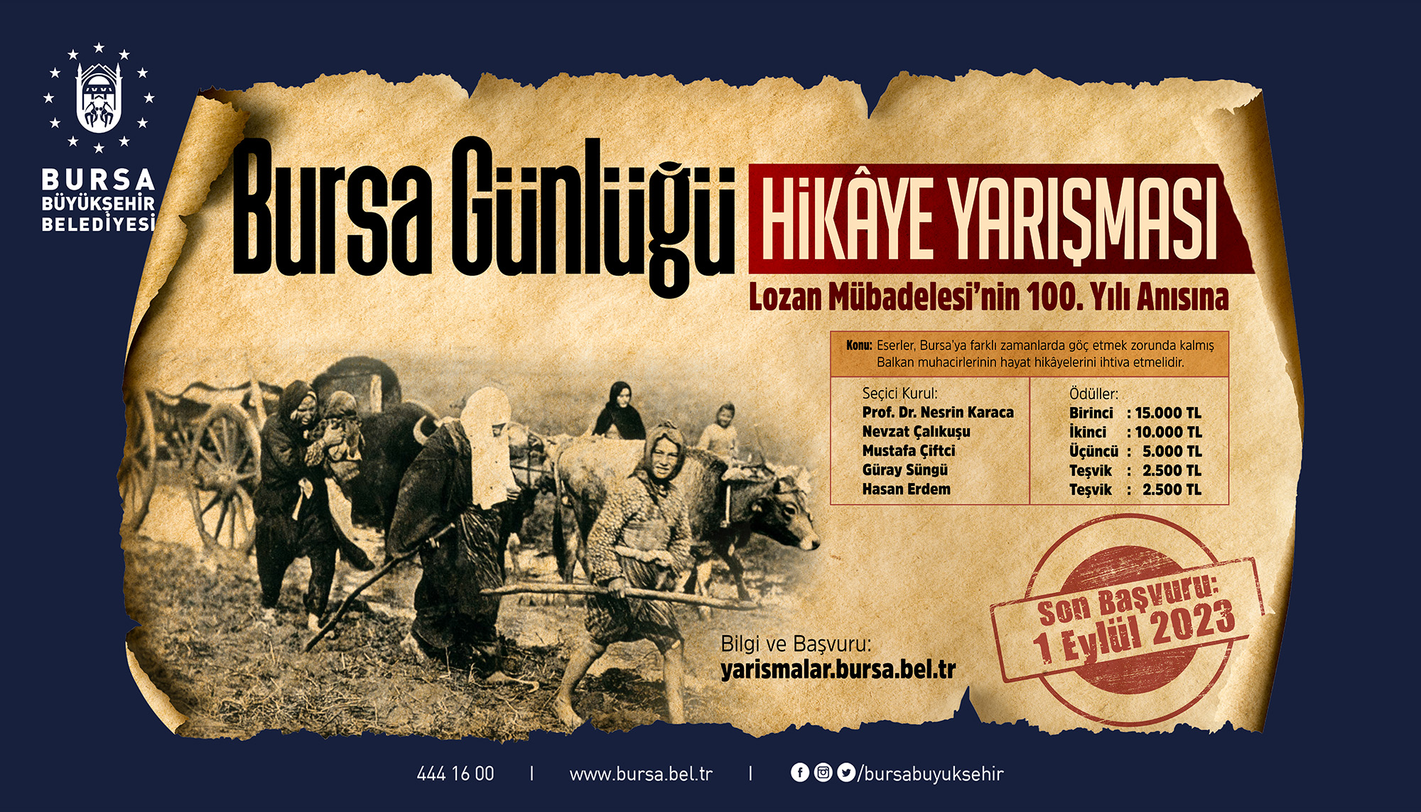 BURSA – Bursa Büyükşehir Belediyesi tarafından Lozan Mübadelesi’nin 100. Yılı Anısı’na ‘Bursa Günlüğü Hikâye Yarışması’ düzenleniyor. Farklı zamanlarda Balkanlardan Bursa’ya göç eden muhacirlerin hikayelerinin ele alınacağı yarışmaya, 1 Eylül 2023 tarihine kadar başvurulabilecek.