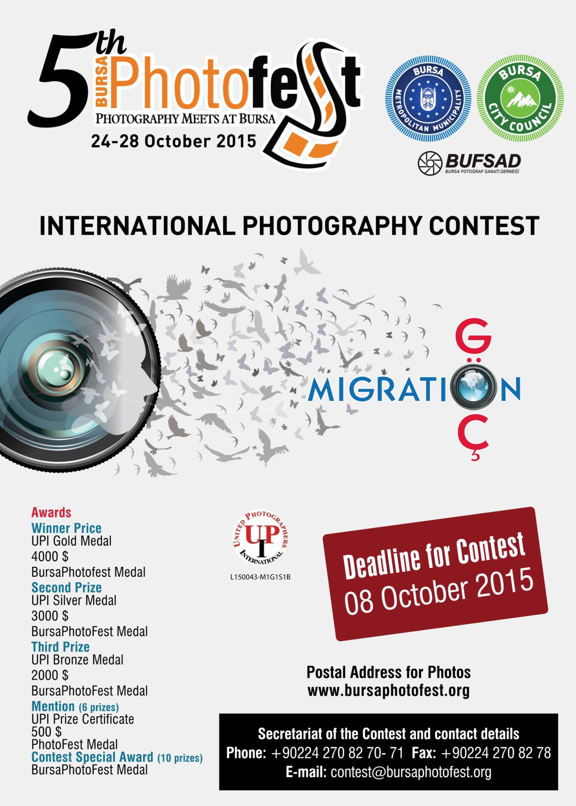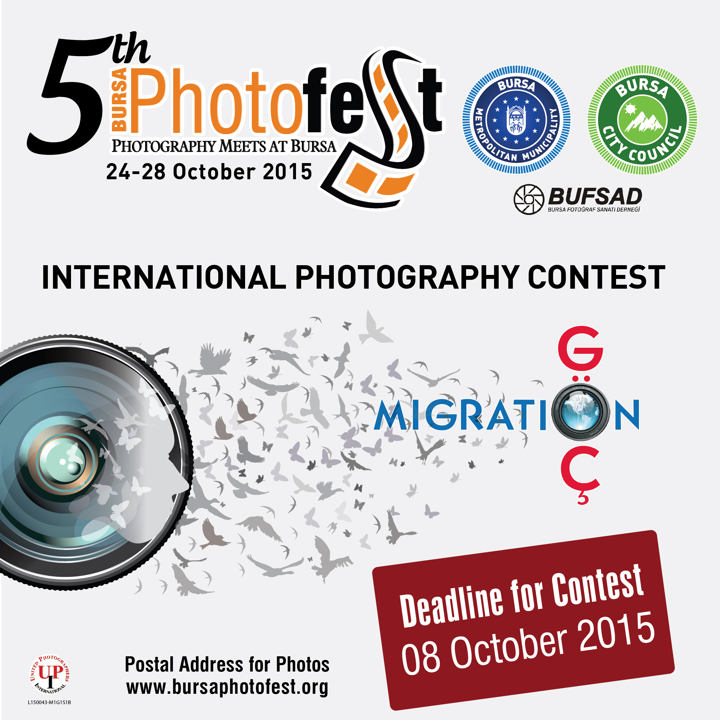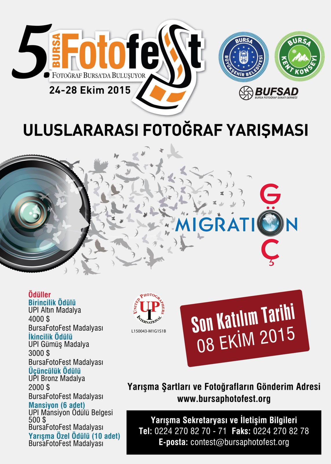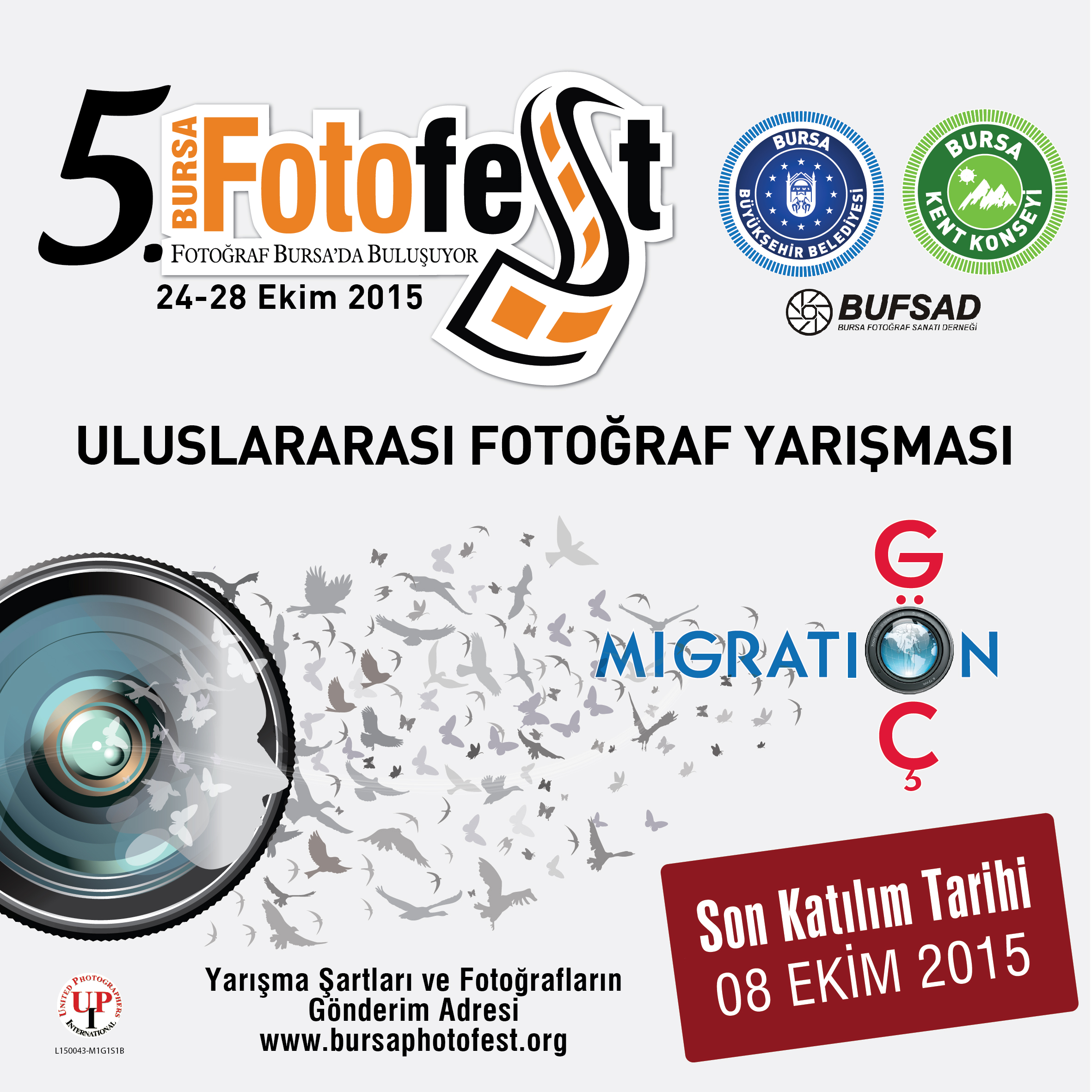Bursa Büyükşehir Belediyesi, Bursa Kent Konseyi (BKK) ve BUFSAD işbirliğiyle bu yıl 5.’si düzenlenecek olan ve küratörlüğünü Kamil Fırat’ın üstlendiği Uluslararası Bursa Fotoğraf Festivali (BursaFotoFest) kapsamında ‘Göç’ temalı fotoğraf yarışması gerçekleştiriliyor. Fotoğraf tutkunlarının www.bursaphotofest.org adresi üzerinden başvurabileceği uluslararası fotoğraf yarışması için son tarih ise 08 Ekim. Katılımcıların en fazla 4 fotoğrafla başvurabileceği yarışmanın jüri üyeliklerini ise İzzet Keribar, Hasan Şenyüksel, Ercan Aslan, Doç. Dr. Ozan Bilgiseren, Neslişah H. Erbey Kuşku, Sibel Emniyet ve Meral Kuru yapıyor. Uluslararası kurallara göre düzenlenen BursaFotoFest yarışmasının patronaj numarası ‘United Photographers International’ (UPI) tarafından veriliyor.