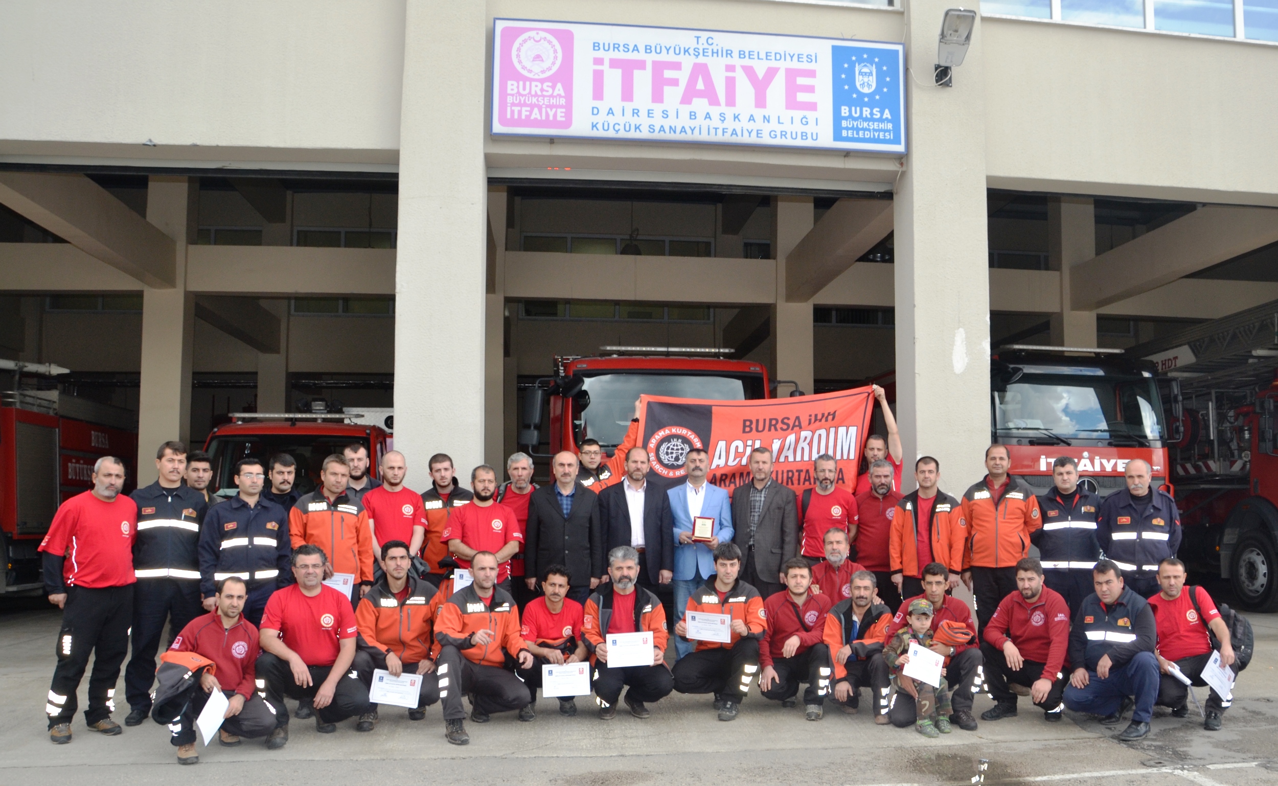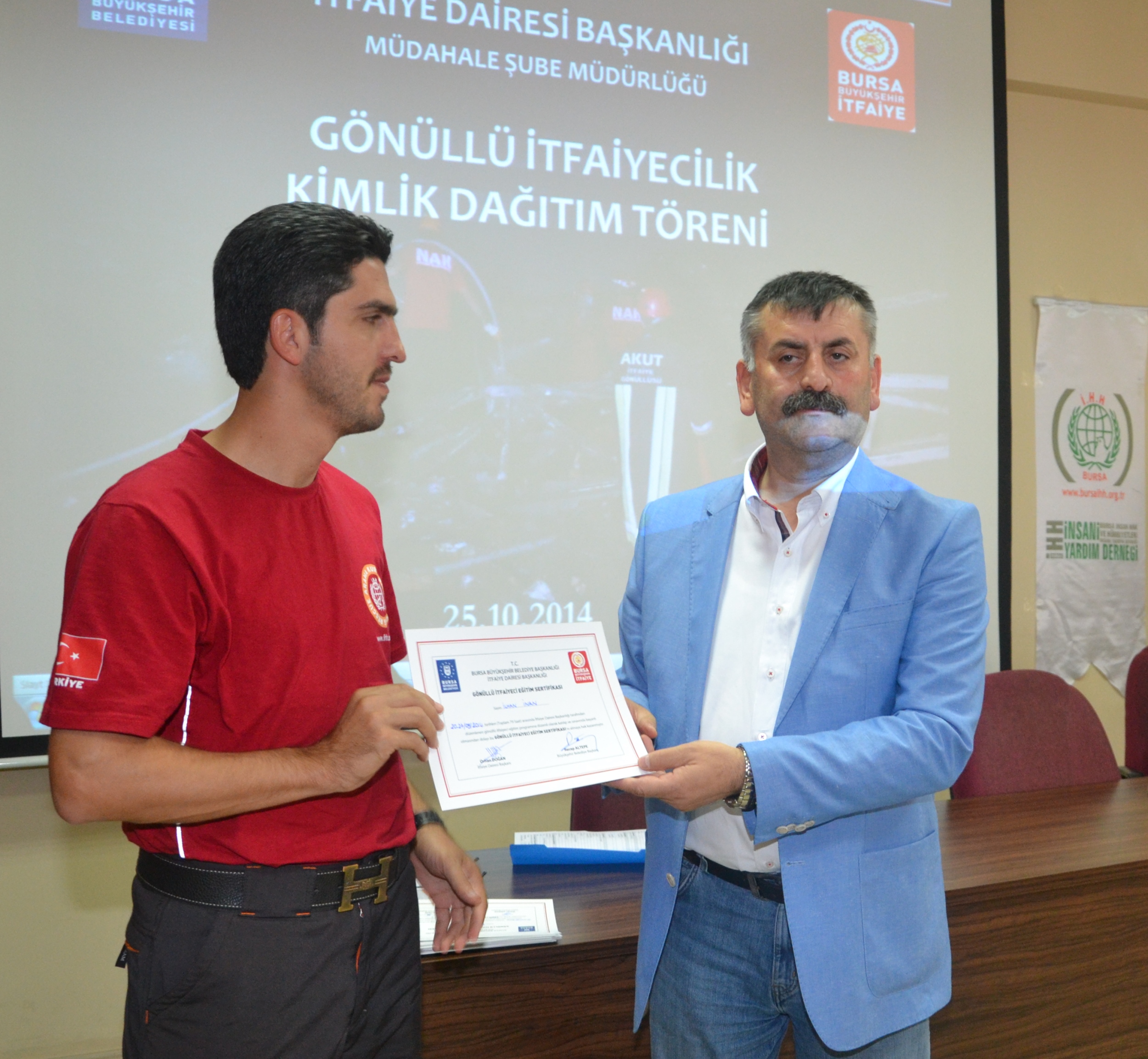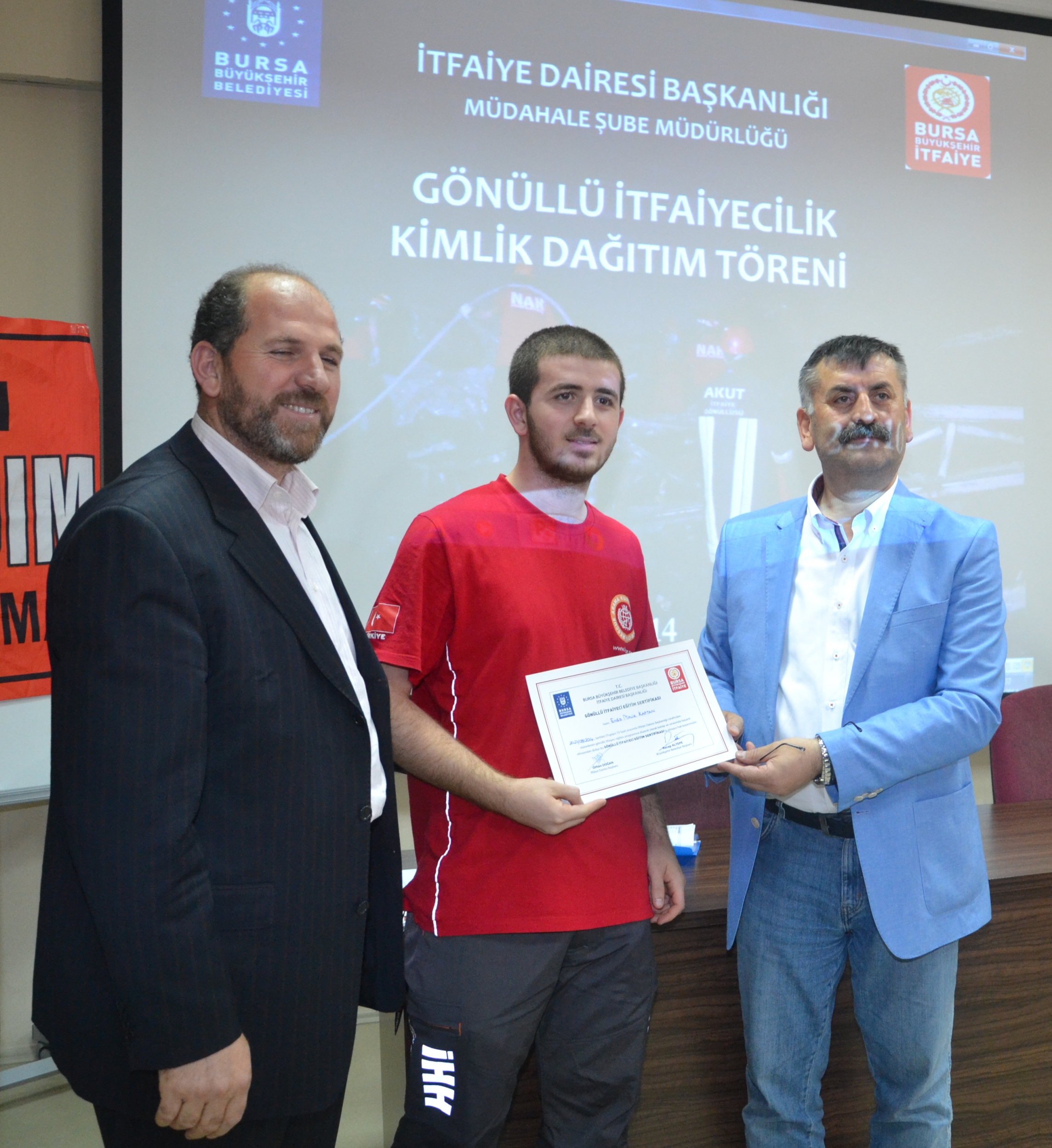 Büyükşehir Belediyesi İtfaiye Dairesi Başkanlığı Küçük Sanayi Eğitim Salonu’nda gerçekleştirilen törende, 36 gönüllü itfaiyeci sertifikalarına kavuştu. Bursa İHH insani yardım derneğinin bünyesinde kurulan acil yardım arama kurtarma ekibinden toplam 36 gönüllü itfaiyeci 79 saatlik eğitimlerini tamamlayıp sertifika almaya hak kazandı. Gönüllü itfaiyecilere sertifikalarını Büyükşehir Belediye Başkanı Recep Altepe adına Büyükşehir Belediyesi İtfaiye Daire Başkanı Orhan Doğan verdi. Doğan, 36 gönüllü itfaiyeci ile toplam gönüllü itfaiyeci sayısının 280’e ulaştığını vurgulayarak, gönüllü itfaiyecilerden zaman zaman büyük yangın ve tatbikatlara katılanların da olduğunu ve özveriyle çalışmalara destek olduklarını söyledi.