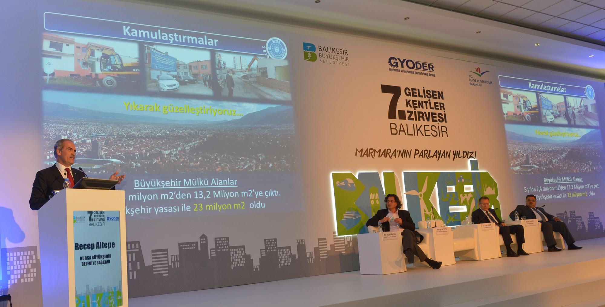 Çevre ve Şehircilik Bakanlığı, Balıkesir Büyükşehir Belediyesi ile Gayrimenkul ve Gayrimenkul Yatırım Ortaklığı Derneği (GYODER) işbirliğinde Balıkesir’de gerçekleştirilen ‘7. Gelişen Kentler Zirvesi’nin birinci oturumunda ‘Güney Marmara Bölgesi’nin Potansiyeli ve Geleceği’ konusu ele alındı.