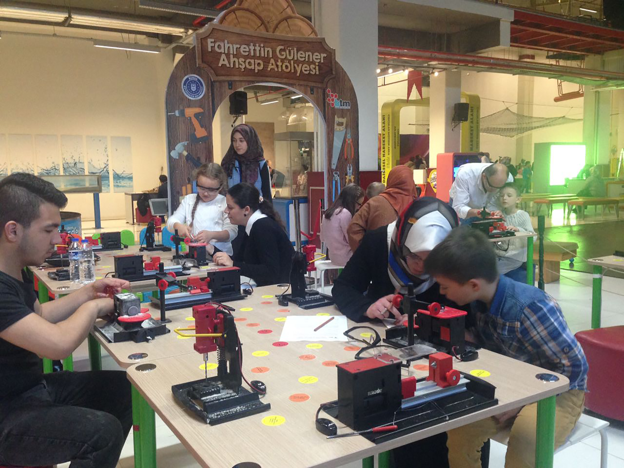 Çocuklara takım ruhunu aşılayan, grup halinde hareket etmesine ve uyum sağlamasına zemin hazırlayan, sosyalleşmesine olanak tanıyan ve zekâ gelişimine yardımcı olan “Minik Mucitler” programı ise 5-6 yaş arası çocuklar için tasarlanan bir başka seanslı atölye programı. Çocuklar, Minik Mucitler alanındaki atölye çalışmaları ile Maket Dinozor, Uzay Lambası, Çizgi Film Makinesi ve Roket Yapımını öğreniyor, yaşama ve doğaya ilişkin birçok bilimsel konu hakkında bilgi sahibi oluyor. Ailelerin çocukları ile birlikte katılım sağladığı bir başka etkinlik Fahrettin Gülener adına açılan ahşap atölyesi… Zaman aralığı seanslarla düzenlenen atölye programına aileleri ile birlikte katılım sağlayan minikler, bazı ahşap makinelerin yardımıyla kendi modellerini üretmekle kalmıyor, ahşap objeler üzerindeki yaratıcılıklarını keşfetme imkânı da buluyor. Bursa Bilim ve Teknoloji Merkezi’nde gerçekleştirilen en renkli programlardan biri de “Maker Etkinliği.” Bu etkinlikte de ebeveynler minik mucitlerle bir şeyi tasarlayarak yapmanın yanı sıra çekişmeli yarışma programlarıyla da bilimin eğlenceli yüzüne tanık oluyor. 300’ün üzerinde deney düzeneği ile çocuklara ve gençlere, okullarda gördükleri teorik bilgileri pratiğe dönüştürme imkânı sağlayan Bursa Bilim ve Teknoloji Merkezi’nde bilimle iç içe nitelikli zaman geçiren aileler ayrıca Devr-i Dinozor ve Altın Çağ’da Bilim sergilerini gezme imkânı da buluyor.